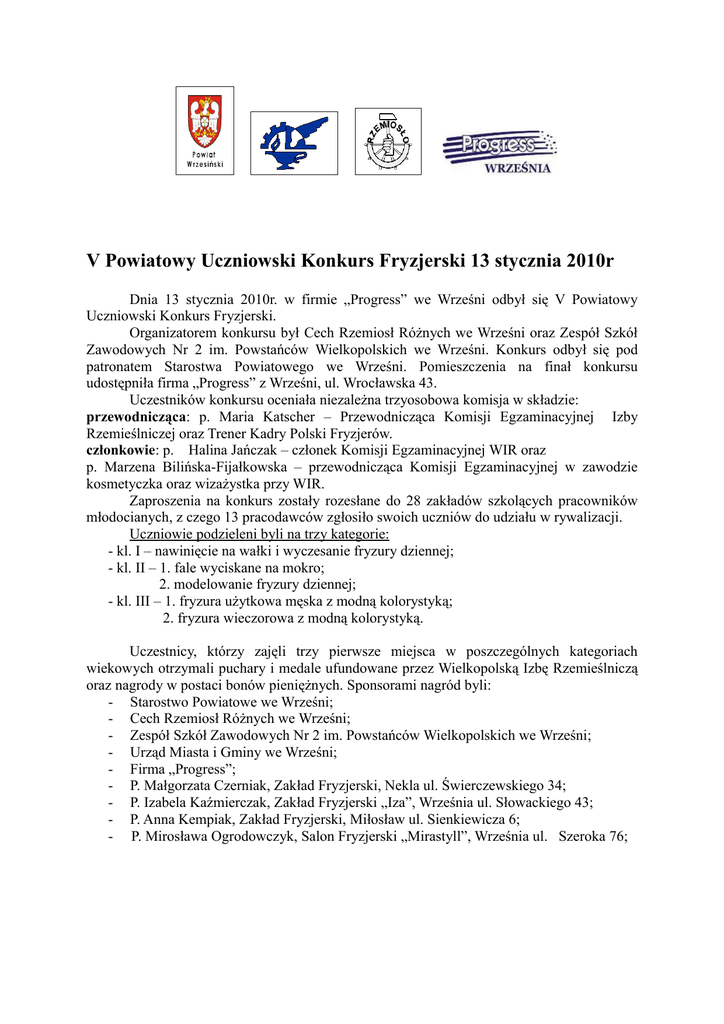 V Powiatowy Uczniowski Konkurs Fryzjerski 13 stycznia 2010r Dnia 13 stycznia 2010r. w firmie „Progress” we Wrześni odbył się V Powiatowy Uczniowski Konkurs Fryzjerski. Organizatorem konkursu był Cech Rzemiosł Różnych we Wrześni oraz Zespół Szkół Zawodowych Nr 2 im. Powstańców Wielkopolskich we Wrześni. Konkurs odbył się pod patronatem Starostwa Powiatowego we Wrześni. Pomieszczenia na finał konkursu udostępniła firma „Progress” z Wrześni, ul. Wrocławska 43. Uczestników konkursu oceniała niezależna trzyosobowa komisja w składzie: przewodnicząca: p. Maria Katscher – Przewodnicząca Komisji Egzaminacyjnej Izby Rzemieślniczej oraz Trener Kadry Polski Fryzjerów. członkowie: p. Halina Jańczak – członek Komisji Egzaminacyjnej WIR oraz p. Marzena Bilińska-Fijałkowska – przewodnicząca Komisji Egzaminacyjnej w zawodzie kosmetyczka oraz wizażystka przy WIR. Zaproszenia na konkurs zostały rozesłane do 28 zakładów szkolących pracowników młodocianych, z czego 13 pracodawców zgłosiło swoich uczniów do udziału w rywalizacji. Uczniowie podzieleni byli na trzy kategorie: - kl. I – nawinięcie na wałki i wyczesanie fryzury dziennej; - kl. II – 1. fale wyciskane na mokro; 2. modelowanie fryzury dziennej; - kl. III – 1. fryzura użytkowa męska z modną kolorystyką; 2. fryzura wieczorowa z modną kolorystyką. Uczestnicy, którzy zajęli trzy pierwsze miejsca w poszczególnych kategoriach wiekowych otrzymali puchary i medale ufundowane przez Wielkopolską Izbę Rzemieślniczą oraz nagrody w postaci bonów pieniężnych. Sponsorami nagród byli: - Starostwo Powiatowe we Wrześni; - Cech Rzemiosł Różnych we Wrześni; - Zespół Szkół Zawodowych Nr 2 im. Powstańców Wielkopolskich we Wrześni; - Urząd Miasta i Gminy we Wrześni; - Firma „Progress”; - P. Małgorzata Czerniak, Zakład Fryzjerski, Nekla ul. Świerczewskiego 34; - P. Izabela Kaźmierczak, Zakład Fryzjerski „Iza”, Września ul. Słowackiego 43; - P. Anna Kempiak, Zakład Fryzjerski, Miłosław ul. Sienkiewicza 6; - P. Mirosława Ogrodowczyk, Salon Fryzjerski „Mirastyll”, Września ul. Szeroka 76; Zwycięzcami konkursu zostali: W kategorii klas I: I miejsce – Patrycja Król kl. I a wz – mistrz szkolący p. Emilia Możdżeń, Salon Fryzjerski „Emilia”, Września ul. Wielkopolska 2; II miejsce – Patrycja Szymańska kl. I a wz - mistrz szkolący p. Monika Antkowiak, Studio Fryzjerskie, Września ul. Ogrodowa 6, III miejsce – Karolina Musielewska kl. I b wz – mistrz szkolący p. Renata Borowicz, Salon Fryzjerski, Września ul. Jana Pawła II 4; W kategorii klas II: I miejsce – Julita Szymkowiak kl. II a wz – mistrz szkolący p. Izabela Kaźmierczak, Zakład Fryzjerski „Iza” Września ul. Słowackiego 43; II miejsce – Radosław Szymaszek kl. II b wz – mistrz szkolący p. Emilia Możdżeń, Salon Fryzjerski „Emilia” Września ul. Wielkopolska 2 III miejsce – Marta Urbaniak kl. II b wz - mistrz szkolący p. Mirosława Ogrodowczyk, Salon Fryzjerski „Mirastyll”, Września ul. Szeroka 76; W kategorii klas III: I miejsce – Julia Gibowska kl. III b wz – mistrz szkolący p. Izabela Kaźmierczak, Zakład Fryzjerski „Iza” Września ul. Słowackiego 43; II miejsce - Milena Klimczak kl. III c wz – mistrz szkolący p. Emilia Możdżeń, Salon Fryzjerski „Emilia” Września ul. Wielkopolska 2; III miejsce – Dagmara Woźniak kl. III c wz – mistrz szkolący p. Mirosława Ogrodowczyk, Salon Fryzjerski „Mirastyll”, Września ul. Szeroka 76; Na zakończenie konkursu sporządzony został protokół, który wraz z kartami ocen członków komisji pozostaje do wglądu u organizatorów konkursu. Organizatorzy konkursu dziękują za wsparcie finansowe. Szczególne podziękowania kierujemy do wszystkich pracodawców, którzy zgłosili uczniów do konkursu, dziękujemy za wspaniałe przygotowanie młodych adeptów sztuki fryzjerskiej. Mamy nadzieję na dalszą współpracę zakładów pracy i szkoły. Serdecznie zapraszamy do kolejnej edycji konkursu. Koordynatorzy: Mariola Musielak Beata Goławska