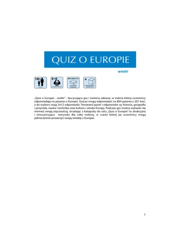 „Quiz o Europie - wielki” - fascynująca gra i świetna zabawa, w trakcie której uczestnicy odpowiadają na pytania o Europie. Gracze mogą odpowiadać na 804 pytania z 201 kart, a do wyboru mają 2412 odpowiedzi. Tematami pytań i odpowiedzi są: historia, geografia i przyroda, nauka i technika oraz kultura i sztuka Europy. Podczas gry można wykazać się również swoją zręcznością, strzelając z katapulty do celu. „Quiz o Europie” to atrakcyjna i emocjonująca rozrywka dla całej rodziny, w czasie której jej uczestnicy mogą jednocześnie poszerzyć swoją wiedzę o Europie. 1
