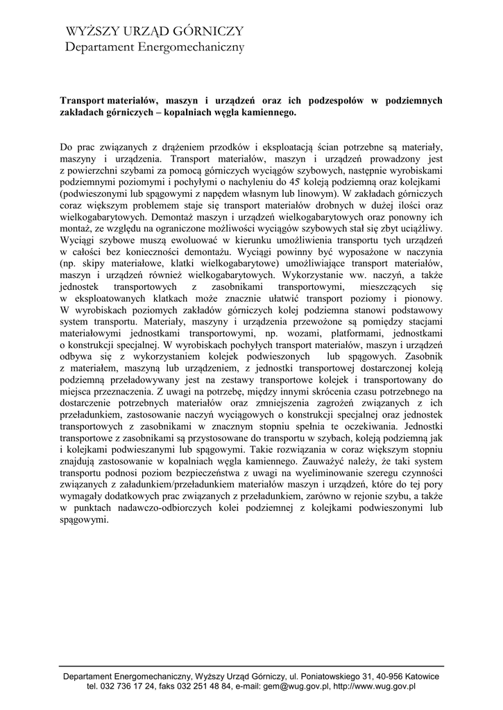 WYŻSZY URZĄD GÓRNICZY Departament Energomechaniczny Transport materiałów, maszyn i urządzeń oraz ich podzespołów w podziemnych zakładach górniczych – kopalniach węgla kamiennego. Do prac związanych z drążeniem przodków i eksploatacją ścian potrzebne są materiały, maszyny i urządzenia. Transport materiałów, maszyn i urządzeń prowadzony jest z powierzchni szybami za pomocą górniczych wyciągów szybowych, następnie wyrobiskami podziemnymi poziomymi i pochyłymi o nachyleniu do 45˚ koleją podziemną oraz kolejkami (podwieszonymi lub spągowymi z napędem własnym lub linowym). W zakładach górniczych coraz większym problemem staje się transport materiałów drobnych w dużej ilości oraz wielkogabarytowych. Demontaż maszyn i urządzeń wielkogabarytowych oraz ponowny ich montaż, ze względu na ograniczone możliwości wyciągów szybowych stał się zbyt uciążliwy. Wyciągi szybowe muszą ewoluować w kierunku umożliwienia transportu tych urządzeń w całości bez konieczności demontażu. Wyciągi powinny być wyposażone w naczynia (np. skipy materiałowe, klatki wielkogabarytowe) umożliwiające transport materiałów, maszyn i urządzeń również wielkogabarytowych. Wykorzystanie ww. naczyń, a także jednostek transportowych z zasobnikami transportowymi, mieszczących się w eksploatowanych klatkach może znacznie ułatwić transport poziomy i pionowy. W wyrobiskach poziomych zakładów górniczych kolej podziemna stanowi podstawowy system transportu. Materiały, maszyny i urządzenia przewożone są pomiędzy stacjami materiałowymi jednostkami transportowymi, np. wozami, platformami, jednostkami o konstrukcji specjalnej. W wyrobiskach pochyłych transport materiałów, maszyn i urządzeń odbywa się z wykorzystaniem kolejek podwieszonych lub spągowych. Zasobnik z materiałem, maszyną lub urządzeniem, z jednostki transportowej dostarczonej koleją podziemną przeładowywany jest na zestawy transportowe kolejek i transportowany do miejsca przeznaczenia. Z uwagi na potrzebę, między innymi skrócenia czasu potrzebnego na dostarczenie potrzebnych materiałów oraz zmniejszenia zagrożeń związanych z ich przeładunkiem, zastosowanie naczyń wyciągowych o konstrukcji specjalnej oraz jednostek transportowych z zasobnikami w znacznym stopniu spełnia te oczekiwania. Jednostki transportowe z zasobnikami są przystosowane do transportu w szybach, koleją podziemną jak i kolejkami podwieszanymi lub spągowymi. Takie rozwiązania w coraz większym stopniu znajdują zastosowanie w kopalniach węgla kamiennego. Zauważyć należy, że taki system transportu podnosi poziom bezpieczeństwa z uwagi na wyeliminowanie szeregu czynności związanych z załadunkiem/przeładunkiem materiałów maszyn i urządzeń, które do tej pory wymagały dodatkowych prac związanych z przeładunkiem, zarówno w rejonie szybu, a także w punktach nadawczo-odbiorczych kolei podziemnej z kolejkami podwieszonymi lub spągowymi. Departament Energomechaniczny, Wyższy Urząd Górniczy, ul. Poniatowskiego 31, 40-956 Katowice tel. 032 736 17 24, faks 032 251 48 84, e-mail: [email protected], http://www.wug.gov.pl