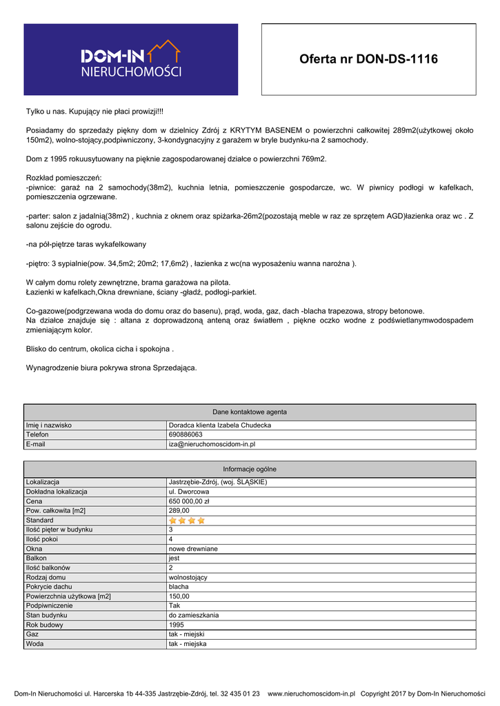 Oferta nr DON-DS-1116 Tylko u nas. Kupujący nie płaci prowizji!!! Posiadamy do sprzedaży piękny dom w dzielnicy Zdrój z KRYTYM BASENEM o powierzchni całkowitej 289m2(użytkowej około 150m2), wolno-stojący,podpiwniczony, 3-kondygnacyjny z garażem w bryle budynku-na 2 samochody. Dom z 1995 rokuusytuowany na pięknie zagospodarowanej działce o powierzchni 769m2. Rozkład pomieszczeń: -piwnice: garaż na 2 samochody(38m2), kuchnia letnia, pomieszczenie gospodarcze, wc. W piwnicy podłogi w kafelkach, pomieszczenia ogrzewane. -parter: salon z jadalnią(38m2) , kuchnia z oknem oraz spiżarka-26m2(pozostają meble w raz ze sprzętem AGD)łazienka oraz wc . Z salonu zejście do ogrodu. -na pół-piętrze taras wykafelkowany -piętro: 3 sypialnie(pow. 34,5m2; 20m2; 17,6m2) , łazienka z wc(na wyposażeniu wanna narożna ). W całym domu rolety zewnętrzne, brama garażowa na pilota. Łazienki w kafelkach,Okna drewniane, ściany -gładź, podłogi-parkiet. Co-gazowe(podgrzewana woda do domu oraz do basenu), prąd, woda, gaz, dach -blacha trapezowa, stropy betonowe. Na działce znajduje się : altana z doprowadzoną anteną oraz światłem , piękne oczko wodne z podświetlanymwodospadem zmieniającym kolor. Blisko do centrum, okolica cicha i spokojna . Wynagrodzenie biura pokrywa strona Sprzedająca. Dane kontaktowe agenta Imię i nazwisko Telefon E-mail Doradca klienta Izabela Chudecka 690886063 [email protected] Informacje ogólne Lokalizacja Dokładna lokalizacja Cena Pow. całkowita [m2] Standard Ilość pięter w budynku Ilość pokoi Okna Balkon Ilość balkonów Rodzaj domu Pokrycie dachu Powierzchnia użytkowa [m2] Podpiwniczenie Stan budynku Rok budowy Gaz Woda Jastrzębie-Zdrój, (woj. ŚLĄSKIE) ul. Dworcowa 650 000,00 zł 289,00 3 4 nowe drewniane jest 2 wolnostojący blacha 150,00 Tak do zamieszkania 1995 tak - miejski tak - miejska Dom-In Nieruchomości ul. Harcerska 1b 44-335 Jastrzębie-Zdrój, tel. 32 435 01 23 www.nieruchomoscidom-in.pl Copyright 2017 by Dom-In Nieruchomości Oferta nr DON-DS-1116 Kanalizacja Prąd Dojazd Ogrzewanie miejska jest asfalt własne gazowe - kocioł 2-funkcyjny Pokój Ściany Podłogi gładzie gipsowe parkiet Kuchnia Typ pomieszczenia Rodzaj kuchni Ściany Podłogi aneks kuchenny - połączony z salonem z zabudową kuchenną glazura terakota Łazienka Typ pomieszczenia Ilość Glazura Ściany osobno z wc 2 nowego typu glazura Przedpokój Ściany Podłogi gładzie gipsowe parkiet Dom-In Nieruchomości ul. Harcerska 1b 44-335 Jastrzębie-Zdrój, tel. 32 435 01 23 www.nieruchomoscidom-in.pl Copyright 2017 by Dom-In Nieruchomości