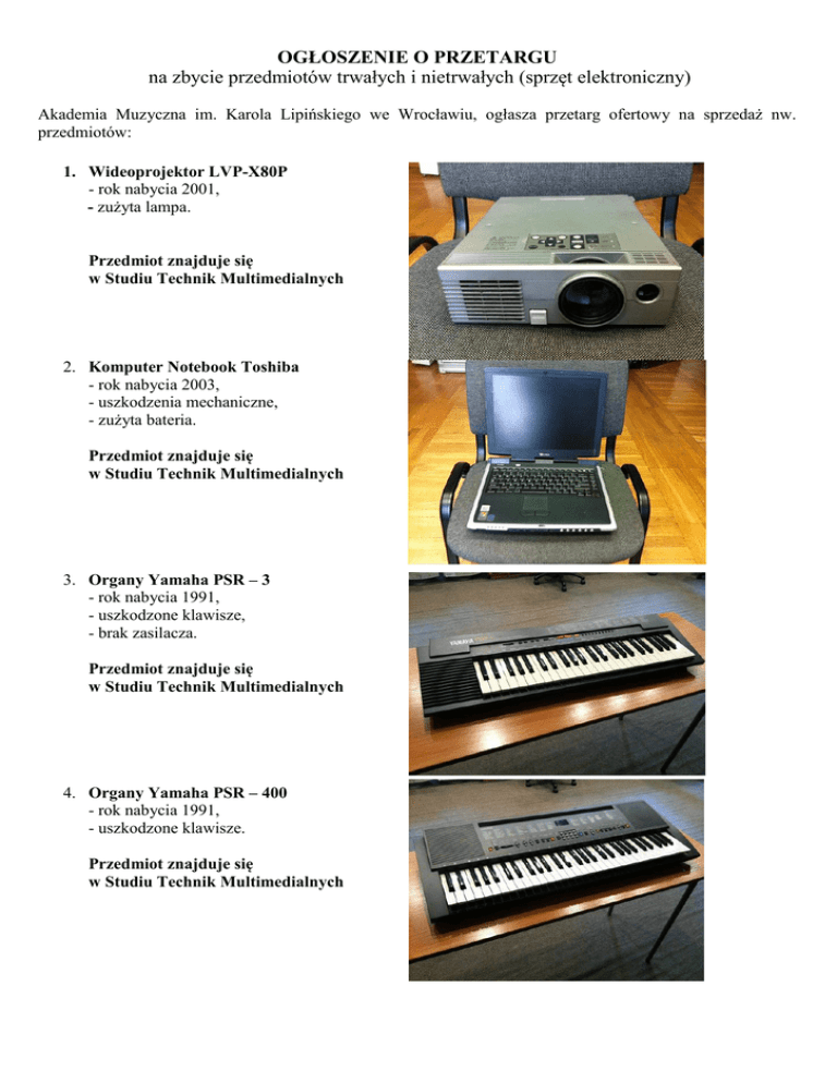 OGŁOSZENIE O PRZETARGU na zbycie przedmiotów trwałych i nietrwałych (sprzęt elektroniczny) Akademia Muzyczna im. Karola Lipińskiego we Wrocławiu, ogłasza przetarg ofertowy na sprzedaż nw. przedmiotów: 1. Wideoprojektor LVP-X80P - rok nabycia 2001, - zużyta lampa. Przedmiot znajduje się w Studiu Technik Multimedialnych 2. Komputer Notebook Toshiba - rok nabycia 2003, - uszkodzenia mechaniczne, - zużyta bateria. Przedmiot znajduje się w Studiu Technik Multimedialnych 3. Organy Yamaha PSR – 3 - rok nabycia 1991, - uszkodzone klawisze, - brak zasilacza. Przedmiot znajduje się w Studiu Technik Multimedialnych 4. Organy Yamaha PSR – 400 - rok nabycia 1991, - uszkodzone klawisze. Przedmiot znajduje się w Studiu Technik Multimedialnych 5. Organy Yamaha PSR – 500 - rok nabycia 1991, - uszkodzone klawisze, - brak zasilacza. Przedmiot znajduje się w Studiu Technik Multimedialnych 6. Magnetofon DAT - rok nabycia 1998, - przestarzała konstrukcja. Przedmiot znajduje się w Studiu Technik Multimedialnych 7. Rzutnik pisma Medium - rok nabycia 1999, - przestarzała konstrukcja. Przedmiot znajduje się w Studiu Technik Multimedialnych 8. Radiomagnetofon FIRST - uszkodzony czytnik CD. Przedmiot znajduje się w Studiu Technik Multimedialnych 9. Radiomagnetofon JVC - uszkodzony czytnik CD. Przedmiot znajduje się w Studiu Technik Multimedialnych 10. Odtwarzacz DVD Philips - wciąga kasety, - przestarzała konstrukcja. Przedmiot znajduje się w Studiu Technik Multimedialnych Oferty należy składać w formie pisemnej w sekretariacie uczelni (Akademia Muzyczna im. Karola Lipińskiego we Wrocławiu, 50-043 Wrocław, pl. Jana Pawła II nr 2, pok. nr 22), za pośrednictwem faxu - 71 355 28 49 lub pocztą elektroniczną - [email protected] w terminie do dnia 3 czerwca 2013 r. do godz.1000. Otwarcie ofert nastąpi w siedzibie Akademii Muzycznej im. Karola Lipińskiego we Wrocławiu w dniu 3 czerwca 2013 r. o godz.1100 . Przedmioty wystawione do sprzedaży można obejrzeć w dniach od do 30 maja 2013 r. w godzinach od 900 do 1400 na terenie uczelni. 21 maja 2013 r. Osoba do kontaktu: Kamil Korzeń Tel. 71 310 05 75. Oferty złożone po terminie nie będą rozpatrywane. W przypadku ofert przysłanych drogą pocztową liczy się data wpływu ofert do Akademii Muzycznej. Koperta zawierająca ofertę przetargową powinna być: zamknięta, nieuszkodzona, oraz posiadać następujące oznakowania: - adres organizatora przetargu, - nazwę i numer przedmiotu przetargu, - nazwę, adres, nr telefonu lub faksu oferenta umożliwiający dalszą korespondencję lub zwrot nieotwartej koperty. Oferta winna spełniać następujące wymogi formalne: - datę sporządzenia oferty, - dokładne oznaczenia nazwy, siedziby oraz statusu prawnego podmiotu składającego ofertę, a w przypadku osób fizycznych imię, nazwisko i adres, - nr telefonu kontaktowego oferenta, - w ofercie powinna być jednoznacznie określona cena zakupu, - dokument wskazujący, że osoba która podpisała ofertę w imieniu oferenta jest upoważniona do jego reprezentacji, - oświadczenie oferenta, że stan faktyczny i prawny przedmiotu sprzedaży jest mu znany i nie wnosi w tym zakresie zastrzeżeń, Jeżeli po otwarciu kopert okaże się, że więcej niż jedna oferta zawiera tą samą cenę, przetarg będzie kontynuowany w tym samym dniu w formie licytacji o czym organizator niezwłocznie poinformuje zainteresowanych. Uczestnicy przetargu zostaną powiadomieni pisemnie o jego wyniku po zamknięciu przetargu w terminie wyznaczonym przez prowadzącego przetarg nie dłuższym niż 14 dni. W przypadku niezapłacenia ceny nabycia w ustalonym terminie lub zapłacenia kwoty niższej niż osiągnięta w przetargu cena nabycia, nabywca traci prawa wynikające z wyboru jego oferty. Zawarcie umowy kupna - sprzedaży nastąpi z chwilą otrzymania przez oferenta zawiadomienia o przyjęciu jego oferty i po zapłaceniu ceny nabycia w terminie 14 dni. Organizator zastrzega sobie prawa do odstąpienia od przeprowadzenia przetargu, do zamknięcia przetargu bez dokonania wyboru oferty oraz do unieważnienia przetargu w części lub całości bez podania przyczyny. Koszty związane ze sprzedażą ponosi nabywca. Wydanie nabywcy przedmiotu sprzedaży nastąpi, niezwłocznie po zapłaceniu ceny nabycia. Wydanie nastąpi w miejscu położenia przedmiotu sprzedaży. Wszelkie informacje na temat sprzętu i przetargu można uzyskać u p. Kamila Korzenia – nr tel. 71 3100575, e-mail: [email protected]