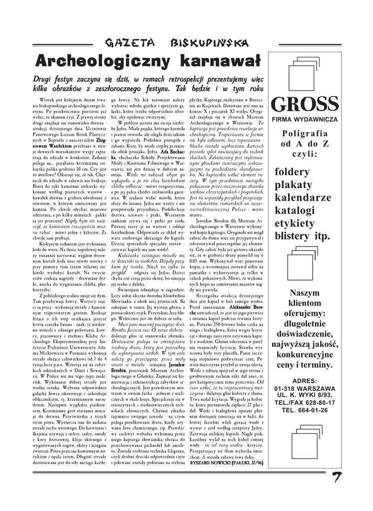Archeologiczny karnawał Drugi festyn zaczyna się dziś, w ramach retrospekcji prezentujemy więc kilka obrazków z zeszłorocznego festynu. T ak będzie i w tym roku Tak Wtorek jest kolejnym dniem trwa− nia biskupińskiego archeologicznego fe− stynu. Po przekroczeniu portierni już widać, że skansen żyje. Z prawej strony drogi znajduje się stanowisko drewna − atrakcji dzisiejszego dnia. Uczniowie Państwowego Liceum Sztuk Plastycz− nych w Supraślu z nauczycielem Zbig− niewem Wasilukiem przebrani w stro− je dawnych mieszkańców wyspy zapra− szają do udziału w konkursie. Zadanie polega na... porąbaniu krzemienną sie− kierką palika grubości 10 cm. Czy jest to możliwe? Okazuje się, że tak. Chęt− nych do udziału w zabawie nie brakuje. Biorą do ręki kamienne siekierki wy− konane według prastarych wzorów − kawałek drewna z grubsza obrobiony z otworem, w którym umocowany jest kamień. Po chwili słychać miarowe uderzenia, a po kilku minutach − paliki są już przecięte! Nigdy bym nie uwie− rzył, że kamieniem rzeczywiście moż− na rąbać − mówi jeden z kibiców. Za chwilę sam próbuje. Kolejnym zadaniem jest wykonanie koła do wozu. Na desce topolowej nale− ży starannie narysować węglem drzew− nym kształt koła oraz otwór osiowy i przy pomocy tym razem żelaznej sie− kierki wydobyć kształt. Na zwycię− zców czekają nagrody − drewniane łyż− ki, niecka do wygniatania chleba, płas− korzeźby. Z pobliskiego szałasu snuje się dym. Tam przebywają łowcy. Wszyscy zaję− ci są pracą − wykonują strzały z kamien− nym trapezowatym grotem. Szokuje leżąca u ich stóp ociekająca jeszcze krwią czaszka barana − znak, iż niedaw− no wrócili z udanego polowania. Łow− cy, pracownicy i studenci Klubu Ar− cheologii Eksperymentalnej przy Ins− tytucie Prahistorii Uniwersytetu Ada− ma Mickiewicza w Poznaniu wykonują strzały służące człowiekowi od 7 do 4 tysiąclecia p.n.e. Wzorują się na zabyt− kach odszukanych w Danii i Szwajca− rii. W Polsce nie ma tego typu znale− zisk. Wykonanie dobrej strzały jest trudną sztuką. Wybraną odpowiednio gałązkę łowca okorowuje i oskrobuje obłęcznikiem, tj. krzemiennym narzę− dziem. Następnie wygładza piaskow− cem. Krzemienny grot starannie mocu− je do drewna. Przytwierdza z trzech stron pióra. Wystarczą one do nadania strzale ruchu wirowego. Do barwienia i lkejenia używają z ochry, sadzy, smoły z kory brzozowej, kleju skórnego z wygotowanych rogów, skóry i ścięgien zwierząt. Pióra przecina kamiennym no− żykiem i opala żarem. Długość strzały dostosowana jest do siły naciągu każde− go łowcy. Na łuk natomiast należy wybierac młode, giętkie i sprężyste ga− łązki, które trzeba odpowiednio obro− bić, aby upolować zwierzynę. W pobliżu jeziora ma swoją siedzi− bę Jędza. Miała pająka, którego karmiła i prawie oswoiła, ale uległa dzieciakom i go wypuściła. Podobnie postąpiła z żabami. Kurę, by miała cieplej przenio− sła obok prosiaka. Jędza, Ada Sochac− ka ka, słuchaczka Szkoły Projektowania Mody i Kostiumu Filmowego w War− szawie, nie jest dzisiaj w dobrym na− stroju. Wódz mi nakazał, abym go wykąpała, a ja nie chcę łaziebnikom chleba odbierać − mówi rozgoryczona, a po jej palcu chodzi zieloniutka gąsie− nica. W szałasie widać miotłę, która służy do latania. Jędza nie wróży i nie przepowiada przyszłości. Podsłuchuje drzewa, szuwary i ptaki. Wczesnym rankiem zrywa się i pędzi po zioła. Później suszy je na wietrze i oddaje łaziebnikom. Odpowiada za skład wy− waru ziołowego służącego do kąpieli. Dzisiaj sporządziła specjalny zestaw − zażywać kąpieli ma sam wódz!. Koleżanka świniopas mówiła mi, że dzieciaki są niedobre. Dźgały paty− kiem jej świnkę. Niech no tylko tu przyjdą! − odgraża się Jędza. Dzieci chyba coś czują przez skórę, bo omijają jej szałas z daleka. Świniopasa odnajduję w zagrodzie. Leży sobie śliczna dorodna blondwłosa Słowianka, a obok niej prosiaczek. Są zakopani w sianie. Jej wystaje głowa, a prosiaczkowi ryjek. Przytuleni, leżą bło− go. Widocznie jest im dobrze ze sobą. Musi pani mocniej pociągnąć drut. Śmiało. Jeszcze raz. O, teraz dobrze − dolatuje głos ze stanowiska złotnika. Drutowanie polega na zmniejszeniu średnicy drutu, który jest potrzebny do wykonywania ozdób. W tym celu należy go przeciągnąć przez mały otwór w metalu − oznajmia Jarosław Strobin Strobin, pracownik Muzeum Archeo− logicznego w Gdańsku. Zajmuje się ko− nserwacją i rekonstrukcją zabytków ar− cheologicznych. Jest prawdziwym mis− trzem w swoim fachu − jednym z nieli− cznych w skali kraju. Specjalizuje się w starożytnych i średniowiecznych tech− nikach złotniczych. Chętnie zdradza tajemnice swojego zawodu − na czym polega perełkowanie drutu, kiedy uży− wano lutu chemicznego, itp. Prawdzi− wy zachwyt wzbudza wykonana przez niego kaptorga słowiańska, służąca do przechowywania pachnideł lub amule− tu. Została zrobiona techniką filigranu, czyli drobne druciki odpowiednio cięte i piłowane zostały położone na srebrną płytkę. Kaptorgę znaleziono w Boruci− nie na Kujawach. Datowana jest ona na koniec X i początek XI wieku. Orygi− nał znajduje się w zbiorach Muzeum Archeologicznego w Warszawie. Ta kaptorga jest prawdziwą rewelacją ar− cheologiczną. Trapezowata w formie nie była odlewem, lecz repusowana − blacha została wytłoczona. Łańcuch posiada splot nawiązujący do technik tkackich. Zakończony jest stylizowa− nymi główkami zwierzęcymi, wskazu− jącymi na pochodzenie skandynaws− kie. Na kaptordze widać element ro− zety. W tym przedmiocie nastąpiło połączenie przez ówczesnego złotnika wątków chrześcijańskich i pogańskich. Jest to wspaniały przykład przyswaja− nia elementów romańskich we wczes