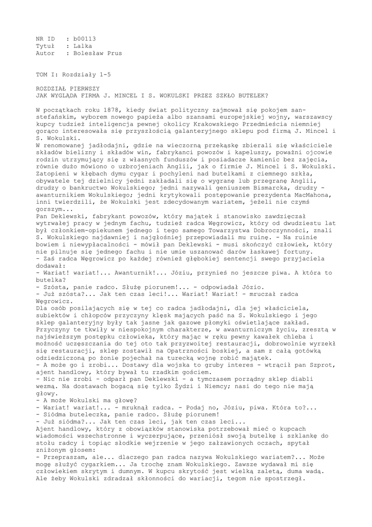 NR ID : b00113 Tytuł : Lalka Autor : Bolesław Prus TOM I: Rozdziały