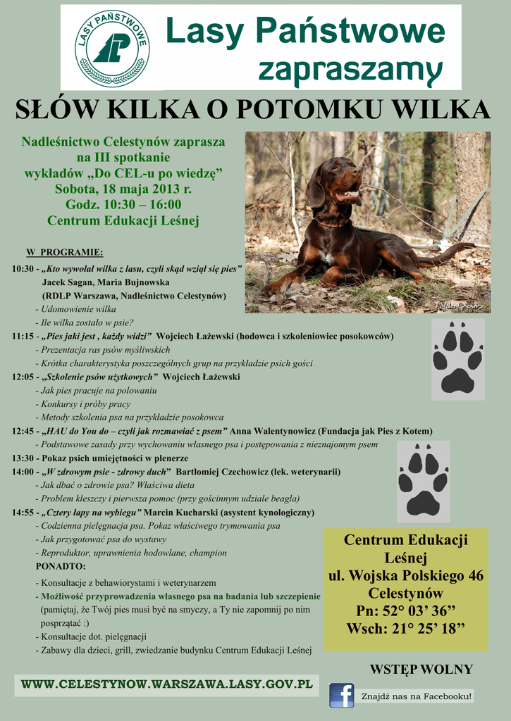 SŁÓW KILKA O POTOMKU WILKA Nadleśnictwo Celestynów zaprasza na III spotkanie wykładów „Do CEL-u po wiedzę” Sobota, 18 maja 2013 r. Godz. 10:30 – 16:00 Centrum Edukacji Leśnej W PROGRAMIE: 10:30 - „Kto wywołał wilka z lasu, czyli skąd wziął się pies” Jacek Sagan, Maria Bujnowska (RDLP Warszawa, Nadleśnictwo Celestynów) - Udomowienie wilka - Ile wilka zostało w psie? 11:15 - „Pies jaki jest , każdy widzi” Wojciech Łażewski (hodowca i szkoleniowiec posokowców) - Prezentacja ras psów myśliwskich - Krótka charakterystyka poszczególnych grup na przykładzie psich gości 12:05 - „Szkolenie psów użytkowych” Wojciech Łażewski - Jak pies pracuje na polowaniu - Konkursy i próby pracy - Metody szkolenia psa na przykładzie posokowca 12:45 - „HAU do You do – czyli jak rozmawiać z psem” Anna Walentynowicz (Fundacja jak Pies z Kotem) - Podstawowe zasady przy wychowaniu własnego psa i postępowania z nieznajomym psem 13:30 - Pokaz psich umiejętności w plenerze 14:00 - „W zdrowym psie - zdrowy duch” Bartłomiej Czechowicz (lek. weterynarii) - Jak dbać o zdrowie psa? Właściwa dieta - Problem kleszczy i pierwsza pomoc (przy gościnnym udziale beagla) 14:55 - „Cztery łapy na wybiegu” Marcin Kucharski (asystent kynologiczny) - Codzienna pielęgnacja psa. Pokaz właściwego trymowania psa - Jak przygotować psa do wystawy - Reproduktor, uprawnienia hodowlane, champion PONADTO: - Konsultacje z behawiorystami i weterynarzem - Możliwość przyprowadzenia własnego psa na badania lub szczepienie (pamiętaj, że Twój pies musi być na smyczy, a Ty nie zapomnij po nim posprzątać :) - Konsultacje dot. pielęgnacji - Zabawy dla dzieci, grill, zwiedzanie budynku Centrum Edukacji Leśnej Centrum Edukacji Leśnej ul. Wojska Polskiego 46 Celestynów Pn: 52° 03’ 36’’ Wsch: 21° 25’ 18’’ WSTĘP WOLNY WWW.CELESTYNOW.WARSZAWA.LASY.GOV.PL Znajdź nas na Facebooku!