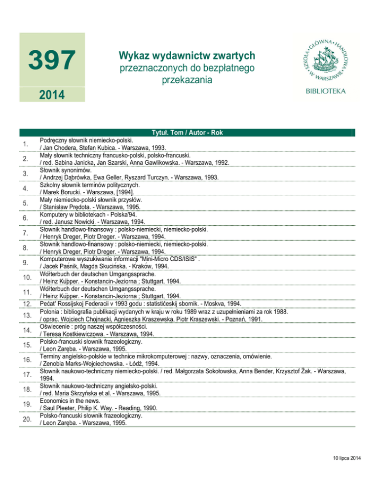 397 Wykaz wydawnictw zwartych przeznaczonych do bezpłatnego przekazania 2014 Tytuł. Tom / Autor - Rok 1. 2. 3. 4. 5. 6. 7. 8. 9. 10. 11. 12. 13. 14. 15. 16. 17. 18. 19. 20. Podręczny słownik niemiecko-polski. / Jan Chodera, Stefan Kubica. - Warszawa, 1993. Mały słownik techniczny francusko-polski, polsko-francuski. / red. Sabina Janicka, Jan Szarski, Anna Gawlikowska. - Warszawa, 1992. Słownik synonimów. / Andrzej Dąbrówka, Ewa Geller, Ryszard Turczyn. - Warszawa, 1993. Szkolny słownik terminów politycznych. / Marek Borucki. - Warszawa, [1994]. Mały niemiecko-polski słownik przysłów. / Stanisław Prędota. - Warszawa, 1995. Komputery w bibliotekach - Polska'94. / red. Janusz Nowicki. - Warszawa, 1994. Słownik handlowo-finansowy : polsko-niemiecki, niemiecko-polski. / Henryk Dreger, Piotr Dreger. - Warszawa, 1994. Słownik handlowo-finansowy : polsko-niemiecki, niemiecko-polski. / Henryk Dreger, Piotr Dreger. - Warszawa, 1994. Komputerowe wyszukiwanie informacji "Mini-Micro CDS/ISIS" . / Jacek Paśnik, Magda Skucińska. - Kraków, 1994. Wörterbuch der deutschen Umgangssprache. / Heinz Küpper. - Konstancin-Jeziorna ; Stuttgart, 1994. Wörterbuch der deutschen Umgangssprache. / Heinz Küpper. - Konstancin-Jeziorna ; Stuttgart, 1994. Pećatʹ Rossijskoj Federacii v 1993 godu : statistićeskij sbornik. - Moskva, 1994. Polonia : bibliografia publikacji wydanych w kraju w roku 1989 wraz z uzupełnieniami za rok 1988. / oprac. Wojciech Chojnacki, Agnieszka Kraszewska, Piotr Kraszewski. - Poznań, 1991. Oświecenie : próg naszej współczesności. / Teresa Kostkiewiczowa. - Warszawa, 1994. Polsko-francuski słownik frazeologiczny. / Leon Zaręba. - Warszawa, 1995. Terminy angielsko-polskie w technice mikrokomputerowej : nazwy, oznaczenia, omówienie. / Zenobia Marks-Wojciechowska. - Łódź, 1994. Słownik naukowo-techniczny niemiecko-polski. / red. Małgorzata Sokołowska, Anna Bender, Krzysztof Żak. - Warszawa, 1994. Słownik naukowo-techniczny angielsko-polski. / red. Maria Skrzyńska et al. - Warszawa, 1995. Economics in the news. / Saul Pleeter, Philip K. Way. - Reading, 1990. Polsko-francuski słownik frazeologiczny. / Leon Zaręba. - Warszawa, 1995. 10 lipca 2014