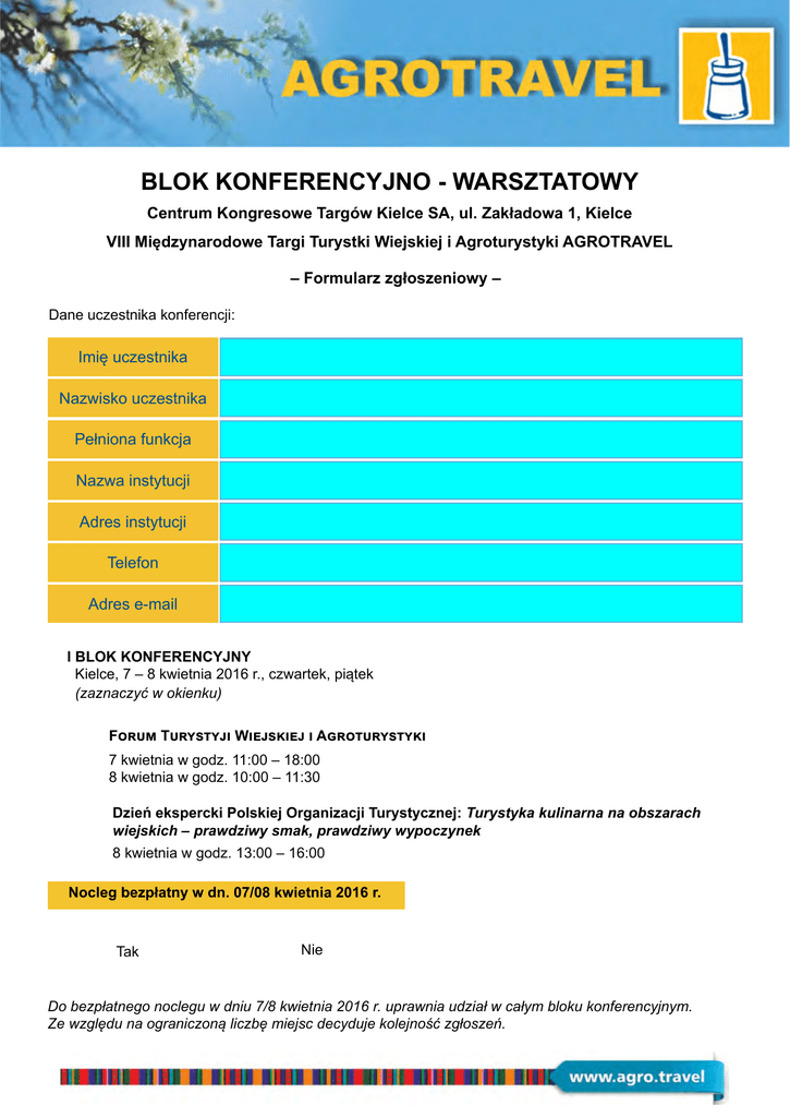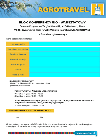 BLOK KONFERENCYJNO - WARSZTATOWY Centrum Kongresowe Targów Kielce SA, ul. Zakładowa 1, Kielce VIII Międzynarodowe Targi Turystki Wiejskiej i Agroturystyki AGROTRAVEL – Formularz zgłoszeniowy – Dane uczestnika konferencji: Imię uczestnika Nazwisko uczestnika Pełniona funkcja Nazwa instytucji Adres instytucji Telefon Adres e-mail I BLOK KONFERENCYJNY Kielce, 7 – 8 kwietnia 2016 r., czwartek, piątek (zaznaczyć w okienku) Forum Turystyji Wiejskiej i Agroturystyki 7 kwietnia w godz. 11:00 – 18:00 8 kwietnia w godz. 10:00 – 11:30 Dzień ekspercki Polskiej Organizacji Turystycznej: Turystyka kulinarna na obszarach wiejskich – prawdziwy smak, prawdziwy wypoczynek 8 kwietnia w godz. 13:00 – 16:00 Nocleg bezpłatny w dn. 07/08 kwietnia 2016 r. Tak Nie Do bezpłatnego noclegu w dniu 7/8 kwietnia 2016 r. uprawnia udział w całym bloku konferencyjnym. Ze względu na ograniczoną liczbę miejsc decyduje kolejność zgłoszeń. II BLOK WARSZTATOWO – DYSKUSYJNY (niezależnie od bloku konferencyjnego) Kielce, 9 kwietnia 2016 r. (sobota) Blok 1, godz. 10:00-11:30 (zaznaczyć jeden wybrany temat) Przez innowacyjność do wyższej jakości produktów (programów) turystyki wiejskiej Przetwórstwo produktów wytworzonych w gospodarstwie rolnym i ich sprzedaż na małą skalę Blok 2, godz. 12:00-13:30 (zaznaczyć jeden wybrany temat) Wsparcie dla rozwoju turystyki wiejskiej i agroturystyki w ramach Programu Rozwoju Obszarów Wiejskich na lata 2014-2020 oraz z krajowych i regionalnych programów operacyjnych Social media w turystyce wiejskiej – obsługa klienta czy marketing? Blok 3, godz. 14:00-15:00 Bilet turystyczny - platforma internetowa Xircom rozwiązaniem dla ruchu turystycznego Udział w bloku warsztatowo-dyskusyjnym jest bezpłatny, organizatorzy nie pokrywają kosztów noclegu i dojazdu. Opisy warsztatów dostępne są na stronie www.agro.travel w zakładce: Imprezy – Konferencja 2016 III WYJAZDY STUDYJNE (płatne) Kielce, 09 kwietnia 2016 r., sobota, w godz. 14:30 - 20:00 Szczegółowe programy wyjazdów dostępny na stronie www.agro.travel, w zakładce: Imprezy – Wyjazdy studyjne Koszt uczestnictwa w wyjeździe studyjnym wynosi 40,00 zł brutto i obejmuje koszty organizacyjne (m.in. transport, bilety wstępu, degustacje i kolację, obsługę przewodnika). W przypadku chęci wzięcia udziału proszę zaznaczyć jeden wybrany wyjazd: Arte Rustica z nutą przedniego wina - wizyta na „Szlaku Wokół Słońca” (m. in. gospodarstwa agroturystyczne w okolicach Buska-Zdrój) Staropolska gościna - z dworku do pałacu - wizyta w Dworku Staropolskim i Zespole Pałacowym w Kurozwękach Warunkiem udziału jest przesłanie do dnia 21 marca 2016 r. dowodu wpłaty e-mailem na adres: [email protected] Opłatę za udział w wyjeździe studyjnym proszę przekazywać na konto: ING Bank Śląski o/Kielce Nr konta: 57 1050 1416 1000 0022 6639 9803 Regionalna Organizacja Turystyczna Województwa Świętokrzyskiego ul. Ściegiennego 2 pok. 32, 25-033 Kielce Tytuł przelewu: Wyjazd studyjny AGROTRAVEL 2016, imię i nazwisko uczestnika W przypadku konieczności wystawienia rachunku proszę przesłać dane płatnika na adres: [email protected] Warunków uczestnictwa: Organizator informuje, iż bezpłatna anulacja noclegu 7/8 kwietnia 2016 r. możliwa jest do dnia 30 marca 2016 r. W przypadku braku informacji o rezygnacji z noclegu do tego terminu, uczestnik zostanie obciążony kosztami niewykorzystanego noclegu. Wyrażam zgodę na przetwarzanie moich danych osobowych przez Regionalną Organizację Turystyczną Województwa Świętokrzyskiego z siedzibą w Kielcach, ul. Ściegiennego 2/32 dla potrzeb niezbędnych do procesu rekrutacji i późniejszego kontaktu z uczestnikami bloku konferencyjno-warsztatowego, zgodnie z ustawą z dnia 29.08.1997r. o ochronie danych osobowych (Dz.U. z 2002 r. nr 101, poz. 926 z późn. zm.), a także udostępnienia organizatorom AGROTRAVEL w celu rozliczenia dofinansowania. Wiem, że przysługuje mi prawo dostępu do swoich danych, ich poprawiania, a także żądania usunięcia w przypadkach określonych w ww ustawie. Przesłanie wypełnionego formularza zgłoszeniowego jest równoznaczne z akceptacją warunków uczestnictwa Wyślij formularz na adres: [email protected]