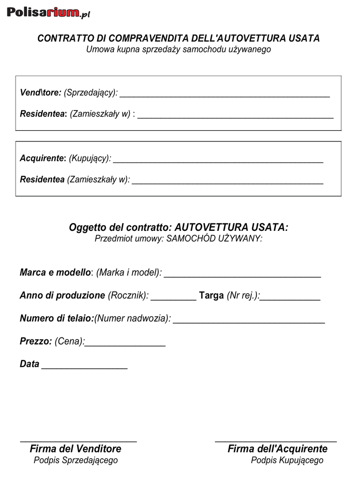 .pl CONTRATTO DI COMPRAVENDITA DELL'AUTOVETTURA USATA Umowa kupna sprzedaży samochodu używanego Vend\tore: (Sprzedający): _____________________________________________ Residentea: (Zamieszkały w) : __________________________________________ Acquirente: (Kupujący): _____________________________________________ Residentea (Zamieszkały w): _________________________________________ Oggetto del contratto: AUTOVETTURA USATA: Przedmiot umowy: SAMOCHÓD UŻYWANY: Marca e modello: (Marka i model): _______________________________ Anno di produzione (Rocznik): _________ Targa (Nr rej.):____________ Numero di telaio:(Numer nadwozia): ______________________________ Prezzo: (Cena):________________ Data _________________ _______________________ Firma del Venditore Podpis Sprzedającego ________________________ Firma dell'Acquirente Podpis Kupującego