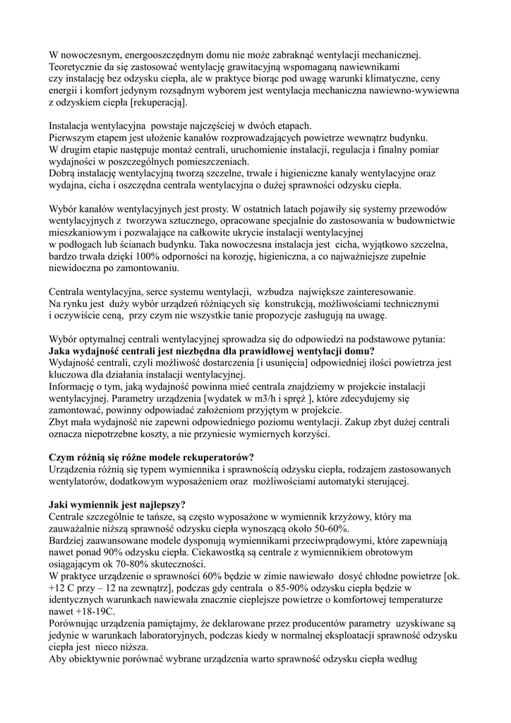 W nowoczesnym, energooszczędnym domu nie może zabraknąć wentylacji mechanicznej. Teoretycznie da się zastosować wentylację grawitacyjną wspomaganą nawiewnikami czy instalację bez odzysku ciepła, ale w praktyce biorąc pod uwagę warunki klimatyczne, ceny energii i komfort jedynym rozsądnym wyborem jest wentylacja mechaniczna nawiewno-wywiewna z odzyskiem ciepła [rekuperacją]. Instalacja wentylacyjna powstaje najczęściej w dwóch etapach. Pierwszym etapem jest ułożenie kanałów rozprowadzających powietrze wewnątrz budynku. W drugim etapie następuje montaż centrali, uruchomienie instalacji, regulacja i finalny pomiar wydajności w poszczególnych pomieszczeniach. Dobrą instalację wentylacyjną tworzą szczelne, trwałe i higieniczne kanały wentylacyjne oraz wydajna, cicha i oszczędna centrala wentylacyjna o dużej sprawności odzysku ciepła. Wybór kanałów wentylacyjnych jest prosty. W ostatnich latach pojawiły się systemy przewodów wentylacyjnych z tworzywa sztucznego, opracowane specjalnie do zastosowania w budownictwie mieszkaniowym i pozwalające na całkowite ukrycie instalacji wentylacyjnej w podłogach lub ścianach budynku. Taka nowoczesna instalacja jest cicha, wyjątkowo szczelna, bardzo trwała dzięki 100% odporności na korozję, higieniczna, a co najważniejsze zupełnie niewidoczna po zamontowaniu. Centrala wentylacyjna, serce systemu wentylacji, wzbudza największe zainteresowanie. Na rynku jest duży wybór urządzeń różniących się konstrukcją, możliwościami technicznymi i oczywiście ceną, przy czym nie wszystkie tanie propozycje zasługują na uwagę. Wybór optymalnej centrali wentylacyjnej sprowadza się do odpowiedzi na podstawowe pytania: Jaka wydajność centrali jest niezbędna dla prawidłowej wentylacji domu? Wydajność centrali, czyli możliwość dostarczenia [i usunięcia] odpowiedniej ilości powietrza jest kluczowa dla działania instalacji wentylacyjnej. Informację o tym, jaką wydajność powinna mieć centrala znajdziemy w projekcie instalacji wentylacyjnej. Parametry urządzenia [wydatek w m3/h i spręż ], które zdecydujemy się zamontować, powinny odpowiadać założeniom przyjętym w projekcie. Zbyt mała wydajność nie zapewni odpowiedniego poziomu wentylacji. Zakup zbyt dużej centrali oznacza niepotrzebne koszty, a nie przyniesie wymiernych korzyści. Czym różnią się różne modele rekuperatorów? Urządzenia różnią się typem wymiennika i sprawnością odzysku ciepła, rodzajem zastosowanych wentylatorów, dodatkowym wyposażeniem oraz możliwościami automatyki sterującej. Jaki wymiennik jest najlepszy? Centrale szczególnie te tańsze, są często wyposażone w wymiennik krzyżowy, który ma zauważalnie niższą sprawność odzysku ciepła wynoszącą około 50-60%. Bardziej zaawansowane modele dysponują wymiennikami przeciwprądowymi, które zapewniają nawet ponad 90% odzysku ciepła. Ciekawostką są centrale z wymiennikiem obrotowym osiągającym ok 70-80% skuteczności. W praktyce urządzenie o sprawności 60% będzie w zimie nawiewało dosyć chłodne powietrze [ok. +12 C przy – 12 na zewnątrz], podczas gdy centrala o 85-90% odzysku ciepła będzie w identycznych warunkach nawiewała znacznie cieplejsze powietrze o komfortowej temperaturze nawet +18-19C. Porównując urządzenia pamiętajmy, że deklarowane przez producentów parametry uzyskiwane są jedynie w warunkach laboratoryjnych, podczas kiedy w normalnej eksploatacji sprawność odzysku ciepła jest nieco niższa. Aby obiektywnie porównać wybrane urządzenia warto sprawność odzysku ciepła według rygorystycznej normy EN308. Jakie znaczenie ma typ silników wentylatorów? Zastosowane w centrali wentylacyjnej silniki wentylatorów mają decydujący wpływ na koszty eksploatacji instalacji. Obecnie standardem są bardzo oszczędne silniki typu EC czyli zasilane prądem stałym i elektronicznie komutowane. zasilane prądem stałym i pozwalające na wygodną regulację w szerokim zakresie. Urządzenia z silnikami EC zużywają na biegu nocnym [najniższym] mniej niż 20W a w ciągu dnia ok. 50 W. Koszt energii elektrycznej potrzebnej do zasilania nowoczesnej centrali z reguły nie przekracza 15 PLN miesięcznie. Spotykane w niektórych urządzeniach silniki starszego typu, zasilane prądem zmiennym, zużywają zauważalnie więcej energii elektrycznej, a ich regulacja nie jest efektywna. Jakie funkcje sterowania są niezbędne? Sterownik centrali powinien zapewnić wygodną regulację wydajności, osobno dla nawiewu i wywiewu , a także możliwość automatycznej zmiany poziomu wentylacji zgodnie z programem zegarowym. Najlepsze sterowniki bez problemu współpracują z opcjonalnymi włącznikami i czujnikami np. wilgotności czy jakości powietrza. Możliwości wentylacji mechanicznej można dodatkowo rozszerzyć montując gruntowy wymiennik ciepła popularnie nazywany GWC. Wymiennik gruntowy umożliwia korzystanie z energii zgromadzonej pod ziemią do wstępnego podgrzania powietrza w zimie oraz schłodzenia powietrza nawiewanego do pomieszczeń w czasie letnich upałów. Najłatwiejszy do wykonania i bardzo skuteczny jest glikolowy wymiennik ciepła, przypominający konstrukcją kolektor poziomy do pomp ciepła. Rury, w których krąży roztwór glikolu odbierający energię z gruntu, można ułożyć nawet na małej działce pod podjazdami, klombami czy kwietnikiem. Dzięki sprawnie działającej wentylacji mechanicznej z odzyskiem ciepła świeże, filtrowane powietrze jest dostarczane do pomieszczeń w optymalnych ilościach niezależnie od pory roku. Wentylacja z odzyskiem ciepła zdecydowanie podnosi komfort i zauważalnie obniża koszty eksploatacji budynku, warto więc wybrać sprawdzone, nowoczesne rozwiązania .