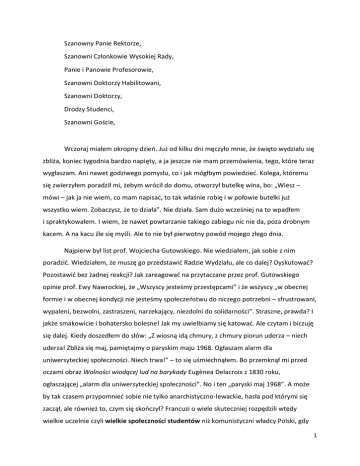 Szanowny Panie Rektorze, Szanowni Członkowie Wysokiej Rady, Panie i Panowie Profesorowie, Szanowni Doktorzy Habilitowani, Szanowni Doktorzy, Drodzy Studenci, Szanowni Goście, Wczoraj miałem okropny dzień. Już od kilku dni męczyło mnie, że święto wydziału się zbliża, koniec tygodnia bardzo napięty, a ja jeszcze nie mam przemówienia, tego, które teraz wygłaszam. Ani nawet godziwego pomysłu, co i jak mógłbym powiedzieć. Kolega, któremu się zwierzyłem poradził mi, żebym wrócił do domu, otworzył butelkę wina, bo: „Wiesz – mówi – jak ja nie wiem, co mam napisać, to tak właśnie robię i w połowie butelki już wszystko wiem. Zobaczysz, że to działa”. Nie działa. Sam dużo wcześniej na to wpadłem i spraktykowałem. I wiem, że nawet powtarzanie takiego zabiegu nic nie da, poza drobnym kacem. A na kacu źle się myśli. Ale to nie był pierwotny powód mojego złego dnia. Najpierw był list prof. Wojciecha Gutowskiego. Nie wiedziałem, jak sobie z nim poradzić. Wiedziałem, że muszę go przedstawić Radzie Wydziału, ale co dalej? Dyskutować? Pozostawić bez żadnej reakcji? Jak zareagować na przytaczane przez prof. Gutowskiego opinie prof. Ewy Nawrockiej, że „Wszyscy jesteśmy przestępcami” i że wszyscy „w obecnej formie i w obecnej kondycji nie jesteśmy społeczeństwu do niczego potrzebni – sfrustrowani, wypaleni, bezwolni, zastraszeni, narzekający, niezdolni do solidarności”. Straszne, prawda? I jakże smakowicie i bohatersko bolesne! Jak my uwielbiamy się katować. Ale czytam i biczuję się dalej. Kiedy doszedłem do słów: „Z wiosną idą chmury, z chmury piorun uderza – niech uderza! Zbliża się maj, pamiętajmy o paryskim maju 1968. Ogłaszam alarm dla uniwersyteckiej społeczności. Niech trwa!" – to się uśmiechnąłem. Bo przemknął mi przed oczami obraz Wolności wiodącej lud na barykady Eugènea Delacroix z 1830 roku, ogłaszającej „alarm dla uniwersyteckiej społeczności”. No i ten „paryski maj 1968”. A może by tak czasem przypomnieć sobie nie tylko anarchistyczno-lewackie, hasła pod którymi się zaczął, ale również to, czym się skończył? Francuzi o wiele skuteczniej rozpędzili wtedy wielkie uczelnie czyli wielkie społeczności studentów niż komunistyczni władcy Polski, gdy 1 po wojnie poszatkowali uniwersytety na akademie medyczne, muzyczne, artystyczne, politechniki, wyższe szkoły rolnicze i kadłubki dawnych uniwersytetów. Dziel i rządź – tę mądrość znają wszyscy satrapowie. Nie wiem, czy po 50 latach Francuzi są dumni, że mają Uniwersytet Paryski od jednego do kilkunastu, a gdzie indziej Uniwersytet miasta X od jeden do kilku. Zimno się robi na samą myśl, że ktoś mógłby chcieć czegoś podobnego dla nas. Nie myślałem wtedy, że wkrótce wbiję się w jeszcze czarniejszy nastrój. Ale w trakcie kolokwium habilitacyjnego chciałem jeszcze raz przejrzeć książkę Piotra Millatiego. Passus, który wpadł mi w oko brzmi następująco: „Religia i literatura odgrywały rolę buforu między człowiekiem a twardą rzeczywistością. Były próbą stworzenia rzeczywistości bis, rzeczywistości nam przyjaznej, prawdziwie ludzkiej, w której można zamieszkać, chroniąc się przed nieludzkimi ostatecznościami prawdziwego świata. Obie nadawały sens i znaczenie temu wszystkiemu, co trzeba było przyjąć jako konieczne, lecz z czym nie można się było pogodzić. Gdy człowiek wreszcie uczynił sobie świat poddanym w tym stopniu, że już nie chce żadnego innego, ten amortyzator przestał być mu potrzebny. To dlatego, że żaden inny świat nie jest ani potrzebny, ani wyczekiwany, religia i literatura odchodzą w niebyt” (s. 222). Chyba zgodzicie się Państwo, że takie słowa, wzięte na serio, mogą wpędzić człowieka w krańcową depresję. Teraz już nie tylko my wszyscy jesteśmy niemoralni i godni pogardy, ale przedmiot naszych badań rozwiewa się jak mgiełka na stawem i za chwilę już go nie będzie. A my wymrzemy jak dinozaury. Tylko wtedy przypomniałem sobie, że to „gwałtowne wyginięcie dinozaurów” trwało prawdopodobnie jakieś 60 tysięcy lat. I trochę poweselałem, bo jeśliby znikanie literatury i religii z naszego życia miało trwać tyle samo, to chyba nie ma co się tym tak bardzo martwić. W końcu słowo pisane trwa dopiero jakieś 6 000 lat. I gdzież ten świat, który podobno uczyniliśmy sobie poddanym? Czy zapanowaliśmy choćby nad „powietrzem, wodą, ogniem i wojną”? Internet w każdym domu a komórka przy uchu nie czyni świata nam poddanym. Przecież my nawet nie panujemy nad naszym własnym ciałkiem czy cielskiem, jak kto woli. Zanim słońce nam wystygnie, a to też istotna część naszego świata, minie jakieś 10 miliardów lat, i nie ma takiej siły, która mogłaby ten proces powstrzymać. A więc informację o uczynieniu sobie świata poddanym uznałbym, jak Mark Twain informację o własnej śmierci, za „nieco przedwczesną.” A jak znika przyczyna, to znika i skutek. A więc i religia, i literatura będą nam dalej towarzyszyć po wsze czasy, choć ich śmierć filozofowie i darwiniści bezskutecznie 2 głoszą od co najmniej 150 lat, a pisarze od 4 000 lat narzekają, że nie ma już o czym pisać, bo wszystkie fabuły zostały już zużyte. Starałem sobie też przypomnieć czy u kogoś innego spotkałem się już z podobnymi „amortyzatorowymi” poglądami na religię i literaturę. Znam wiele naturalistycznych, darwinowskich, freudowskich czy marksistowskich teorii pochodzenia i funkcji religii, ale żadna z nich nie sugeruje, że człowiek wymyślił sobie religię jako alternatywny, bardziej ludzki świat. Bo nawet „opium dla ludu” ma całkiem inny sens. Tak samo sugerowanie, że literatura, dla szerszych rzesz czytelników dostępna dopiero od jakichś 200 lat, też pełni funkcję przytulnego azylu i buforu chroniącego nas, ludzi, przed nieludzkim światem, jest tak zdrowor