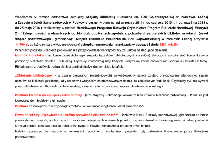 Współpraca w ramach partnerstwa pomiędzy Miejską Biblioteką Publiczną im. Poli Gojawiczyńskiej w Podkowie Leśnej a Zespołem Szkół Samorządowych w Podkowie Leśnej w okresie: od września 2014 r. do czerwca 2015 r. i od września 2015 r. do 25 maja 2016 r. realizowany w ramach Narodowego Programu Rozwoju Czytelnictwa Program Biblioteki Narodowej. Priorytet 2 - “Zakup nowości wydawniczych do bibliotek publicznych zgodnie z potrzebami partnerskich bibliotek szkolnych (szkół stopnia podstawowego i gimnazjów)”. Miejska Biblioteka Publiczna im. Poli Gojawiczyńskiej w Podkowie Leśnej pozyskała 14 700 zł, za które (wraz z wkładem własnym) zakupiła, opracowała i przekazała w depozyt Szkole 1283 książki. W ramach projektu Biblioteka podkowiańska przeprowadziła we współpracy ze Szkołą następujące działania: Mobilna biblioteka - na bazie przeszkolonego zespołu łączników bibliotecznych (uczniów) stworzona została sieć komunikacyjna pomiędzy biblioteką szkolną i publiczną. Łącznicy dostarczają listy książek, którymi są zainteresowani ich koleżanki i koledzy z klasy. Bibliotekarze z placówek partnerskich organizują indywidualny obieg książek. „Oblężenie biblioteczne” - w czasie pierwszych (wrześniowych) wywiadówek w szkole zostało przygotowane stanowisko zapisu uczniów do biblioteki publicznej, aby umożliwić wszystkim zainteresowanym dostęp do zakupionych publikacji. Czytelnicy byli zapisywani przez bibliotekarza z Biblioteki podkowiańskiej, który wdrażał w procedury zapisu bibliotekarza szkolnego. Konkurs literacki na najlepszy tekst fantasy - (Dwuetapowy - eliminacje wewnątrz klas i finał w bibliotece publicznej) k. Konkurs jest kierowany do młodzieży z gimnazjum. Konkurs na najlepszą recenzję książki fantasy. W konkursie mogli brać udział gimnazjaliści. Bitwa na lektury „Opowiadanie - krótka opowieść i ciekawa podróż”. Uczniowie klas 1-3 szkoły podstawowej i gimnazjum na bazie przeczytanych książek, pochodzących z zasobów zakupionych w ramach projektu, zaprezentowali w formie wypowiedzi ustnej postaci i/ lub wydarzenia, opisując emocje bohaterów, tworząc fikcyjne zakończenia przeczytanych historii. Należy zaznaczyć, że nagrody w konkursach, zgodnie z regulaminem projektu, były całkowicie finansowane przez Bibliotekę podkowiańską. Uczniowie zarejestrowani w bibliotece szkolnej, korzystający z depozytu książek z Miejskiej Biblioteki Publicznej im. Poli Gojawiczyńskiej w Podkowie Leśnej w okresach: od września 2014 do czerwca 2015 od września 2015 do 25 maja 2016 2014 2015 110 82,5 55 27,5 0 Liczba osób 2016 Liczba wypożyczeń w bibliotece szkolnej przez uczniów, korzystających z depozytu książek z Miejskiej Biblioteki Publicznej im. Poli Gojawiczyńskiej w Podkowie Leśnej w okresach: od września 2014 do czerwca 2015 od września 2015 do 25 maja 2016 2014 2015 300 225 150 75 0 Liczba wypożyczeń 2016 Liczba odwiedzin w bibliotece szkolnej, uczniów korzystających z depozytu książek z Miejskiej Biblioteki Publicznej im. Poli Gojawiczyńskiej w Podkowie Leśnej w okresach: od września 2014 do czerwca 2015 od września 2015 do 25 maja 2016 2014 2015 500 375 250 125 0 Liczba odwiedzin 2016