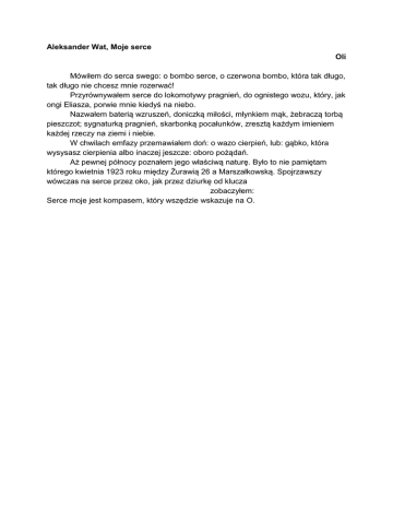 Aleksander Wat, Moje serce Oli Mówiłem do serca swego: o bombo serce, o czerwona bombo, która tak długo, tak długo nie chcesz mnie rozerwać! Przyrównywałem serce do lokomotywy pragnień, do ognistego wozu, który, jak ongi Eliasza, porwie mnie kiedyś na niebo. Nazwałem baterią wzruszeń, doniczką miłości, młynkiem mąk, żebraczą torbą pieszczot; sygnaturką pragnień, skarbonką pocałunków, zresztą każdym imieniem każdej rzeczy na ziemi i niebie. W chwilach emfazy przemawiałem doń: o wazo cierpień, lub: gąbko, która wysysasz cierpienia albo inaczej jeszcze: oboro pożądań. Aż pewnej północy poznałem jego właściwą naturę. Było to nie pamiętam którego kwietnia 1923 roku między Żurawią 26 a Marszałkowską. Spojrzawszy wówczas na serce przez oko, jak przez dziurkę od klucza zobaczyłem: Serce moje jest kompasem, który wszędzie wskazuje na O. Stanisław Barańczak W celi tej, gdzie dążenie celem W celi tej, gdzie dążenie celem jest, odpoczynek znajdują dwie strzały zderzone w lot grotami, co się starły wszczepiając w siebie na ruchliwy cement swe pędy; tam, gdzie wciąż trwa stały ruch i rozbiegłe zespolenie, cieniem drwiąco odwrotnym wyznacza się cenę na wód stojących skrzepłe stany posiadania. Za moją kratą każda głoska dźwięczy łańcuchem innym i na gramy waży się głos, by pękła jego gładka tafla w sprzecznym uskoku, by grały przeciwko sobie karty, zamiast kraty głaskać, widzę, jak szary mur rozpierzcha się bez granic. Czesław Miłosz Nigdy od ciebie, miasto Nigdy od ciebie, miasto, nie mogłem odjechać Długa była mila, ale cofało mnie jak figurę w szachach. Uciekałem po ziemi obracającej się coraz prędzej A zawsze byłem tam z książkami w płóciennej torbie, Gapiąc się na brązowe pagórki za wieżami Świętego Jakuba Gdzie rusza się drobny koń i drobny człowiek za pługiem, Najoczywiściej od dawna nieżywi. Tak to prawda, nikt nie pojął społeczeństwa ni miasta, Kin Lux i Helios, szyldów Halperna i Segala, Deptaku na Świętojerskiej nazwanej Mickiewicza. Nie, nikt nie pojął. Nikomu się nie udało. Ale kiedy życie się strawi na jednej nadziei: Że w jakiś dzień już tylko ostrość i przezroczystość, To, bardzo często, żal. Czesław Miłosz W MIEŚCIE Miasto było ukochane i szczęśliwe, Zawsze w czerwcowych piwoniach i późnych bzach, Pnące się barokowymi wieżami ku niebu. Powrócić z majówki i stawiać w wazach bukiety, Za oknem widzieć ulicę, którą kiedyś szło się do szkoły (Na murach ostre granice słońca i cienia). Kajakowanie razem na jeziorach. Miłosne wyprawy na wyspy porośnięte łozą. Narzeczeństwo i ślub u Świętego Jerzego. A później konfraternia ucztuje u mnie na chrzcinach. Cieszą mnie turnieje muzyków, krasomówców, poetów, Brawa tłumu, kiedy ulicą przeciąga Pochód Smoka. Co niedziela zasiadałem w kolatorskiej ławce. Nosiłem togę i złoty łańcuch, dar współobywateli. Starzałem się, wiedząc, że moje wnuki zostaną miastu wierne. Gdyby tak było naprawdę. Ale wywiało mnie Za morza i oceany. Żegnaj, utracony losie. Żegnaj, miasto mego bólu. Żegnajcie, żegnajcie.