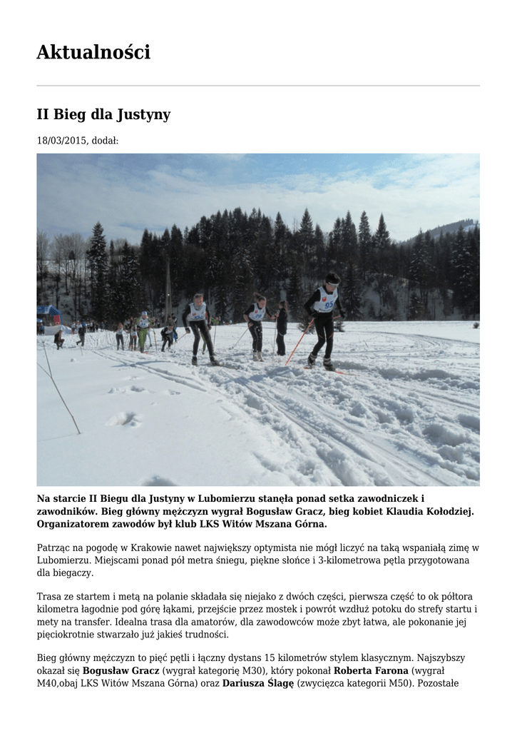 Aktualności II Bieg dla Justyny 18/03/2015, dodał: Na starcie II Biegu dla Justyny w Lubomierzu stanęła ponad setka zawodniczek i zawodników. Bieg główny mężczyzn wygrał Bogusław Gracz, bieg kobiet Klaudia Kołodziej. Organizatorem zawodów był klub LKS Witów Mszana Górna. Patrząc na pogodę w Krakowie nawet największy optymista nie mógł liczyć na taką wspaniałą zimę w Lubomierzu. Miejscami ponad pół metra śniegu, piękne słońce i 3-kilometrowa pętla przygotowana dla biegaczy. Trasa ze startem i metą na polanie składała się niejako z dwóch części, pierwsza część to ok półtora kilometra łagodnie pod górę łąkami, przejście przez mostek i powrót wzdłuż potoku do strefy startu i mety na transfer. Idealna trasa dla amatorów, dla zawodowców może zbyt łatwa, ale pokonanie jej pięciokrotnie stwarzało już jakieś trudności. Bieg główny mężczyzn to pięć pętli i łączny dystans 15 kilometrów stylem klasycznym. Najszybszy okazał się Bogusław Gracz (wygrał kategorię M30), który pokonał Roberta Farona (wygrał M40,obaj LKS Witów Mszana Górna) oraz Dariusza Ślagę (zwycięzca kategorii M50). Pozostałe męskie kategorie wygrali Krzysztof Guzik (M20) i Piotr Faron (M60). WYNIKI OPEN Bieg główny kobiet na dystansie 6km (dwie pętle) wygrała Klaudia Kołodziej z LKS Witów Mszana Górna, przed dwójką zawodniczek LKS Wiśniowa Osieczany Iwoną Piekarz i Weroniką Kaletą. Oprócz biegów głównych rozegrano także biegi dla gimnazjalistów i dzieci ze szkół podstawowych.. WYNIKI GIMNAZJUM WYNIKI SZKOŁY PODSTAWOWE Patrząc na ilość śniegu w Lubomierzu Rzekach podejrzewam, że jeszcze za miesiąc będzie się można wybrać tam na narty, szczególnie polecam ta trasę początkującym. Myślę, że w imieniu organizatorów i swoim możemy śmiało polecić Lubomierz na weekendowy wypad na biegówki. Z Krakowa to około godziny drogi. Wszystkich kończących bieg zawodników honorowano medalami, serwowano herbatkę i przepyszny gulasz. Zawodami kierowała Patrycja Wąchała, oczywiście poza czasem koniecznym na przebiegnięcie swojego dystansu, nad wszystkim czuwał trener LKS Witów Mszana Górna Krzysztof Jarosz. II Bieg dla Justyny, odbył się wprawdzie bez Justyny Kowalczyk, ale nasza mistrzyni miejmy nadzieję była duchem z uczestnikami zawodów. Wczoraj wróciła do domu w Kasinie, raptem kilkanaście kilometrów od Lubomierza, myślę, że już wie o biegu i jego wynikach, w końcu miała na zawodach swojego "człowieka" :) Kilka słów od organizatora biegu Krzysztofa Jarosza: Uczestnicy II Biegu Dla Justyny poprzez swój udział w imprezie składają podziękowanie naszej Mistrzyni za kolejny medal Mistrzostw Świata i całą karierę sportową, za dostarczone wzruszenia i emocje. Poprzez organizację zawodów w Lubomierzu-Rzekach, na terenie gminy Mszana Dolna staramy się pokazać całej sportowej Polsce miejsce gdzie długo, przez 4 miesiące w roku utrzymują się warunki śniegowe do uprawiania narciarstwa biegowego. Nie można jeszcze tu mówić o trasach biegowych, a jedynie o pewnym potencjale wymagającym niewielkich nakładów finansowych i dużej pracy. Brak odpowiedniego sprzętu i mała liczba osób spowodowała że nie udało się w tym roku dobrze tych zawodów przeprowadzić za co serdecznie przybyłych gości przepraszam. Podziękowanie dla osób, które przyczyniły się do organizacji II Biegu Dla Justyny: Wójt Gminy Mszana Dolna Bolesław Żaba – za udostępnienie tras Sponsorzy nagród: Tartak „Kuś” Mszana Górna Krzysztof Kuś Radny Gminy Mszana Dolna – Jan Wojciarczyk Firma Transportowa „Mega Star” Mszana Dolna Mirosław Żak Centrum Handlowe „Klaudia” Mszana Górna Maria i Kazimierz Rapacz Lakiernictwo Pojazdowe Import Eksport Samochodów i Części Używanych Kołodziej Grzegorz Łętowe PSB „Mrówka” Mszana Dolna Stanisława i Edward Kołodziejczyk Prezes Tatrzańskiego Związku Narciarskiego – Andrzej Kozak Sklep OSZO Sport – Rowery Mszana Dolna Dariusz Godawski Sklep Sportowo-Rowerowy Mszana Dolna Tomasz Zawirski Sklep Odzieżowy „Kejbra” Barbara Kapturkiewicz Sklepy Sportowe „Koperniak” Tomasz Koperniak Sponsorzy poczęstunku: „Nachman” Zakład mięsny Lubomierz Jan Nachman Sklep Spożywczy Maria i Józef Nowak – Łętowe Gminna Spółdzielnia „Samopomoc Chłopska” Mszana Dolna Źródło: www.skipol.pl