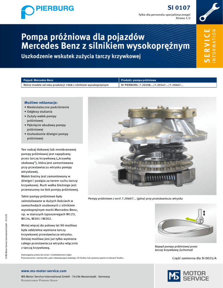 SI 0107 Uszkodzenie wskutek zużycia tarczy krzywkowej Pojazd: Mercedes Benz Produkt: pompa próżniowa Różne modele od roku produkcji 1968 z silnikiem wysokoprężnym Nr PIERBURG: 7.20208.../7.20547.../7.20607... I N F O R M AT I O N Pompa próżniowa dla pojazdów Mercedes Benz z silnikiem wysokoprężnym SERVICE Tylko dla personelu specjalistycznego! Strona 1/2 Możliwe reklamacje: • Niedostateczne podciśnienie • Odgłosy stukania • Zużyty wałek pompy próżniowej • Pęknięcie obudowy pompy próżniowej • Uszkodzenie dźwigni pompy próżniowej © MS Motor Service International GmbH – 0710 PL Ten rodzaj tłokowej lub membranowej pompy próżniowej jest napędzany przez tarczę krzywkową („krzywkę skokową”), która jest zamontowana przy przestawiaczu wtrysku pompy wtryskowej. Wałek bieżny jest zamontowany w dźwigni i podąża za torem ruchu tarczy krzywkowej. Ruch wałka bieżnego jest przenoszony na tłok pompy próżniowej. Takie pompy próżniowe były zainstalowane w dużych ilościach w samochodach osobowych z silnikiem wysokoprężnym marki Mercedes-Benz, np. w starszych typoszeregach W123, W124, W201 i W202. Pompy próżniowe z serii 7.20607... (góra) przy przestawiaczu wtrysku Mniej więcej do połowy lat 90 możliwa była oddzielna wymiana tarczy krzywkowej przestawiacza wtrysku. Dzisiaj możliwa jest już tylko wymiana całego przestawiacza wtrysku włącznie z tarczą krzywkową. Napęd pompy próżniowej przez tarczę krzywkową (schemat) Zastrzegamy prawo do zmian i niedokładności zdjęć. Przeznaczenie i zamienniki, patrz obowiązujące katalogi, CD TecDoc lub systemy oparte na danych TecDoc. www.ms-motor-service.com www.ms-motor-service.com MS Motor Service International · 74196 Neuenstadt MS Motor Service International GmbH · 74196GmbH Neuenstadt · Germany K olbenschmidt P ierburg g rouP Kolbenschmidt Pierburg Group Część zamienna dla SI 0025/A · Niemcy SI 0107 Tylko dla personelu specjalistycznego! Strona 2/2 ! Pompy próżniowe stanowią elementy bezpieczeństwa, ich montaż i demontaż może przeprowadzać tylko wykwalifikowany personel! Jeżeli tarcza krzywkowa jest zużyta, wałek bieżny dźwigni zaczyna „skakać”, powstają w nim karby i zaczyna wydawać stukające odgłosy. W najgorszym wypadku wałek może się rozpaść, a jego pojedyncze części dostać się do mechanizmu sterującego. Przy montażu nowej pompy próżniowej należy zawsze sprawdzić powierzchnię tarczy krzywkowej przy przestawiaczu wtrysku. W razie uszkodzenia lub zużycia tarczy krzywkowej konieczna jest także wymiana przestawiacza wtrysku, w przeciwnym razie nowa pompa próżniowa zostałaby szybko ponownie uszkodzona. © MS Motor Service International GmbH – 0710 PL Powierzchni bieżnej zużytej tarczy krzywkowej nie wolno pod żadnym pozorem szlifować ani polerować. Powierzchnia bieżna ma określoną szorstkość, która jest warunkiem zamkniętego siłowo połączenia z wałkiem bieżnym. Jeżeli powierzchnia bieżna zostanie oszlifowana albo wypolerowania, wirnik może się nie obracać. Spowodowałoby to jednostronne starcie wirnika. Wióry powstające wskutek tarcia spowodowałyby następne uszkodzenia. W celu oceny reklamacji należy nadesłać tarczę krzywkową. Prawidłowa tarcza krzywkowa Dalsze wskazówki montażowe •Pompę próżniową (1) montować tylko przy krzywkach w pozycji dolnej, przykręcać na krzyż. •Zasadniczo użyć nowej uszczelki (2). •W starszych pojazdach przed montażem nowej pompy próżniowej należy wymontować kosz montażowy (3). Jest on przykręcony w skrzyni korbowej przed przestawiaczem wtrysku (4). W późniejszych modelach kosz montażowy (3) nie występuje. ! 1 Zużyta tarcza krzywkowa Obraz uszkodzenia: Wałek bieżny z karbami spowodowanymi przez zużytą tarczę krzywkową Kosza montażowego (3) nie wolno montować przy montażu nowej pompy próżniowej. Obraz uszkodzenia: jednostronnie starty wałek bieżny 2 3 4 1 Pompa próżniowa 2Uszczelka 3 Kosz montażowy 4Przestawiacz wtrysku w skrzyni korbowej Obraz uszkodzenia: całkowicie zniszczona dźwignia Część zamienna dla SI 0025/A www.ms-motor-service.com MS Motor Service International GmbH · 74196 Neuenstadt · Germany Kolbenschmidt Pierburg Group