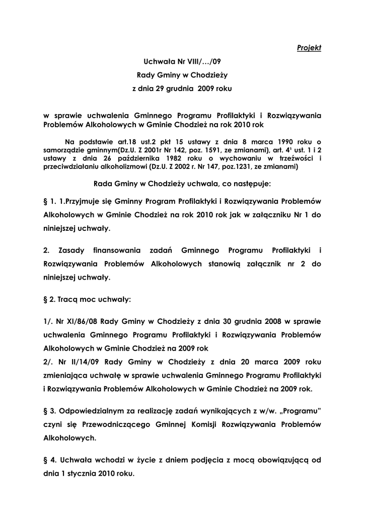 Projekt Uchwała Nr VIII/…/09 Rady Gminy w Chodzieży z dnia 29 grudnia 2009 roku w sprawie uchwalenia Gminnego Programu Profilaktyki i Rozwiązywania Problemów Alkoholowych w Gminie Chodzież na rok 2010 rok Na podstawie art.18 ust.2 pkt 15 ustawy z dnia 8 marca 1990 roku o samorządzie gminnym(Dz.U. Z 2001r Nr 142, poz. 1591, ze zmianami), art. 4¹ ust. 1 i 2 ustawy z dnia 26 października 1982 roku o wychowaniu w trzeźwości i przeciwdziałaniu alkoholizmowi (Dz.U. Z 2002 r. Nr 147, poz.1231, ze zmianami) Rada Gminy w Chodzieży uchwala, co następuje: § 1. 1.Przyjmuje się Gminny Program Profilaktyki i Rozwiązywania Problemów Alkoholowych w Gminie Chodzież na rok 2010 rok jak w załączniku Nr 1 do niniejszej uchwały. 2. Zasady finansowania zadań Gminnego Programu Profilaktyki i Rozwiązywania Problemów Alkoholowych stanowią załącznik nr 2 do niniejszej uchwały. § 2. Tracą moc uchwały: 1/. Nr XI/86/08 Rady Gminy w Chodzieży z dnia 30 grudnia 2008 w sprawie uchwalenia Gminnego Programu Profilaktyki i Rozwiązywania Problemów Alkoholowych w Gminie Chodzież na 2009 rok 2/. Nr II/14/09 Rady Gminy w Chodzieży z dnia 20 marca 2009 roku zmieniająca uchwałę w sprawie uchwalenia Gminnego Programu Profilaktyki i Rozwiązywania Problemów Alkoholowych w Gminie Chodzież na 2009 rok. § 3. Odpowiedzialnym za realizację zadań wynikających z w/w. „Programu” czyni się Przewodniczącego Gminnej Komisji Rozwiązywania Problemów Alkoholowych. § 4. Uchwała wchodzi w życie z dniem podjęcia z mocą obowiązującą od dnia 1 stycznia 2010 roku. Uzasadnienie do Uchwały Nr VIII/…/09 Rady Gminy w Chodzieży z dnia 29 grudnia 2009 roku w sprawie uchwalenia Gminnego Programu Profilaktyki i Rozwiązywania Problemów Alkoholowych w Gminie Chodzież na rok 2010 W Polsce zgodnie z ustawą o wychowaniu w trzeźwości i przeciwdziałaniu alkoholizmowi profilaktyka i rozwiązywanie problemów alkoholowych należy do zadań własnych gminy, a podstawą realizacji tych zadań jest Gminny Program Profilaktyki i Rozwiązywania Problemów Alkoholowych, który zgodnie z art. 4 ust. 2 ustawy jest uchwalany corocznie przez każdą gminę. Załącznik Nr 1 do Uchwały Nr VIII/…/09 Rady Gminy w Chodzieży z dnia 29 grudnia 2009 r. Gminny Program Profilaktyki i Rozwiązywania Problemów Alkoholowych na rok 2010 I. Wstęp Spośród licznych problemów społecznych, jakie występują w naszym kraju problemy związane z alkoholem mają szczególne znaczenie. Wynika to przede wszystkim z rozmiarów tego zjawiska oraz społecznych i ekonomicznych kosztów, jakie z tego tytułu ponosi budżet państwa. Konsumpcja alkoholu ma istotny wpływ na zdrowie fizyczne i psychiczne zarówno jednostek jak i rodzin a jej konsekwencje dotyczą nie tylko osób pijących szkodliwie ale wpływają na całą populację. Nadużywanie alkoholu powoduje wiele szkód społecznych takich jak zakłócenia bezpieczeństwa publicznego, przestępczość, wypadki samochodowe, przemoc w rodzinie, ubóstwo i bezrobocie, dlatego też działania w zakresie zapobiegania i rozwiązywania problemów alkoholowych powinny być przedmiotem szczególnej troski ze strony organów administracji rządowej i samorządowej. Zgodnie z Raportem Światowej Organizacji Zdrowia, dotyczącym stanu zdrowia na świecie alkohol znajduje się na trzecim miejscu wśród czynników ryzyka dla zdrowia populacji, odpowiedzialnym za ponad 9% całkowitego obciążenia chorobami i urazami. Ponad 60 rodzajów chorób i urazów ma związek z alkoholem. Rozmiary szkód mogą być zmniejszone przez skuteczną politykę wobec alkoholu i problemów z nim związanych. Jednak mimo podejmowanych wysiłków mających na celu zwiększenie świadomości nt. konsekwencji nadużywania środków psychoaktywnych oraz dostępności do świadczeń terapeutyczno – rehabilitacyjnych, problem uzależnienia od alkoholu stale utrzymuje tendencję wzrostową. Przemiany społeczno – gospodarcze i związane z tym nawarstwianie się potrzeb oraz brak środków i zasobów umożliwiających ich zaspokojenie, przyczyniają się do nasilenia frustracji, których skutki najczęściej łagodzone są poprzez nadużywanie środków chemicznie stymulujących dobre samopoczucie - w tym przez alkohol i narkotyki. Alkohol jest wszędzie wokół nas. Większość ludzi pije go umiarkowanie jednak dla większości picie jest w dużym stopniu nieświadomym i nieprzemyślanym zachowaniem. Właśnie ten fakt przyczynia się do tworzenia klimatu sprzyjającego powstawaniu problemów alkoholowych. Alkoholizm, czyli uzależnienie od alkoholu, w odróżnieniu od pijaństwa, jest chorobą. Jest to choroba chroniczna, postępująca i potencjalnie śmiertelna. Objawia się w takich zjawiskach jak: podwyższenie tolerancji na alkohol, poczucie łaknienia alkoholu, utrata kontroli nad piciem, objawy abstynencji (drgawki, skurcze mięśniowe, poty, nudności, a nawet zaburzenia świadomości) po krótkim nawet odstawieniu alkoholu, „dziury” w pamięci. Alkoholik pod wpływem niszczącego działania alkoholu, systematycznie niszczy swoje związki z innymi ludźmi. Wszczyna awantury i bijatyki bez powodu. Ma problemy z rodziną, przyjaciółmi, współpracownikami. Pogarsza się jego samoocena i winą za swoje problemy próbuje obarczać innych ludzi. A wtedy tylko jedna rzecz pozwala mu poczuć się lepiej – alkohol. Picie zostaje świadomie włączone do codziennego planu dnia. Alkoholizm często nazywany jest „chorobą rodziny”. Odzwierciedla to bardzo silny wpływ jaki alkoholicy wywierają na swoje otoczenie. Członkowie rodziny takiego alkoholika, również podlegają niszczącemu działaniu długotrwałego oddziaływania alkoholu. Małżonkowie i dzieci osoby uzależnionej albo rozpaczliwie próbują powstrzymać jej picie albo rezygnują z nadziei na lepsze życie. Alkohol uważany jest za jeden z ważniejszych czynników zwiększających ryzyko zgonu przed 65 rokiem życia. Zjawisko