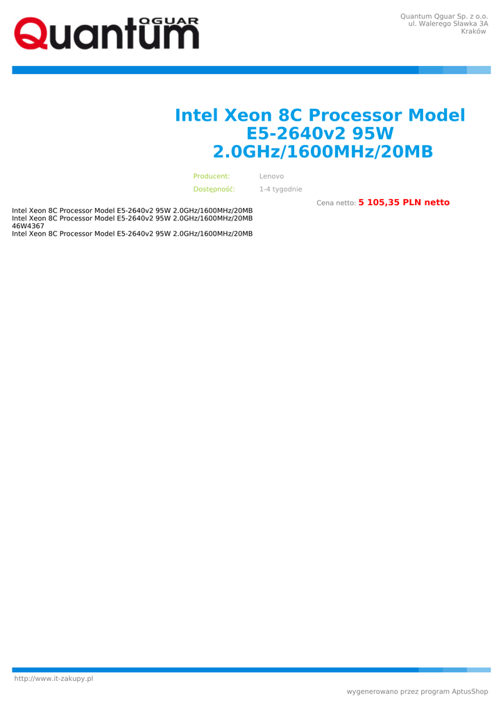 Quantum Qguar Sp. z o.o. ul. Walerego Sławka 3A Kraków Intel Xeon 8C Processor Model E5-2640v2 95W 2.0GHz/1600MHz/20MB Producent: Lenovo Dostępność: 1-4 tygodnie Cena netto: 5 105,35 PLN netto Intel Xeon 8C Processor Model E5-2640v2 95W 2.0GHz/1600MHz/20MB Intel Xeon 8C Processor Model E5-2640v2 95W 2.0GHz/1600MHz/20MB 46W4367 Intel Xeon 8C Processor Model E5-2640v2 95W 2.0GHz/1600MHz/20MB http://www.it-zakupy.pl wygenerowano przez program AptusShop