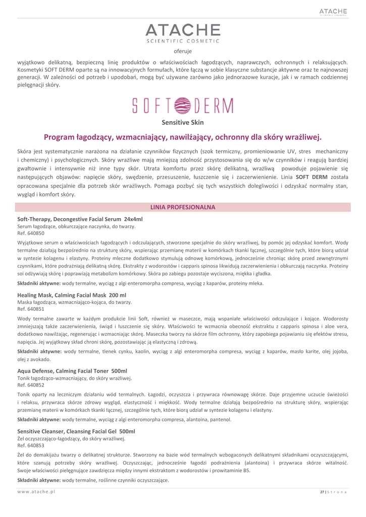 oferuje wyjątkowo delikatną, bezpieczną linię produktów o właściwościach łagodzących, naprawczych, ochronnych i relaksujących. Kosmetyki SOFT DERM oparte są na innowacyjnych formułach, które łączą w sobie klasyczne substancje aktywne oraz te najnowszej generacji. W zależności od potrzeb i upodobao, mogą byd używane zarówno jako jednorazowe kuracje, jak i w ramach codziennej pielęgnacji skóry. Sensitive Skin Program łagodzący, wzmacniający, nawilżający, ochronny dla skóry wrażliwej. Skóra jest systematycznie narażona na działanie czynników fizycznych (szok termiczny, promieniowanie UV, stres mechaniczny i chemiczny) i psychologicznych. Skóry wrażliwe mają mniejszą zdolnośd przystosowania się do w/w czynników i reagują bardziej gwałtownie i intensywnie niż inne typy skór. Utrata komfortu przez skórę delikatną, wrażliwą powoduje pojawienie się następujących objawów: napięcie skóry, swędzenie, przesuszenie, łuszczenie się i zaczerwienienie. Linia SOFT DERM została opracowana specjalnie dla potrzeb skór wrażliwych. Pomaga pozbyd się tych wszystkich dolegliwości i odzyskad normalny stan, wygląd i komfort skóry. LINIA PROFESJONALNA Soft-Therapy, Decongestive Facial Serum 24x4ml Serum łagodzące, obkurczające naczynka, do twarzy. Ref. 640850 Wyjątkowe serum o właściwościach łagodzących i odczulających, stworzone specjalnie do skóry wrażliwej, by pomóc jej odzyskad komfort. Wody termalne działają bezpośrednio na strukturę skóry, wspierając przemianę materii w komórkach tkanki łącznej, szczególnie tych, które biorą udział w syntezie kolagenu i elastyny. Proteiny mleczne dodatkowo stymulują odnowę komórkową, jednocześnie chroniąc skórę przed zewnętrznymi czynnikami, które podrażniają delikatną skórę. Ekstrakty z wodorostów i capparis spinosa likwidują zaczerwienienia i obkurczają naczynka. Proteiny soi odżywiają skórę i poprawiają metabolizm komórkowy. Skóra po zabiegu pozostaje wyciszona, miękka i gładka. Składniki aktywne: wody termalne, wyciąg z algi enteromorpha compresa, wyciąg z kaparów, proteiny mleka. Healing Mask, Calming Facial Mask 200 ml Maska łagodząca, wzmacniająco-kojąca, do twarzy. Ref. 640851 Wody termalne zawarte w każdym produkcie linii Soft, również w maseczce, mają wspaniałe właściwości odczulające i kojące. Wodorosty zmniejszają także zaczerwienienia, świąd i łuszczenie się skóry. Właściwości te wzmacnia obecnośd ekstraktu z capparis spinosa i aloe vera, dodatkowo nawilżając, regenerując i wzmacniając skórę. Maseczka tworzy na skórze film ochronny, który zapobiega pojawianiu się efektów stresu, napięcia. Jej wyjątkowy skład chroni skórę, pozostawiając ją elastyczną i zdrową. Składniki aktywne: wody termalne, tlenek cynku, kaolin, wyciąg z algi enteromorpha compresa, wyciąg z kaparów, masło karite, olej jojoba, olej z avokado. Aqua Defense, Calming Facial Toner 500ml Tonik łagodząco-wzmacniający, do skóry wrażliwej. Ref. 640852 Tonik oparty na leczniczym działaniu wód termalnych. Łagodzi, oczyszcza i przywraca równowagę skórze. Daje przyjemne uczucie świeżości i relaksu, przywraca skórze zdrowy wygląd, elastycznośd i miękkośd. Wody termalne działają bezpośrednio na strukturę skóry, wspierając przemianę materii w komórkach tkanki łącznej, szczególnie tych, które biorą udział w syntezie kolagenu i elastyny. Składniki aktywne: wody termalne, wyciąg z algi enteromorpha compresa, alantoina, pantenol. Sensitive Cleanser, Cleansing Facial Gel 500ml Żel oczyszczająco-łagodzący, do skóry wrażliwej. Ref. 640853 Żel do demakijażu twarzy o delikatnej strukturze. Stworzony na bazie wód termalnych wzbogaconych delikatnymi składnikami oczyszczającymi, które szanują potrzeby skóry wrażliwej. Oczyszczając, jednocześnie łagodzi podrażnienia (alantoina) i przywraca skórze witalnośd. Swoje właściwości pielęgnujące zawdzięcza między innymi ekstraktom z wodorostów i prowitaminie B5. Składniki aktywne: wody termalne, roślinne czynniki oczyszczające. www.atache.pl 27 | S t r o n a Delicate Renovation, Exfoliating Facial Gel 200ml Piling do skóry wrażliwej, delikatnie złuszczający, odświeżający. Ref. 640864 Piling stworzony specjalnie dla cery wrażliwej. Delikatnie złuszcza, oczyszcza i odświeża bez ryzyka podrażnienia nawet najbardziej subtelnej skóry. Oparty na delikatnym, mechanicznym działaniu perełek jojoba i pielęgnacyjnych właściwościach aloe vera i oliwy z oliwek. Składniki aktywne: wody termalne, mikrosfery jojoba, aloes, oliwa z oliwek. Intensive Defense 8 SPF, Calming Facial Emulsion 115ml Emulsja łagodząco-ochronna, SPF 8, do skóry wrażliwej, na dzieo. Ref. 640854 Emulsja do twarzy o zrównoważonej kompozycji składników: miedzy innymi wody termalne, ekstrakt z wodorostów i capparis spinosa, aloe vera. Powstała specjalnie do pielęgnacji cery wrażliwej. Wspaniale łagodzi i chroni skórę, nawilża, regeneruje i pojędrnia. Wzmacnia strukturę skóry i podnosi jej odpornośd. Chroni przed promieniowaniem UVA i UVB. Składniki aktywne: wody termalne, wyciąg z algi enteromorpha compresa, wyciąg z kaparów, alantoina, aloes, filtry UVA i UVB. PIELĘGNACJA W SALONIE Czas trwania zabiegu: 50 minut. Częstotliwośd wykonywania zabiegów: 1 lub 2 razy w tygodniu, w zależności od potrzeby klienta i oceny kosmetyczki. Produkty do zabiegu: Soft-Therapy, Decongestive Facial Serum 24x4ml Sensitive Cleanser, Cleansing Facial Gel 500ml Delicate Renovation, Exfoliating Facial Gel 200ml Aqua Defense, Calming Facial Toner 500ml Healing Mask, Calming Facial Mask 200 ml Intensive Defense 8 SPF, Calming Facial Emulsion 115ml PRZEBIEG ZABIEGU 1. Demakijaż oczu i ust. Czas: 5 minut. Usunąd makijaż z oczu i ust za pomocą bawełnianych wacików nasączonych delikatną oliwką do demakijażu Makeup Remover Oil z linii profesjonalnej Atache . 2