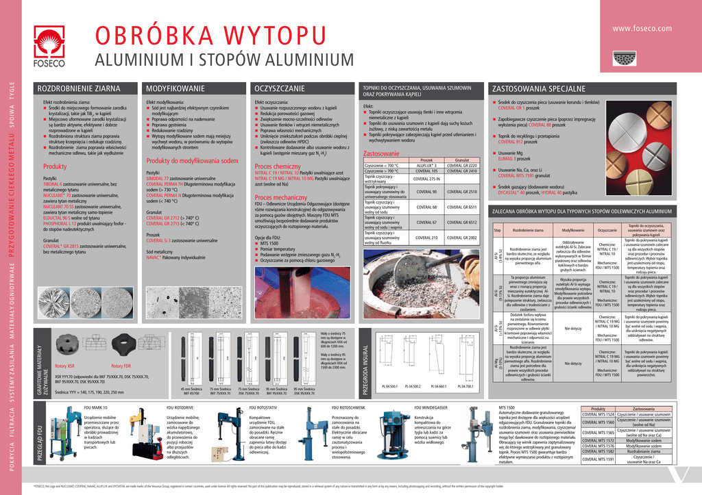 Obróbka wytopu www.foseco.com Efekt rozdrobnienia ziarna: nŚ rodki do miejscowego formowanie zarodka krystalizacji, takie jak TiB2, w kąpieli nM iejscowo uformowane zarodki krystalizacji są bardzo aktywne, efektywne i dobrze rozprowadzone w kąpieli nR ozdrobniona struktura ziarna poprawia strukturę krzepnięcia i redukuje rzadziznę. nR ozdrobnienie ziarna poprawia właściwości mechaniczne odlewu, takie jak wydłużenie Modyfikowanie Oczyszczanie Efekt modyfikowania: nS ód jest najbardziej efektywnym czynnikiem modyfikującym nP oprawa odporności na naderwanie nP oprawa gęstnienia nR edukowanie rzadzizny nW ytopy modyfikowane sodem mają mniejszy wychwyt wodoru, w porównaniu do wytopów modyfikowanych strontem Efekt oczyszczania: nU suwanie rozpuszczonego wodoru z kąpieli nR edukcja porowatości gazowej nZ większenie mocno-szczelności odlewów nU suwanie tlenków i wtrąceń niemetalicznych nP oprawa własności mechanicznych nU niknięcie zniekształceń podczas obróbki cieplnej (zwłaszcza odlewów HPDC) nK ontrolowane dodawanie albo usuwanie wodoru z kąpieli (wstępnie mieszany gaz N2-H2) Produkty do modyfikowania sodem Produkty Pastylki TIBORAL 6 zastosowanie uniwersalne, bez metalicznego tytanu NUCLEANT* 70 zastosowanie uniwersalne, zawiera tytan metaliczny NUCLEANT 70 SS zastosowanie uniwersalne, zawiera tytan metaliczny samo-topienie ELDUCTAL 90 S wolne od tytanu PHOSPHORAL L 12 produkt uwalniający fosfor do stopów nadeutektycznych Proces chemiczny Pastylki SIMODAL 77 zastosowanie uniwersalne COVERAL PERMA TH Długoterminowa modyfikacja sodem (> 730 °C) COVERAL PERMA N Długoterminowa modyfikacja sodem (< 740 °C) NITRAL C 19 / NITRAL 10 Pastylki uwalniające azot NITRAL C 19 MG / NITRAL 10 MG Pastylki uwalniające azot (wolne od Na) Proces mechaniczny FDU – Odlewnicze Urządzenia Odgazowujące (dostępne różne rozwiązania konstrukcyjne) do odgazowywania za pomocą gazów obojętnych. Maszyny FDU MTS umożliwiają bezpośrednie dodawanie produktów oczyszczających do roztopionego materiału. Granulat COVERAL GR 2712 (> 740° C) COVERAL GR 2715 (< 740° C) Proszek COVERAL Si 3 zastosowanie uniwersalne Opcje dla FDU: n MTS 1500 n Pomiar temperatury nPodawanie wstępnie zmieszanego gazu N2-H2 n Oczyszczanie za pomocą chloru gazowego Sód metaliczny NAVAC* Pakowany indywidualnie Efekt: n Topniki oczyszczające usuwają tlenki i inne wtrącenia niemetaliczne z kąpieli n Topniki do usuwania szumowin z kąpieli dają suchy kożuch żużlowy, z niską zawartością metalu n Topniki pokrywające zabezpieczają kąpiel przed utlenianiem i wychwytywaniem wodoru Zastosowanie Zastosowania specjalne nŚ rodek do czyszczenia pieca (usuwanie korundu i tlenków) COVERAL OR 1 proszek n Zapobiegawcze czyszczenie pieca (poprzez impregnację wyłożenia pieca) COVERAL 88 proszek n Topnik do recyklingu i przetapiania COVERAL 912 proszek n Usuwanie Mg Czyszczenie < 700 °C Czyszczenie > 700 °C Topnik czyszczący wstrzykiwany Topnik pokrywający i usuwający szumowiny do uniwersalnego stosowania Topnik czyszczący i usuwający szumowiny wolny od sodu Topnik czyszczący i usuwający szumowiny wolny od sodu i wapnia Topnik czyszczący i usuwający szumowiny wolny od fluorku Proszek ALUFLUX* 3 COVERAL 105 Granulat COVERAL GR 2220 COVERAL GR 2410 COVERAL 275 IN COVERAL 90 COVERAL GR 2510 COVERAL 68 COVERAL GR 6511 COVERAL 67 COVERAL GR 6512 ELIMAG 3 proszek n Usuwanie Na, Ca, oraz Li COVERAL MTS 1591 granulat n Środek gazujący (dodawanie wodoru) DYCASTAL* 40 proszek, HYDRAL 40 pastylka Zalecana obróbka wytopu dla typowych stopów odlewniczych aluminium Stop COVERAL 210 Wały o średnicy 95 mm są dostępne w długościach XXX od 1500 do 2300 mm. Rotory FDR XSR YYY.70 (odpowiedni dla BKF 75/XXX.70, DSK 75/XXX.70, BKF 95/XXX.70, DSK 95/XXX.70) Średnica: YYY = 140, 175, 190, 220, 250 mm TR 44 45 mm Średnica BKF 45/700 TR 70 75 mm Średnica BKF 75/XXX.70 TR 70 75 mm Średnica DSK 75/XXX.70 TR 70 95 mm Średnica BKF 95/XXX.70 TR 70 95 mm Średnica DSK 95/XXX.70 Al-Si (>13% Si) Wały o średnicy 75 mm są dostępne w długościach XXX od 600 do 1200 mm. Al-Mg (3-10%) Ø 95 Länge Länge Ø 95 Przegroda InsuraL Rotory XSR Ø 75 Länge Ø 75 700 Grafitowe materiały zużywalne Ø 45 PL 04.500.1 PL 04.500.2 Rozdrobnienie ziarna Modyfikowanie Rozdrobnienie ziarna jest bardzo skuteczne, ze względu na wysoka proporcję aluminium pierwotnego alfa. Oddziaływanie eutektyki Al-Si. Zalecane zwłaszcza dla odlewów wykonywanych w formie piaskowej oraz odlewów kokilowych o bardzo grubych ścianach. COVERAL GR 2002 Al-Si (9-13% Si) Granulat COVERAL* GR 2815 zastosowanie uniwersalne, bez metalicznego tytanu Topniki do oczyszczania, usuwania szumowin oraz pokrywania kąpieli Al-Si (3-8% Si) Rozdrobnienie ziarna Przegląd FDU P O KRY C IA F ILTRA C J A SYSTEMY ZASILANIA MATERIA Ł Y O G NI OTRWA Ł E PRZY G OTO WANIE C IEK Ł E G O METALU SP O IWA TY G LE aluminium i stopów aluminium PL 04.660.1 FDU MARK 10 FDU ROTODRIVE FDU ROTOSTATIV FDU ROTOSCHWENK FDU MINIDEGASSER Urządzenie mobilne przemieszczane przez operatora, służące do obróbki prowadzonej w kadziach transportowych lub piecach. Urządzenie mobilne, zamocowane do wózka napędzanego akumulatorowo, do przewożenia do pozycji roboczej albo przejazdów na dłuższych odległościach. Kompaktowe urządzenie FDU, zamocowane na stałe do posadzki. Ręcznie obracane ramię zapewnia łatwy dostęp do pieca albo do kadzi odlewniczej. Przeznaczony do zamocowania na stałe do posadzki. Elektrycznie obracane ramię w celu zautomatyzowania procesu i wielopołożeniowego stosowania. Konstrukcja kompaktowa do umieszczania na górze tygla lub kadzi za pomocą suwnicy lub wózka widłowego. Ta proporcja aluminium Wysoka proporcja pierwotnego zmniejsza się eutektyki Al-Si wymaga wraz z rosnącą proporcją zmodyfikowania wytopu. mieszaniny eutektycznej AlModyfikowanie potrzebne Si. Rozdrobnienie ziarna daje dla prawie wszystkich polepszenie strukt