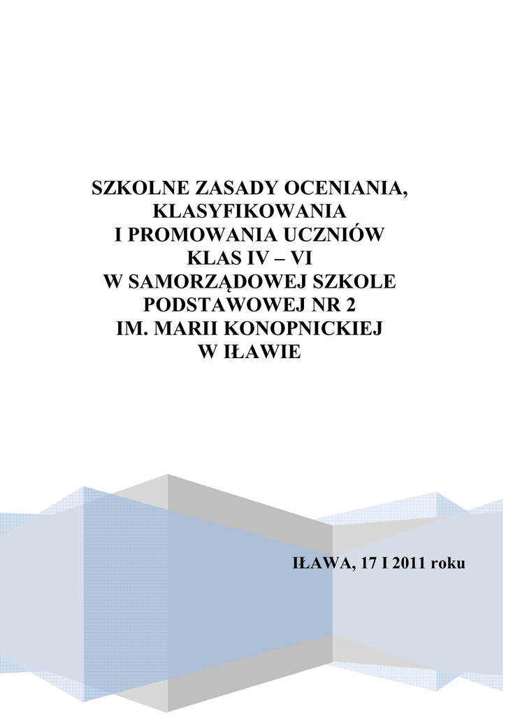 SZKOLNE ZASADY OCENIANIA, KLASYFIKOWANIA I PROMOWANIA UCZNIÓW KLAS IV – VI W SAMORZĄDOWEJ SZKOLE PODSTAWOWEJ NR 2 IM. MARII KONOPNICKIEJ W IŁAWIE IŁAWA, 17 I 2011 roku ZASADY OCENIANIA, KLASYFIKOWANIA I PROMOWANIA UCZNIÓW NAUCZANIA ZINTEGROWANEGO W SAMORZĄDOWEJ SZKOLE PODSTAWOWEJ NR 2 IM. MARII KONOPNICKIEJ W IŁAWIE ZASADY OCENIANIA, KLASYFIKOWANIA I PROMOWANIA UCZNIÓW KLAS IV - VI W SAMORZĄDOWEJ SZKOLE PODSTAWOWEJ NR 2 IM. MARII KONOPNICKIEJ W IŁAWIE I. PODSTAWA PRAWNA Zasady oceniania, klasyfikowania i promowania uczniów opracowano na podstawie Dz. U. Nr 156, poz. 1046 Rozporządzenie Ministra Edukacji Narodowej z dnia 20 sierpnia 2010 r. zmieniające rozporządzenie w sprawie warunków i sposobu oceniania, klasyfikowania i promowania uczniów, słuchaczy oraz przeprowadzania sprawdzianów i egzaminów w szkołach publicznych na podstawie art. 22 ust. 2 pkt 4 ustawy z dnia 7 września 1991 r. o systemie oświaty (Dz. U. z 2004 r. Nr 256 poz. 2572, z późn. zm.) w rozporządzeniu Ministra Edukacji Narodowej z dnia 30 kwietnia 2007 r. w sprawie warunków i sposobu oceniania, klasyfikowania i promowania uczniów i słuchaczy oraz przeprowadzaniu sprawdzianów i egzaminów w szkołach publicznych (Dz. U. Nr 83, poz. 562, z późn. zm.) Strona 2 z 21 ZASADY OCENIANIA, KLASYFIKOWANIA I PROMOWANIA UCZNIÓW KLAS IV - VI W SAMORZĄDOWEJ SZKOLE PODSTAWOWEJ NR 2 IM. MARII KONOPNICKIEJ W IŁAWIE II. ZASADY WEWNĄTRZSZKOLNEGO OCENIANIA POSTANOWIENIA OGÓLNE 1. Zasady wewnątrzszkolnego oceniania precyzują i ujednolicają sposoby oceniania stosowane przez wszystkich nauczycieli Samorządowej Szkoły Podstawowej nr 2 w Iławie. 2. Ocenianie to proces gromadzenia informacji o postępach i osiągnięciach ucznia, to integralny i naturalny element uczenia się i nauczania. 3. Ocenianie wewnątrzszkolne ma na celu: 1) poinformowanie ucznia o poziomie jego osiągnięć edukacyjnych i jego zachowaniu oraz o postępach w tym zakresie; 2) rozpoznawanie potrzeb każdego ucznia i pomoc w samodzielnym planowaniu jego rozwoju; 3) motywowanie ucznia do dalszych postępów i wspieranie jego działań; 4) dostarczenie rodzicom / prawnym opiekunom i nauczycielom informacji o postępach, trudnościach w nauce, zachowaniu oraz specjalnych uzdolnieniach ucznia; 5) planowanie oraz doskonalenie organizacji i metod pracy dydaktycznowychowawczej; 6) określenie efektywności stosowanych metod pracy. 4. Ocenianie wewnątrzszkolne obejmuje: • formułowanie wymagań edukacyjnych niezbędnych do uzyskania śródrocznych i rocznych ocen klasyfikacyjnych; • ustalenie kryteriów oceniania zachowania; • ocenianie bieżące i ustalanie śródrocznych i rocznych ocen klasyfikacyjnych z obowiązkowych i dodatkowych zajęć edukacyjnych oraz śródrocznej i rocznej oceny klasyfikacyjnej zachowania; • przeprowadzanie egzaminów klasyfikacyjnych; Strona 3 z 21 ZASADY OCENIANIA, KLASYFIKOWANIA I PROMOWANIA UCZNIÓW KLAS IV - VI W SAMORZĄDOWEJ SZKOLE PODSTAWOWEJ NR 2 IM. MARII KONOPNICKIEJ W IŁAWIE • ustalanie warunków i trybu uzyskania wyższych niż przewidywane śródrocznych i rocznych ocen klasyfikacyjnych z obowiązkowych i dodatkowych zajęć edukacyjnych oraz rocznej oceny klasyfikacyjnej zachowania; • ustalenie warunków i sposobu przekazywania rodzicom / prawnym opiekunom informacji o postępach i trudnościach ucznia w nauce. 5. Każda ocena jest jawna, zarówno dla uczniów, jak i rodziców / prawnych opiekunów i na ich prośbę nauczyciel ustalający ocenę powinien ją uzasadnić. 6. Ocena powinna być zależna od możliwości intelektualnych ucznia, tak aby uwzględniała jego wkład pracy. 7. Każdy uczeń może demonstrować swą wiedzę i umiejętności różnymi metodami i w różny sposób, mając prawo do wyboru swojej własnej drogi. Nauczyciel powinien brać pod uwagę, z jakim typem ucznia ma do czynienia (wzrokowiec, słuchowiec, uczuciowiec), dostosowując do niego metody i formy uczenia, sposoby oceniania. Strona 4 z 21 ZASADY OCENIANIA, KLASYFIKOWANIA I PROMOWANIA UCZNIÓW KLAS IV - VI W SAMORZĄDOWEJ SZKOLE PODSTAWOWEJ NR 2 IM. MARII KONOPNICKIEJ W IŁAWIE WYMAGANIA EDUKACYJNE: 1. OGÓLNE Uczeń kończący szkołę podstawową powinien posiadać umiejętności: • planowania, organizowania i oceniania własnego uczenia się (własnej pracy) • skutecznego komunikowania się w różnych sytuacjach (w zakresie mówienia, czytania, pisania) • efektywnego współdziałania w szkole • rozwiązywania problemów w sposób twórczy • pozyskiwania informacji z różnych źródeł • posługiwania się technologią informacyjną • wykorzystywania zdobytej wiedzy w praktyce • odkrywania, formułowania i rozumienia problemów, poszukiwania różnych dróg ich rozwiązania • syntetyzowania właściwości poznanej rzeczywistości, dokonywania porównań, poszukiwanie analogii, wartościowania rzeczy, zjawisk, ludzi i poszerzania wiedzy o nich • właściwego interpretowania, wydarzeń z życia rodzinnego, środowiska lokalnego i otoczenia kulturowego 2. SZCZEGÓŁOWE Kryteria (wymagania) edukacyjne szczegółowe ustalają nauczyciele poszczególnych przedmiotów (bloków przedmiotowych) zgodnie z podstawą programową oraz ustalonymi kryteriami ogólnoszkolnymi. Strona 5 z 21 ZASADY OCENIANIA, KLASYFIKOWANIA I PROMOWANIA UCZNIÓW KLAS IV - VI W SAMORZĄDOWEJ SZKOLE PODSTAWOWEJ NR 2 IM. MARII KONOPNICKIEJ W IŁAWIE PROMOWANIE 1. Uczeń klasy I – III otrzymuje promocję do klasy programowo wyższej. 2. Ucznia klasy I – III decyzją rady pedagogicznej można pozostawić na drugi rok w tej samej klasie tylko w wyjątkowych przypadkach, na wniosek wychowawcy klasy oraz po zasięgnięciu opinii rodziców / prawnych opiekunów dziecka. 1) W przypadku zagrożenia konieczna jest opinia specjalistów niezależnego zespołu powołanego przez dyrektora szkoły. 3. Na wniosek rodziców / prawnych opiekunów i po uzyskaniu zgody wychowawcy klasy lub na wniosek wychowawcy klasy i po uzysk
