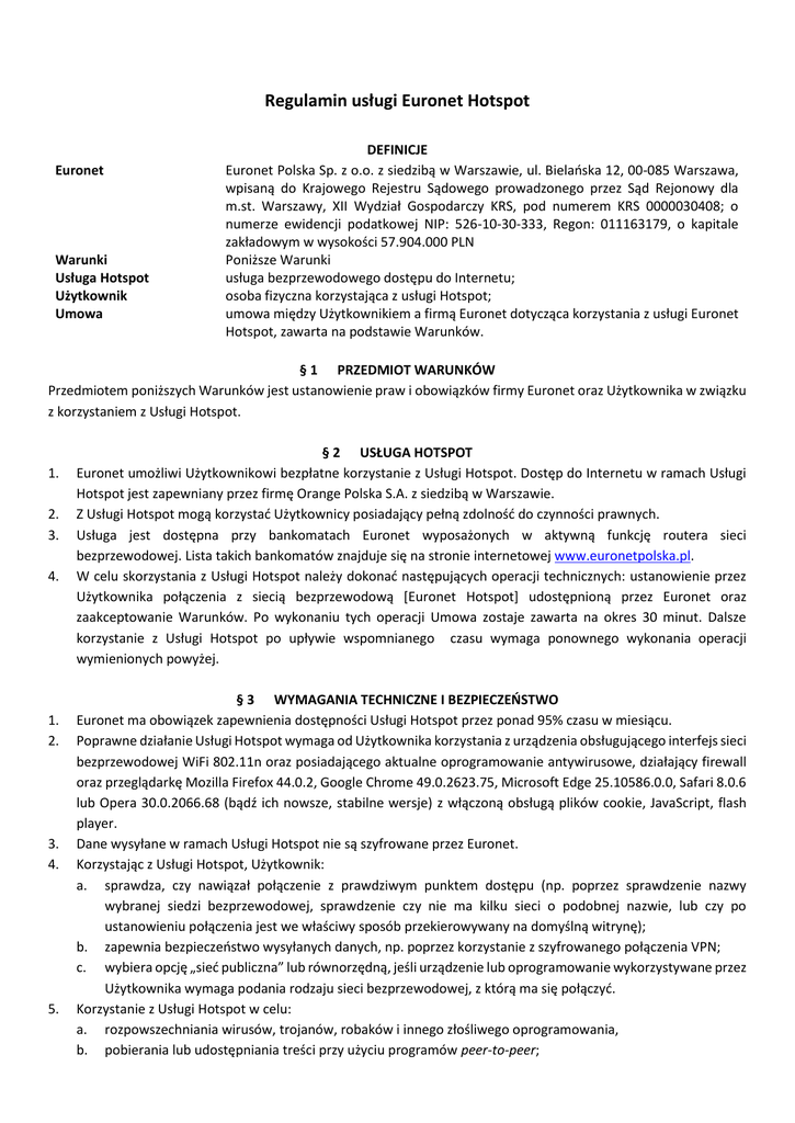 Regulamin usługi Euronet Hotspot Euronet Warunki Usługa Hotspot Użytkownik Umowa DEFINICJE Euronet Polska Sp. z o.o. z siedzibą w Warszawie, ul. Bielańska 12, 00-085 Warszawa, wpisaną do Krajowego Rejestru Sądowego prowadzonego przez Sąd Rejonowy dla m.st. Warszawy, XII Wydział Gospodarczy KRS, pod numerem KRS 0000030408; o numerze ewidencji podatkowej NIP: 526-10-30-333, Regon: 011163179, o kapitale zakładowym w wysokości 57.904.000 PLN Poniższe Warunki usługa bezprzewodowego dostępu do Internetu; osoba fizyczna korzystająca z usługi Hotspot; umowa między Użytkownikiem a firmą Euronet dotycząca korzystania z usługi Euronet Hotspot, zawarta na podstawie Warunków. § 1 PRZEDMIOT WARUNKÓW Przedmiotem poniższych Warunków jest ustanowienie praw i obowiązków firmy Euronet oraz Użytkownika w związku z korzystaniem z Usługi Hotspot. 1. 2. 3. 4. 1. 2. 3. 4. 5. § 2 USŁUGA HOTSPOT Euronet umożliwi Użytkownikowi bezpłatne korzystanie z Usługi Hotspot. Dostęp do Internetu w ramach Usługi Hotspot jest zapewniany przez firmę Orange Polska S.A. z siedzibą w Warszawie. Z Usługi Hotspot mogą korzystać Użytkownicy posiadający pełną zdolność do czynności prawnych. Usługa jest dostępna przy bankomatach Euronet wyposażonych w aktywną funkcję routera sieci bezprzewodowej. Lista takich bankomatów znajduje się na stronie internetowej www.euronetpolska.pl. W celu skorzystania z Usługi Hotspot należy dokonać następujących operacji technicznych: ustanowienie przez Użytkownika połączenia z siecią bezprzewodową [Euronet Hotspot] udostępnioną przez Euronet oraz zaakceptowanie Warunków. Po wykonaniu tych operacji Umowa zostaje zawarta na okres 30 minut. Dalsze korzystanie z Usługi Hotspot po upływie wspomnianego czasu wymaga ponownego wykonania operacji wymienionych powyżej. § 3 WYMAGANIA TECHNICZNE I BEZPIECZEŃSTWO Euronet ma obowiązek zapewnienia dostępności Usługi Hotspot przez ponad 95% czasu w miesiącu. Poprawne działanie Usługi Hotspot wymaga od Użytkownika korzystania z urządzenia obsługującego interfejs sieci bezprzewodowej WiFi 802.11n oraz posiadającego aktualne oprogramowanie antywirusowe, działający firewall oraz przeglądarkę Mozilla Firefox 44.0.2, Google Chrome 49.0.2623.75, Microsoft Edge 25.10586.0.0, Safari 8.0.6 lub Opera 30.0.2066.68 (bądź ich nowsze, stabilne wersje) z włączoną obsługą plików cookie, JavaScript, flash player. Dane wysyłane w ramach Usługi Hotspot nie są szyfrowane przez Euronet. Korzystając z Usługi Hotspot, Użytkownik: a. sprawdza, czy nawiązał połączenie z prawdziwym punktem dostępu (np. poprzez sprawdzenie nazwy wybranej siedzi bezprzewodowej, sprawdzenie czy nie ma kilku sieci o podobnej nazwie, lub czy po ustanowieniu połączenia jest we właściwy sposób przekierowywany na domyślną witrynę); b. zapewnia bezpieczeństwo wysyłanych danych, np. poprzez korzystanie z szyfrowanego połączenia VPN; c. wybiera opcję „sieć publiczna” lub równorzędną, jeśli urządzenie lub oprogramowanie wykorzystywane przez Użytkownika wymaga podania rodzaju sieci bezprzewodowej, z którą ma się połączyć. Korzystanie z Usługi Hotspot w celu: a. rozpowszechniania wirusów, trojanów, robaków i innego złośliwego oprogramowania, b. pobierania lub udostępniania treści przy użyciu programów peer-to-peer; c. 6. 1. 2. 3. 1. 2. 3. pobierania, rozpowszechniania lub przeglądania treści o charakterze pornograficznym, propagującym nienawiść, naruszającym prawa osób trzecich (włącznie z ich dobrami osobistymi i prawami własności intelektualnej) lub innych treści zabronionych przez prawo; d. rozpowszechniania treści promujących ideologię nazistowską, komunistyczną lub apartheidu, kwestionujących prawdę historyczną i promujących bądź instruujących w sprawie zachowania niezgodnego z prawem lub zagrażającego zdrowiu i życiu ludzkiemu (np. pro-ana, wspomagane samobójstwo); e. angażowania się w działalność hakerów, haktywistów bądź crackerów, uzyskiwania nieupoważnionego dostępu do systemów przekazywania danych, nagabywania, nękania, wysyłania niezamawianych treści reklamowych, oferowania prostytucji, handlu lekami, alkoholem, nielegalnymi towarami (narkotykami, bronią, dopalaczami) lub wyłączonymi z handlu (tkanki lub organy ludzkie) bądź wykonywania innych działań sprzecznych z prawem lub działań zabronionych Użytkownikowi zgodnie z prawem; f. związanym z hazardem lub grami hazardowymi; g. „wydobywania” wirtualnych walut, udostępniania połączenia osobom trzecim oraz wykonywania innych działań mogących powodować przeciążenie sieci jest zabronione. Dla celów komunikacji z Użytkownikiem Euronet może w trakcie korzystania przez Użytkownika z Usługi Hotspot włączyć system komunikatów w urządzeniu lub oprogramowaniu wykorzystywanym przez Użytkownika. § 4 DANE OSOBOWE I PLIKI COOKIE Administratorem danych osobowych Użytkownika, przetwarzanych w związku z korzystaniem z Usługi Hotspot, jest Euronet Polska sp. z o.o. z siedzibą w Warszawie (00-085), ul. Bielańska 12. Dane osobowe są przetwarzane w celu świadczenia Usługi Hotspot oraz do celów marketingowych Euronet. W celu świadczenia Usługi Hotspot dane są udostępniane spółce Orange Polska S.A. z siedzibą w Warszawie. Użytkownik ma prawo do wglądu w swoje dane oraz do poprawienia ich. Podanie danych osobowych jest dobrowolne, jednak konieczne dla świadczenia Usługi Hotspot. Jeśli Użytkownik wyrazi oddzielną zgodę na przetwarzanie danych osobowych, Euronet może przetwarzać dane osobowe Użytkownika w zakresie objętym taką zgodą. Euronet informuje, że: a. w trakcie korzystania z Usługi Hotspot przez Użytkownika Euronet może zapisywać i przechowywać na urządzeniu Użytkownika pliki cookie, tj. małe pliki tekstowe wykorzystywane przez funkcje Usługi Hotspot do celów analitycznych i statystycznych oraz do celów dopasowania 