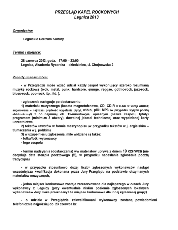PRZEGLĄD KAPEL ROCKOWYCH Legnica 2013 Organizator: Legnickie Centrum Kultury Termin i miejsce: 28 czerwca 2013, godz. 17:00 – 23:00 Legnica, Akademia Rycerska – dziedziniec, ul. Chojnowska 2 Zasady uczestnictwa: - w Przeglądzie może wziąć udział każdy zespół wykonujący szeroko rozumianą muzykę rockową (rock, metal, punk, hardcore, grunge, reggae, gothic-rock, jazz-rock, blues-rock, pop-rock, itp., itd. ), - zgłoszenie następuje po dostarczeniu: 1) materiału muzycznego (kaseta magnetofonowa, CD, CD-R /TYLKO w wersji AUDIO; sugerowana – najniższa prędkość wypalania płyty/, wideo, pliki MP3 /w przypadku wysyłki pocztą elektroniczną/) z co najmniej ok. 15-minutowym, opisanym (nazwa zespołu, tytuły) programem (minimum 3 utwory), dowolnej jakości technicznej oraz wypełnionej karty uczestnictwa, 2) tekstów utworów w formie maszynopisu (w przypadku tekstów w j. angielskim – tłumaczenia w j. polskim) 3) w uzupełnieniu zgłoszenia, mile widziane są także: - fotka/fotki wykonawcy - logo zespołu - termin nadsyłania (dostarczania) ww materiałów upływa z dniem 19 czerwca (nie decyduje data stempla pocztowego (!!), w przypadku nadesłania zgłoszenia pocztą tradycyjną) - w przypadku stosunkowo dużej liczby zgłoszonych wykonawców nastąpi wcześniejsza kwalifikacja dokonana przez Jury Przeglądu na podstawie otrzymanych materiałów muzycznych, - jedno miejsce konkursowe zostaje zarezerwowane dla najlepszego w oczach Jury wykonawcy z Legnicy (przy ewentualnie niskim poziomie zgłoszonych lokalnych wykonawców Jury może przeznaczyć to miejsce konkursowe dla innej zgłoszonej grupy) - o udziale w Przeglądzie zakwalifikowani wykonawcy zostaną powiadomieni telefonicznie najpóźniej do 23 czerwca br. - podczas Przeglądu zespołom będzie przysługiwało maksymalnie 30 minut na scenie (prezentacja łącznie z zainstalowaniem się na scenie oraz zejściem ze sceny). Nagrody: - Jury przyzna następujące nagrody: 4.000 zł dla zwycięskiego wykonawcy (Jury zastrzega sobie prawo do innego podziału nagród). Sprawy organizacyjne: - karty uczestnictwa wraz z materiałami „demo” należy dostarczyć (przesłać) na adres: Legnickie Centrum Kultury ul. Chojnowska 2, pokój 127 59-220 Legnica lub w formie elektronicznej na adres: [email protected] - organizatorzy zapewniają w czasie prób i występów profesjonalne nagłośnienie: „przody” i „tyły” /istnieje możliwość użycia własnych wzmacniaczy/ oraz perkusję (osprzęt do perkusji: stopa, werbel, blachy każdy perkusista musi mieć swoje). Dane wzmacniaczy oraz perkusji zostaną przekazane w późniejszym terminie zakwalifikowanym zespołom, - losowanie kolejności występów zakwalifikowanych wykonawców, ze względów organizacyjnych zostanie przeprowadzone zaocznie najpóźniej do 25 czerwca i do tego czasu wszyscy zainteresowani zostaną powiadomieni o jego wynikach (godziny prób i występów konkursowych), - próby zespołów zaplanowano w godz. 14:00 – 16:30 (dokładne godziny rozpoczęcia próby zostaną podane najpóźniej do 25 czerwca). - przesłuchania konkursowe odbędą się między 17:00 a 21:00 (8 wykonawców po 30 minut, włącznie z zainstalowaniem się na scenie, wykonaniem programu konkursowego i zejściem ze sceny) - jury będzie obradować między 21:00 a 21:45, po czym nastąpi ogłoszenie wyników i wręczenie nagród - na zakończenie imprezy, jako gość Przeglądu wystąpi zespół Tomek Lipiński & TILT. Postanowienia końcowe: - podpisanie karty uczestnictwa jest równoznaczne z wyrażeniem zgody na warunki zawarte w regulaminie, - uczestnicy przyjeżdżają na koszt własny - organizator zapewnia sobie prawo do ostatecznej interpretacji regulaminu jak i zmian w programie imprezy - sprawy nie ujęte w regulaminie rozstrzyga organizator w porozumieniu z Jury. Legnickie Centrum Kultury, ul. Chojnowska 2, 59-220 Legnica /76/ 72-33-710, -700; 781-612-983; [email protected] ; www.lck.art.pl