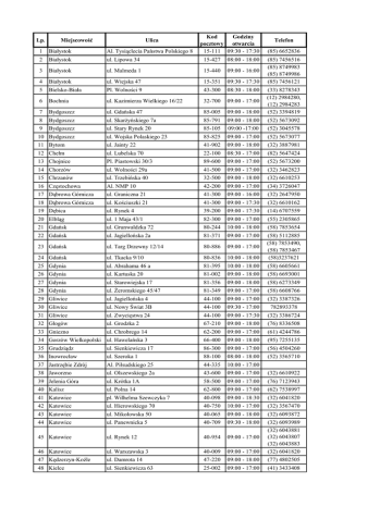 Lp. Miejscowość Ulica Kod pocztowy Godziny otwarcia Telefon 1