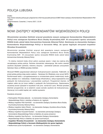 POLICJA LUBUSKA Źródło: http://www.lubuska.policja.gov.pl/go/serwis-informacyjny/aktualnosci/15807,Nowi-zastepcy-Komendantow-Wojewodzkich-Poli cji.html Wygenerowano: Czwartek, 2 marca 2017, 13:19 NOWI ZASTĘPCY KOMENDANTÓW WOJEWÓDZKICH POLICJI Wiceminister Jarosław Zieliński wręczył powołania nowym zastępcom Komendantów Wojewódzkich Policji oraz zastępcom Dyrektora Biura Służby Kryminalnej KGP. W uroczystości oprócz wiceszefa MSWiA brało udział także kierownictwo Komendy Głównej Policji. Nominację na stanowisko Zastępcy Komendanta Wojewódzkiego Policji w Gorzowie Wlkp. do spraw logistyki otrzymał inspektor Mirosław Kruszelnicki. Wiceminister Jarosław Zieliński wręczył dziś powołania nowym zastępcom Komendantów Wojewódzkich Policji oraz zastępcom Dyrektora Biura Służby Kryminalnej KGP. W uroczystości oprócz wiceszefa MSWiA brało udział także kierownictwo Komendy Głównej Policji. - To istotny moment kiedy oficer policji uzyskuje awans i staje się częścią elity zarządzającą polską policją. Państwa stanowiska zobowiązują. Nie wolno zawieść zaufania obywateli państwa, któremu służymy – powiedział podczas uroczystości Sekretarz Stanu w MSWiA Jarosław Zieliński. Wiceszef MSWiA pogratulował zebranym funkcjonariuszom awansów. Podkreślił, że przed polską policją stoją ważne zadania – Światowe Dni Młodzieży oraz szczyt NATO. Poinformował także, o przygotowywanym w ministerstwie planie modernizacji służb, który zakłada m.in. rozbudowę i modernizację infrastruktury, zakup wyposażenia oraz podwyżki dla funkcjonariuszy i pracowników cywilnych. Przypomniał również, że rządowi udało się już teraz zadbać o podwyżki dla funkcjonariuszy. Zaplanowany wcześniej wzrost uposażeń w wysokości 4,61 proc. wzrósł do 5 proc. Minister Jarosław Zieliński przypomniał, że w ostatnim czasie wzrosło zaufanie do funkcjonariuszy. Zaznaczył, że to wielki kapitał, ale i wielkie wyzwanie. Powołania otrzymali: ● Podinspektor Mirosław Jedynak – na stanowisko Zastępcy Komendanta Wojewódzkiego Policji z siedzibą w Radomiu ds. logistyki, ● Młodszy inspektor Piotr Kamiński – na stanowisko Zastępcy Dyrektora Biura Służby Kryminalnej Komendy Głównej Policji, ● Młodszy inspektor Adam Pilarek – na stanowisko Zastępcy Dyrektora Biura Służby Kryminalnej Komendy Głównej Policji, ● Młodszy inspektor Krzysztof Kozelan – na stanowisko pierwszego Zastępcy Komendanta Wojewódzkiego Policji w Gdańsku do spraw prewencji. ● Młodszy inspektor Ewa Pachura – na stanowisko Zastępcy Komendanta Wojewódzkiego Policji w Gdańsku do spraw kryminalnych, ● Inspektor Mirosław Kruszelnicki – na stanowisko Zastępcy Komendanta Wojewódzkiego Policji w Gorzowie Wielkopolskim do spraw logistyki, ● Nadkomisarz Jacek Kumpiałowski – na stanowisko Zastępcy Komendanta Wojewódzkiego Policji w Białymstoku do spraw prewencji, ● Inspektor Piotr Mąka – na stanowisko Zastępcy Komendanta Wojewódzkiego Policji w Poznaniu ds. kryminalnych, ● Młodszy inspektor Robert Nowakowski – na stanowisko Zastępcy Komendanta Wojewódzkiego Policji w Krakowie ds. logistyki, ● Młodszy inspektor Zbigniew Sowa – na stanowisko Zastępcy Komendanta Wojewódzkiego Policji w Rzeszowie do spraw prewencji, ● Inspektor Paweł Filipek - na stanowisko Zastępcy Komendanta Wojewódzkiego Policji w Rzeszowie do spraw kryminalnych, ● Młodszy inspektor Tadeusz Szymanek – na stanowisko Zastępcy Komendanta Wojewódzkiego Policji w Rzeszowie do spraw logistyki, ● Inspektor Dariusz Szelewicki – na stanowisko Zastępcy Komendanta Wojewódzkiego Policji w Opolu ds. prewencji, ● Młodszy inspektor Robert Szewc – na stanowisko Zastępcy Komendanta Wojewódzkiego Policji w Lublinie ds. prewencji, ● Młodszy inspektor Mirosław Elszkowski – na stanowisko Pierwszego Zastępcy Komendanta Wojewódzkiego Policji w Bydgoszczy ds. prewencji, ● Młodszy inspektor Marcin Woźniak - na stanowisko Zastępcy Komendanta Wojewódzkiego Policji w Bydgoszczy ds. logistyki. więcej zdjęć ► źródło: http://www.policja.pl/pol/aktualnosci/124229,Nowi-zastepcy-Komendantow-Wojewodzkich-Policji.html Ocena: 0/5 (0) Tweetnij