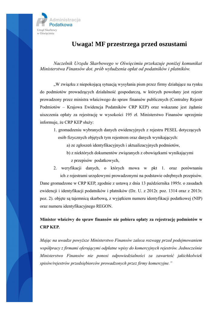 Urząd Skarbowy w Oświęcimiu Uwaga! MF przestrzega przed oszustami Naczelnik Urzędu Skarbowego w Oświęcimiu przekazuje poniżej komunikat Ministerstwa Finansów dot. prób wyłudzenia opłat od podatników i płatników. „W związku z niepokojącą sytuacją wysyłania pism przez firmy działające na rynku do podmiotów prowadzących działalność gospodarczą, w których powołany jest rejestr prowadzony przez ministra właściwego do spraw finansów publicznych (Centralny Rejestr Podmiotów – Krajowa Ewidencja Podatników CRP KEP) oraz wskazane jest żądanie uiszczenia opłaty za rejestrację w wysokości 195 zł. Ministerstwo Finansów uprzejmie informuje, że CRP KEP służy: 1. gromadzeniu wybranych danych ewidencyjnych z rejestru PESEL dotyczących osób fizycznych objętych tym rejestrem oraz danych wynikających: a) ze zgłoszeń identyfikacyjnych i aktualizacyjnych podmiotów, b) z niektórych dokumentów związanych z obowiązkami wynikającymi z przepisów podatkowych, 2. weryfikacji danych, o których mowa w pkt 1. oraz porównaniu ich z rejestrami urzędowymi prowadzonymi na podstawie odrębnych przepisów. Dane gromadzone w CRP KEP, zgodnie z ustawą z dnia 13 października 1995r. o zasadach ewidencji i identyfikacji podatników i płatników (Dz. U. z 2012r. poz. 1314 oraz z 2013r. poz. 2). objęte są tajemnicą skarbową, z wyjątkiem numeru identyfikacji podatkowej (NIP) oraz numeru identyfikacyjnego REGON. Minister właściwy do spraw finansów nie pobiera opłaty za rejestrację podmiotów w CRP KEP. Mając na uwadze powyższe Ministerstwo Finansów zaleca rozwagę przed podejmowaniem współpracy z firmami oferującymi odpłatne wpisy do komercyjnych rejestrów. Jednocześnie Ministerstwo Finansów nie ponosi odpowiedzialności za zawartość jakichkolwiek spisów/rejestrów przedsiębiorców prowadzonych przez firmy komercyjne.”