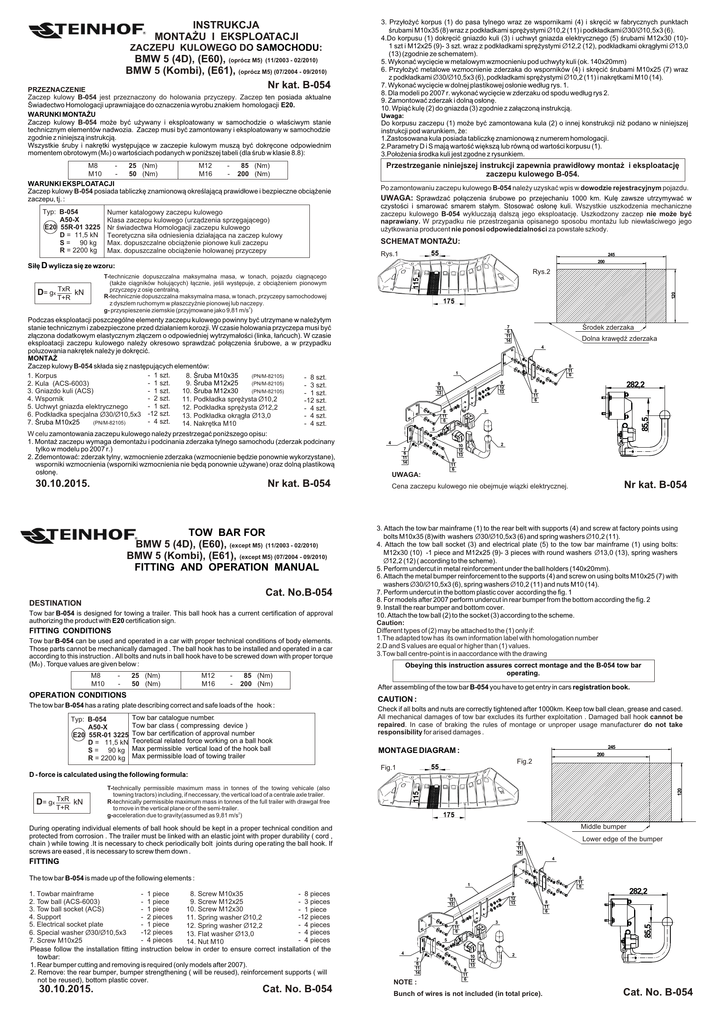 INSTRUKCJA MONTA¯U I EKSPLOATACJI ZACZEPU KULOWEGO DO SAMOCHODU: BMW 5 (4D), (E60), (oprócz M5) (11/2003 - 02/2010) BMW 5 (Kombi), (E61), (oprócz M5) (07/2004 - 09/2010) Nr kat. B-054 PRZEZNACZENIE Zaczep kulowy B-054 jest przeznaczony do holowania przyczepy. Zaczep ten posiada aktualne Œwiadectwo Homologacji uprawniaj¹ce do oznaczenia wyrobu znakiem homologacji E20. WARUNKI MONTA¯U Zaczep kulowy B-054 mo¿e byæ u¿ywany i eksploatowany w samochodzie o w³aœciwym stanie technicznym elementów nadwozia. Zaczep musi byæ zamontowany i eksploatowany w samochodzie zgodnie z niniejsz¹ instrukcj¹. Wszystkie œruby i nakrêtki wystêpuj¹ce w zaczepie kulowym musz¹ byæ dokrêcone odpowiednim momentem obrotowym (Mo) o wartoœciach podanych w poni¿szej tabeli (dla œrub w klasie 8.8): M8 25 (Nm) M12 85 (Nm) M10 50 (Nm) M16 - 200 (Nm) WARUNKI EKSPLOATACJI Zaczep kulowy B-054 posiada tabliczkê znamionow¹ okreœlaj¹c¹ prawid³owe i bezpieczne obci¹¿enie zaczepu, tj. : Typ: B-054 A50-X E20 55R-01 3225 D = 11,5 kN S = 90 kg R = 2200 kg Numer katalogowy zaczepu kulowego Klasa zaczepu kulowego (urz¹dzenia sprzêgaj¹cego) Nr œwiadectwa Homologacji zaczepu kulowego Teoretyczna si³a odniesienia dzia³aj¹ca na zaczep kulowy Max. dopuszczalne obci¹¿enie pionowe kuli zaczepu Max. dopuszczalne obci¹¿enie holowanej przyczepy Si³ê D wylicza siê ze wzoru: 3. Przy³o¿yæ korpus (1) do pasa tylnego wraz ze wspornikami (4) i skrêciæ w fabrycznych punktach œrubami M10x35 (8) wraz z podk³adkami sprê¿ystymi Ø10,2 (11) i podk³adkami Ø30/Ø10,5x3 (6). 4.Do korpusu (1) dokrêciæ gniazdo kuli (3) i uchwyt gniazda elektrycznego (5) œrubami M12x30 (10)1 szt i M12x25 (9)- 3 szt. wraz z podk³adkami sprê¿ystymi Ø12,2 (12), podk³adkami okr¹g³ymi Ø13,0 (13) (zgodnie ze schematem). 5. Wykonaæ wyciêcie w metalowym wzmocnieniu pod uchwyty kuli (ok. 140x20mm) 6. Przy³o¿yæ metalowe wzmocnienie zderzaka do wsporników (4) i skrêciæ œrubami M10x25 (7) wraz z podk³adkami Ø30/Ø10,5x3 (6), podk³adkami sprê¿ystymi Ø10,2 (11) i nakrêtkami M10 (14). 7. Wykonaæ wyciêcie w dolnej plastikowej os³onie wed³ug rys. 1. 8. Dla modeli po 2007 r. wykonaæ wyciêcie w zderzaku od spodu wed³ug rys 2. 9. Zamontowaæ zderzak i doln¹ os³onê. 10. Wpi¹æ kulê (2) do gniazda (3) zgodnie z za³¹czon¹ instrukcj¹. Uwaga: Do korpusu zaczepu (1) mo¿e byæ zamontowana kula (2) o innej konstrukcji ni¿ podano w niniejszej instrukcji pod warunkiem, ¿e: 1.Zastosowana kula posiada tabliczkê znamionow¹ z numerem homologacji. 2.Parametry D i S maj¹ wartoœæ wiêksz¹ lub równ¹ od wartoœci korpusu (1). 3.Po³o¿enia œrodka kuli jest zgodne z rysunkiem. Przestrzeganie niniejszej instrukcji zapewnia prawid³owy monta¿ i eksploatacjê zaczepu kulowego B-054. Po zamontowaniu zaczepu kulowego B-054 nale¿y uzyskaæ wpis w dowodzie rejestracyjnym pojazdu. UWAGA: Sprawdzaæ po³¹czenia œrubowe po przejechaniu 1000 km. Kulê zawsze utrzymywaæ w czystoœci i smarowaæ smarem sta³ym. Stosowaæ os³onê kuli. Wszystkie uszkodzenia mechaniczne zaczepu kulowego B-054 wykluczaj¹ dalsz¹ jego eksploatacjê. Uszkodzony zaczep nie mo¿e byæ naprawiany. W przypadku nie przestrzegania opisanego sposobu monta¿u lub niew³aœciwego jego u¿ytkowania producent nie ponosi odpowiedzialnoœci za powsta³e szkody. SCHEMAT MONTA¯U: Rys.1 Rys.1 245 200 Rys.2 T+R Podczas eksploatacji poszczególne elementy zaczepu kulowego powinny byæ utrzymane w nale¿ytym stanie technicznym i zabezpieczone przed dzia³aniem korozji. W czasie holowania przyczepa musi byæ z³¹czona dodatkowym elastycznym z³¹czem o odpowiedniej wytrzyma³oœci (linka, ³añcuch). W czasie eksploatacji zaczepu kulowego nale¿y okresowo sprawdzaæ po³¹czenia œrubowe, a w przypadku poluzowania nakrêtek nale¿y je dokrêciæ. MONTA¯ Zaczep kulowy B-054 sk³ada siê z nastêpuj¹cych elementów: - 1 szt. 8. Œruba M10x35 (PN/M-82105) 1. Korpus - 8 szt. - 1 szt. 9. Œruba M12x25 (PN/M-82105) 2. Kula (ACS-6003) - 3 szt. - 1 szt. 10. Œruba M12x30 (PN/M-82105) 3. Gniazdo kuli (ACS) - 1 szt. - 2 szt. 4. Wspornik 11. Podk³adka sprê¿ysta Ø10,2 -12 szt. - 1 szt. 5. Uchwyt gniazda elektrycznego 12. Podk³adka sprê¿ysta Ø12,2 - 4 szt. 6. Podk³adka specjalna Ø30/Ø10,5x3 -12 szt. 13. Podk³adka okr¹g³a Ø13,0 - 4 szt. - 4 szt. 7. Œruba M10x25 (PN/M-82105) 14. Nakrêtka M10 - 4 szt. W celu zamontowania zaczepu kulowego nale¿y przestrzegaæ poni¿szego opisu: 1. Monta¿ zaczepu wymaga demonta¿u i podcinania zderzaka tylnego samochodu (zderzak podcinany tylko w modelu po 2007 r.) 2. Zdemontowaæ: zderzak tylny, wzmocnienie zderzaka (wzmocnienie bêdzie ponownie wykorzystane), wsporniki wzmocnienia (wsporniki wzmocnienia nie bêd¹ ponownie u¿ywane) oraz doln¹ plastikow¹ os³onê. 30.10.2015. Nr kat. B-054 TOW BAR FOR BMW 5 (4D), (E60), (except M5) (11/2003 - 02/2010) BMW 5 (Kombi), (E61), (except M5) (07/2004 - 09/2010) FITTING AND OPERATION MANUAL Cat. No.B-054 DESTINATION Tow bar B-054 is designed for towing a trailer. This ball hook has a current certification of approval authorizing the product with E20 certification sign. FITTING CONDITIONS Tow bar B-054 can be used and operated in a car with proper technical conditions of body elements. Those parts cannot be mechanically damaged . The ball hook has to be installed and operated in a car according to this instruction . All bolts and nuts in ball hook have to be screwed down with proper torque (Mo) . Torque values are given below : M8 M10 - 25 (Nm) 50 (Nm) M12 M16 - 85 (Nm) 200 (Nm) OPERATION CONDITIONS The tow bar B-054 has a rating plate describing correct and safe loads of the hook : Typ: B-054 A50-X E20 55R-01 3225 D = 11,5 kN S = 90 kg R = 2200 kg Tow bar catalogue number. Tow bar class ( compressing device ) Tow bar certification of approval number Teoretical related force working on a ball hook Max permissible vertical load of the hook ball Max permissible load of towin