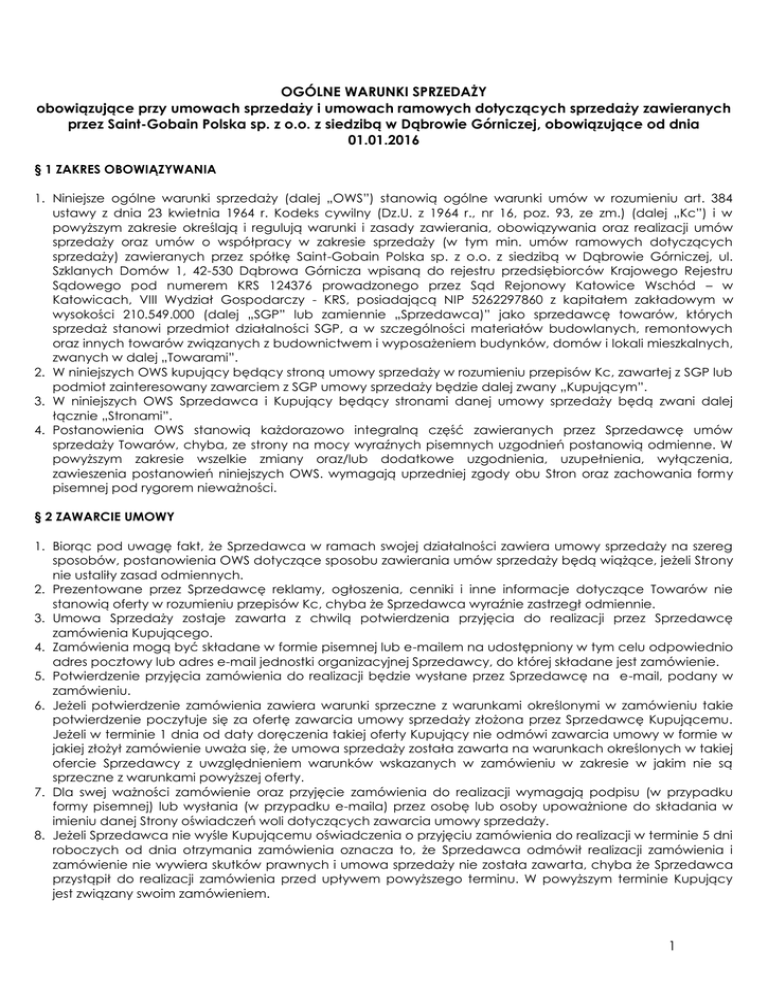 OGÓLNE WARUNKI SPRZEDAŻY obowiązujące przy umowach sprzedaży i umowach ramowych dotyczących sprzedaży zawieranych przez Saint-Gobain Polska sp. z o.o. z siedzibą w Dąbrowie Górniczej, obowiązujące od dnia 01.01.2016 § 1 ZAKRES OBOWIĄZYWANIA 1. Niniejsze ogólne warunki sprzedaży (dalej „OWS”) stanowią ogólne warunki umów w rozumieniu art. 384 ustawy z dnia 23 kwietnia 1964 r. Kodeks cywilny (Dz.U. z 1964 r., nr 16, poz. 93, ze zm.) (dalej „Kc”) i w powyższym zakresie określają i regulują warunki i zasady zawierania, obowiązywania oraz realizacji umów sprzedaży oraz umów o współpracy w zakresie sprzedaży (w tym min. umów ramowych dotyczących sprzedaży) zawieranych przez spółkę Saint-Gobain Polska sp. z o.o. z siedzibą w Dąbrowie Górniczej, ul. Szklanych Domów 1, 42-530 Dąbrowa Górnicza wpisaną do rejestru przedsiębiorców Krajowego Rejestru Sądowego pod numerem KRS 124376 prowadzonego przez Sąd Rejonowy Katowice Wschód – w Katowicach, VIII Wydział Gospodarczy - KRS, posiadającą NIP 5262297860 z kapitałem zakładowym w wysokości 210.549.000 (dalej „SGP” lub zamiennie „Sprzedawca)” jako sprzedawcę towarów, których sprzedaż stanowi przedmiot działalności SGP, a w szczególności materiałów budowlanych, remontowych oraz innych towarów związanych z budownictwem i wyposażeniem budynków, domów i lokali mieszkalnych, zwanych w dalej „Towarami”. 2. W niniejszych OWS kupujący będący stroną umowy sprzedaży w rozumieniu przepisów Kc, zawartej z SGP lub podmiot zainteresowany zawarciem z SGP umowy sprzedaży będzie dalej zwany „Kupującym”. 3. W niniejszych OWS Sprzedawca i Kupujący będący stronami danej umowy sprzedaży będą zwani dalej łącznie „Stronami”. 4. Postanowienia OWS stanowią każdorazowo integralną część zawieranych przez Sprzedawcę umów sprzedaży Towarów, chyba, ze strony na mocy wyraźnych pisemnych uzgodnień postanowią odmienne. W powyższym zakresie wszelkie zmiany oraz/lub dodatkowe uzgodnienia, uzupełnienia, wyłączenia, zawieszenia postanowień niniejszych OWS. wymagają uprzedniej zgody obu Stron oraz zachowania formy pisemnej pod rygorem nieważności. § 2 ZAWARCIE UMOWY 1. Biorąc pod uwagę fakt, że Sprzedawca w ramach swojej działalności zawiera umowy sprzedaży na szereg sposobów, postanowienia OWS dotyczące sposobu zawierania umów sprzedaży będą wiążące, jeżeli Strony nie ustaliły zasad odmiennych. 2. Prezentowane przez Sprzedawcę reklamy, ogłoszenia, cenniki i inne informacje dotyczące Towarów nie stanowią oferty w rozumieniu przepisów Kc, chyba że Sprzedawca wyraźnie zastrzegł odmiennie. 3. Umowa Sprzedaży zostaje zawarta z chwilą potwierdzenia przyjęcia do realizacji przez Sprzedawcę zamówienia Kupującego. 4. Zamówienia mogą być składane w formie pisemnej lub e-mailem na udostępniony w tym celu odpowiednio adres pocztowy lub adres e-mail jednostki organizacyjnej Sprzedawcy, do której składane jest zamówienie. 5. Potwierdzenie przyjęcia zamówienia do realizacji będzie wysłane przez Sprzedawcę na e-mail, podany w zamówieniu. 6. Jeżeli potwierdzenie zamówienia zawiera warunki sprzeczne z warunkami określonymi w zamówieniu takie potwierdzenie poczytuje się za ofertę zawarcia umowy sprzedaży złożona przez Sprzedawcę Kupującemu. Jeżeli w terminie 1 dnia od daty doręczenia takiej oferty Kupujący nie odmówi zawarcia umowy w formie w jakiej złożył zamówienie uważa się, że umowa sprzedaży została zawarta na warunkach określonych w takiej ofercie Sprzedawcy z uwzględnieniem warunków wskazanych w zamówieniu w zakresie w jakim nie są sprzeczne z warunkami powyższej oferty. 7. Dla swej ważności zamówienie oraz przyjęcie zamówienia do realizacji wymagają podpisu (w przypadku formy pisemnej) lub wysłania (w przypadku e-maila) przez osobę lub osoby upoważnione do składania w imieniu danej Strony oświadczeń woli dotyczących zawarcia umowy sprzedaży. 8. Jeżeli Sprzedawca nie wyśle Kupującemu oświadczenia o przyjęciu zamówienia do realizacji w terminie 5 dni roboczych od dnia otrzymania zamówienia oznacza to, że Sprzedawca odmówił realizacji zamówienia i zamówienie nie wywiera skutków prawnych i umowa sprzedaży nie została zawarta, chyba że Sprzedawca przystąpił do realizacji zamówienia przed upływem powyższego terminu. W powyższym terminie Kupujący jest związany swoim zamówieniem. 1 9. Sprzedawca uprawniony jest do wstrzymania albo odmowy realizacji zamówienia już potwierdzonego w przypadkach, na warunkach i zasadach określonych w niniejszych OWS. 10. Zamówienie musi zawierać co najmniej: dokładne określenie Kupującego (imię i nazwisko w przypadku konsumenta, firmę i dane rejestrowe w przypadku przedsiębiorcy), adres Kupującego, szczegółową specyfikację zamawianych Towarów (asortymentu), ich ilość, termin i miejsce odbioru/dostawy, formę i termin płatności w przypadku ich wcześniejszego ustalenia między Stronami. 11. W przypadku gdy składającym zamówienie jest osoba prawna lub jednostka organizacyjna nie posiadająca osobowości prawnej, w zamówieniu winna nadto zostać wskazana osoba fizyczna reprezentująca zamawiającego we wszelkich bieżących sprawach wynikających oraz/lub związanych z zawarciem lub wykonaniem umowy sprzedaży, a w szczególności uzupełnienia, ograniczenia, rozszerzenia, zmiany lub w inny sposób modyfikacji zamówienia, negocjowania cen towarów oraz/lub negocjowania warunków dostaw, dokonywania odbiorów towarów, zgłaszania reklamacji, podpisywania dokumentów, w tym odbioru i podpisywania faktur VAT. W powyższym względzie w przypadku braku odmiennych pisemnych zastrzeżeń w treści zamówienia, domniemywa się, że osoba wskazana w zamówieniu upoważniona jest do występowania w imieniu i na rzecz Kupującego w każdej kategorii spraw wynikających lub związanych z zawarciem lub wykonaniem umowy s