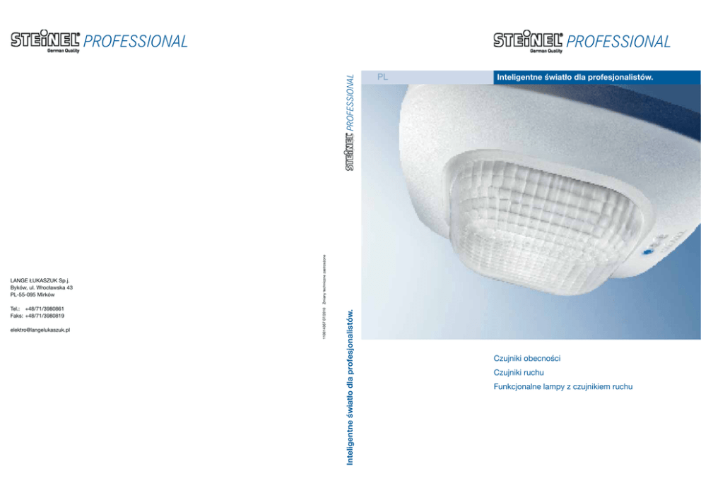 PROFESSIONAL Tel.: +48/71/3980861 Faks: +48/71/3980819 [email protected] Inteligentne światło dla profesjonalistów. LANGE ŁUKASZUK Sp.j. Byków, ul. Wrocławska 43 PL-55-095 Mirków 110014367 07/2010 Zmiany techniczne zastrzeżone PROFESSIONAL PROFESSIONAL PL Inteligentne światło dla profesjonalistów. Czujniki obecności Czujniki ruchu Funkcjonalne lampy z czujnikiem ruchu Przegląd produktów Czujniki ruchu Wewn. i zewn. Informacje strona 32 Czujniki ruchu 34 w zest. sensIQ Czujniki obecności System Control PRO Wewn. Informacje strona 68 Lampy z czujnikiem ruchu Wewn. * Informacje strona 116 42 44 44 46 48 50 52 IS 3180 IS 3360 IS 3360 ECO IS D3360 IS 345 IS 345 MX Highbay HF 3360 Presence Control PRO Czujnik dymu 84 86 88 90 104 IR Quattro HD IR Quattro HF 360 Dual HF Fire Control PRO Reflektory z czujnikiem ruchu Zewn. * Technika czujników na fale radiowe IMPULSER Wewn. i zewn. 122 122 122 122 122 RS PRO 500 Slave RS PRO 1000 sensor RS PRO 1000 Slave RS PRO 2000 Sensor RS PRO 2000 Slave Informacje Lampy z czujnikiem wysokiej częstotliwości 136 138 138 142 RS PRO DL 100 Sensor RS PRO DL 100 Slave RS PRO LED S1 Informacje Reflektor ledowy z czuj. ruchu strona 174 Air Control PRO Signal RS PRO 500 sensor RS PRO 5500 Slave Informacje 106 122 RS PRO 5500 Sensor strona 156 66 Lampy z czujnikiem wysokiej częstotliwości RS PRO Lampy z czujnikiem wysokiej częstotliwości RS PRO strona 136 Czujnik jakości powietrza Reflektor ledowy 144 146 148 148 RS 50 BRS 81 BRS 82 Reflektor halogenowy z czujnikiem ruchu 158 158 160 160 162 164 166 168 XLed 10 sensor XLed 25 sensor XLed-SL 10 XLed-SL 25 HS 502 HS 152 XENO HS 2160 HS-S 150 W Slave Nadajnik Odbiornik 176 177 178 179 179 180 181 182 Presence Control PRO IR Quattro Impulser IS-FS 300 RC 400 XLed-FE 10 XLed-FE 25 HS-FE 150 HS-FE 500 FE 8100 PROFESSIONAL Czujnik zmierzchowy 54 56 58 60 62 64 IS 2180-5 IS 2180-2 HF 3600 IS 300 IS D360 IS 2160 Czujniki obecności LuxMaster Wewn. strona 66 NightMatic 5000-2 STEINEL PROLog i RELUX Podczerwień 110 110 110 110 BLS BLS D BLS DF BLS T strona 16/18 PROLog, RELUX Informacj e Lampy z czujnikiem wysokiej częstotliwości RS PRO 116 132 132 132 132 132 132 132 132 RS PRO 5000 Sensor RS PRO 5000 Slave RS PRO 5002 Sensor z diodą LED RS PRO 5002 Slave z diodą LED RS PRO 5200 Sensor RS PRO 5200 Slave RS PRO 5100 Sensor RS PRO 5100 Slave 148 148 148 148 148 148 BRS 83 BRS 86 BRS 87 BRS 80 P z gniazdem BRS 83 P z gniazdem BRS 85 P z gniazdem * Ozdobne wewnętrzne lampy z czujnikiem są przedstawione w osobnym katalogu „Style” * Ozdobne zewnętrzne lampy z czujnikiem są przedstawione w osobnym katalogu „Style” Nadajnik-odbiornik 183 183 183 183 FE 8200 MF1 RS PRO 1000, 2000 + MF1 sensIQ + MF1 Pilot zdalnego sterowania (opcja) 3 Wynalazek firmy Steinel — w 1987 roku dotyczyło to pierwszej lampy z czujnikiem ruchu, a dziś — największej oferty technologii i produktów z zastosowaniem czujników. STEINEL Professional Czy to wynalezienie wówczas lampy z czujnikiem, czy współcześnie opracowanie czujników wysokiej częstotliwości — nasza obszerna, oparta na wieloletnim doświadczeniu i systematycznie rozwijana kompetencja w zakresie technologii czujników jest wyjątkowa. Jesteśmy kompleksowym dostawcą zautomatyzowanego, wydajnego sterowania oświetleniem. Już od ponad 50 lat ramię w ramię idą przy tym idea i wiedza, aby technika czujników i oświetlenia były pierwszą możliwą opcją dla elektroinstalatorów we wszystkich warunkach. Rozwiązanie potrzeb specjalistów Seria produktów STEINEL Professional obejmuje kompletną ofertę rozwiązań technologii czujników spełniających potrzeby profesjonalistów. Opracowujemy produkty i technologie dla określonych warunków oświetleniowych. Zrozumiałe, wyraźne koncepcje obsługi i praktyczny montaż są przy tym głównymi filarami naszych programów. Dzięki temu możemy udostępnić odpowiednie wyposażenie wszystkim, którzy każdego dnia pracują z wykorzystaniem naszych produktów, umożliwiających PORTRET 4 optymalne rozwiązanie wszystkich potrzeb w zakresie oświetlenia. Możliwość inteligentnego dopasowania Łączymy energooszczędność z komfortem i optymalizujemy każde rozwiązanie przez idealne dopasowanie odbiornika do rzeczywistego zapotrzebowania. Określamy to mianem „ekologicznej inteligencji”. Liczy się ona pod każdym względem: Użytkownik oszczędza koszty i siły – nasza technika samodzielnie reguluje całą resztę. STEINEL Professional. Inteligentne światło dla profesjonalistów. Spis treści PROFESSIONAL Przegląd produktów 2 Czujniki na podczerwień 22 Wprowadzenie 4 Czujniki wysokiej częstotliwości 24 Spis treści 5 Różnice między czujnikami ruchu a czujnikami obecności 26 Czujniki ruchu 28 Czujniki obecności 68 Wewnętrzne lampy z czujnikiem ruchu 112 Reflektory z czujnikiem 152 Technika czujników na fale radiowe (Impulser) 170 Pomoc techniczna/serwis 184 Filozofia 6 Jakość: Profesjonalizm od A do Z Nasza misja: Energooszczędność PROLog — analiza potencjalnych oszczędności Zaplanowana inteligencja — RELUX Professional Grupy produktów do automatyzacji oświetlenia 8 14 16 18 20 W osobnym katalogu „Style” zostały przedstawione inne ozdobne lampy z czujnikiem do zastosowań wewnętrznych i zewnętrznych. 5 Filozofia Aby stać się i utrzymać pozycje lidera technologicznego lidera, w ścisłej współpracy ze specjalistami z branży elektroinstalacyjnej wyznaczamy standardy w zakresie techniki i stylizacji, planowania, obliczeń i realizacji. Od idei po serwis Być technologicznym numerem 1 – ten cel daje nam siłę. Produkty STEINEL Professional były, są i będą motorem w dziedzinie techniki czujników. Oprócz samych funkcji na czele stoją stylizacja, planowanie, realizacja techniczna i serwis. To właśnie jest dla nas profesjonalnym partnerstwem na potrzeby inteligentnego oświetlenia. Pracujemy z ekspertami W ramach wymiany i współpracy z inżynie