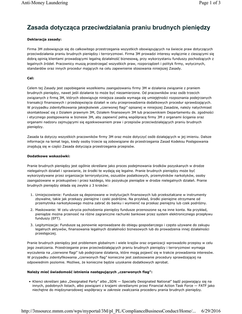 Anti-Money Laundering Page 1 of 3 Zasada dotycząca przeciwdziałania praniu brudnych pieniędzy Deklaracja zasady: Firma 3M zobowiązuje się do całkowitego przestrzegania wszystkich obowiązujących na świecie praw dotyczących przeciwdziałania praniu brudnych pieniędzy i terroryzmowi. Firma 3M prowadzi interesy wyłącznie z cieszącymi się dobrą opinią klientami prowadzącymi legalną działalność biznesową, przy wykorzystaniu funduszy pochodzących z legalnych źródeł. Pracownicy muszą przestrzegać wszystkich praw, rozporządzeń i polityk firmy, wytycznych, standardów oraz innych procedur mających na celu zapewnienie stosowania niniejszej Zasady. Cel: Celem tej Zasady jest zapobieganie wszelkiemu zaangażowaniu firmy 3M w działania związanie z praniem brudnych pieniędzy, nawet jeśli działanie to może być niezamierzone. Od pracowników oraz osób trzecich związanych z firmą 3M, których obowiązuje niniejsza zasada wymaga się umiejętności rozpoznania podejrzanych transakcji finansowych i przedsięwzięcia działań w celu przeprowadzenia dodatkowych procedur sprawdzających. W przypadku zidentyfikowania jakiejkolwiek „czerwonej flagi” opisanej w niniejszej Zasadzie, należy natychmiast skontaktować się z Działem prawnym 3M, Działem finansowym 3M lub pracownikiem Departamentu ds. zgodności i etycznego postępowania w biznesie 3M, aby zapewnić pełną współpracę firmy 3M z organami ścigania oraz organami nadzoru zajmującymi się egzekwowaniem praw i przepisów przeciwdziałających praniu brudnych pieniędzy. Zasada ta dotyczy wszystkich pracowników firmy 3M oraz może dotyczyć osób działających w jej imieniu. Dalsze informacje na temat tego, kiedy osoby trzecie są zobowiązane do przestrzegania Zasad Kodeksu Postępowania znajdują się w części Zasada dotycząca przestrzegania przepisów. Dodatkowe wskazówki: Pranie brudnych pieniędzy jest ogólnie określane jako proces podejmowania środków pozyskanych w drodze nielegalnych działań i sprawianie, że środki te wydają się legalne. Pranie brudnych pieniędzy może być wykorzystywane przez organizacje terrorystyczne, oszustów podatkowych, przemytników narkotyków, osoby zaangażowane w przekupstwo i przez każdego, kto pozyskuje pieniądze w drodze nielegalnych działań. Pranie brudnych pieniędzy składa się zwykle z 3 kroków: 1. Umiejscowienie: Fundusze są deponowane w instytucjach finansowych lub przekształcane w instrumenty zbywalne, takie jak przekazy pieniężne i czeki podróżne. Na przykład, środki pieniężne otrzymane od przemytnika narkotykowego można zabrać do banku i wymienić na przekaz pieniężny lub czek podróżny. 2. Maskowanie: W celu ukrycia pochodzenia pieniędzy fundusze przenoszone są na inne konta. Na przykład, pieniądze można przenosić na różne zagraniczne rachunki bankowe przez system elektronicznego przepływu funduszy (EFT). 3. Legitymizacja: Fundusze są ponownie wprowadzane do obiegu gospodarczego i często używane do zakupu legalnych aktywów, finansowania legalnych działalności biznesowych lub do prowadzenia innej działalności przestępczej. Pranie brudnych pieniędzy jest problemem globalnym i wiele krajów oraz organizacji wprowadziło przepisy w celu jego zwalczania. Przestrzeganie praw przeciwdziałających praniu brudnych pieniędzy i terroryzmowi wymaga wyczulenia na „czerwone flagi” lub podejrzane działania, które mogą pojawić się w trakcie prowadzenia interesów. W przypadku zidentyfikowania „czerwonych flag” konieczne jest zastosowanie procedury sprawdzającej na odpowiednim poziomie. Możliwe, że konieczne będzie uzyskanie dodatkowych aprobat. Należy mieć świadomość istnienia następujących „czerwonych flag”: • Klienci określani jako „Designated Party” albo „SDN — Specially Designated National” bądź pojawiający się na innych, podobnych listach, albo powiązani z krajami określanymi przez Financial Action Task Force — FATF jako niechętne do międzynarodowej współpracy w zakresie zwalczania procederu prania brudnych pieniędzy. http://3msource.mmm.com/wps/myportal/3M/pl_PL/ComplianceBusinessConduct/Home/... 6/29/2016 Anti-Money Laundering Page 2 of 3 • Klienci lub dostawcy, którzy niechętnie udzielają kompletnych informacji i/lub przekazują niewystarczające, fałszywe lub podejrzane informacje. • Klienci lub dostawcy, którzy wydają się działać jako agenci innej firmy lub indywidualnego zleceniodawcy, ale odmawiają lub niechętnie udzielają informacji dotyczących tejże firmy bądź indywidualnego zleceniodawcy. • Klienci lub dostawcy, którzy wyrażają swoje obawy albo którzy chcą uniknąć wymagań dotyczących raportowania lub prowadzenia rejestrów. • Płatności gotówką lub odpowiednikami gotówki, takimi jak przekazy pieniężne, czeki podróżne lub przedpłacone karty bankowe. Przyjmowanie gotówki jako formy płatności jest w firmie 3M zdecydowanie odradzane. Płatności gotówką są powszechne między osobami zajmującymi się praniem brudnych pieniędzy i nie pozostawiają niemal żadnych śladów w dziennikach nadzoru. Należy oferować alternatywne metody płatności, które są weryfikowalne w dziennikach nadzoru. Jeśli żadna inna metoda nie jest dostępna, należy podjąć kroki w celu zweryfikowania, czy otrzymywana płatność pochodzi od wiarygodnego partnera biznesowego firmy 3M i upewnić się, że przestrzegane są procedury kontrolne prawidłowego przebiegu procesów gotówkowych. Szczególną ostrożność należy zachować w przypadku klientów, którzy organizują płatności w taki sposób, aby uniknąć obowiązku raportowania do organów rządowych płatności w gotówce i w formie odpowiedników gotówki powyżej pewnej kwoty wyrażonej w dolarach; na przykład, dokonując wielu drobnych płatności lub płatności z wielu źródeł. • Nabycie produktów lub zakupy na większą skalę, które wydają się 