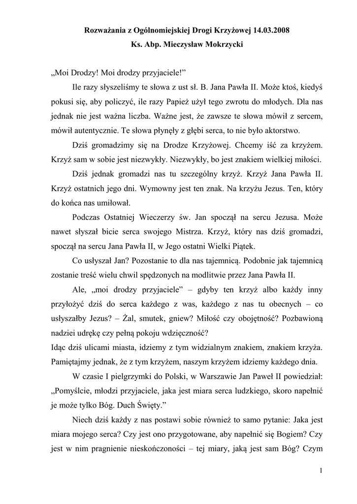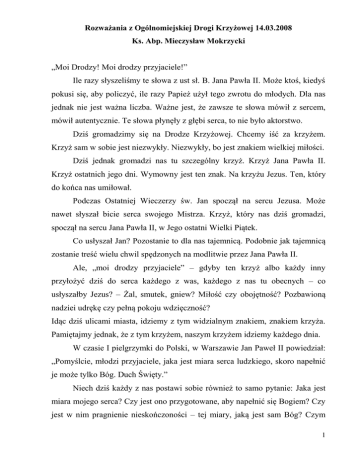Rozważania z Ogólnomiejskiej Drogi Krzyżowej 14.03.2008 Ks. Abp. Mieczysław Mokrzycki „Moi Drodzy! Moi drodzy przyjaciele!” Ile razy słyszeliśmy te słowa z ust sł. B. Jana Pawła II. Może ktoś, kiedyś pokusi się, aby policzyć, ile razy Papież użył tego zwrotu do młodych. Dla nas jednak nie jest ważna liczba. Ważne jest, że zawsze te słowa mówił z sercem, mówił autentycznie. Te słowa płynęły z głębi serca, to nie było aktorstwo. Dziś gromadzimy się na Drodze Krzyżowej. Chcemy iść za krzyżem. Krzyż sam w sobie jest niezwykły. Niezwykły, bo jest znakiem wielkiej miłości. Dziś jednak gromadzi nas tu szczególny krzyż. Krzyż Jana Pawła II. Krzyż ostatnich jego dni. Wymowny jest ten znak. Na krzyżu Jezus. Ten, który do końca nas umiłował. Podczas Ostatniej Wieczerzy św. Jan spoczął na sercu Jezusa. Może nawet słyszał bicie serca swojego Mistrza. Krzyż, który nas dziś gromadzi, spoczął na sercu Jana Pawła II, w Jego ostatni Wielki Piątek. Co usłyszał Jan? Pozostanie to dla nas tajemnicą. Podobnie jak tajemnicą zostanie treść wielu chwil spędzonych na modlitwie przez Jana Pawła II. Ale, „moi drodzy przyjaciele” – gdyby ten krzyż albo każdy inny przyłożyć dziś do serca każdego z was, każdego z nas tu obecnych – co usłyszałby Jezus? – Żal, smutek, gniew? Miłość czy obojętność? Pozbawioną nadziei udrękę czy pełną pokoju wdzięczność? Idąc dziś ulicami miasta, idziemy z tym widzialnym znakiem, znakiem krzyża. Pamiętajmy jednak, że z tym krzyżem, naszym krzyżem idziemy każdego dnia. W czasie I pielgrzymki do Polski, w Warszawie Jan Paweł II powiedział: „Pomyślcie, młodzi przyjaciele, jaka jest miara serca ludzkiego, skoro napełnić je może tylko Bóg. Duch Święty.” Niech dziś każdy z nas postawi sobie również to samo pytanie: Jaka jest miara mojego serca? Czy jest ono przygotowane, aby napełnić się Bogiem? Czy jest w nim pragnienie nieskończoności – tej miary, jaką jest sam Bóg? Czym 1 żyję na co dzień i dla kogo bije moje serce – serce stworzone na obraz jedynego Serca Bożego? 1. Jezus skazany na śmierć przez Piłata W 1985 roku w Buenos Aires, Jan Paweł II powiedział: „Naszemu dzisiejszemu spotkaniu przewodzi ten wielki krzyż - obecny podczas wszystkich uroczystości Świętego Roku Odkupienia i który w Niedzielę Zmartwychwstania wręczyłem grupie młodzieży, z tymi oto słowami: "Umiłowani młodzi, u kresu Roku Świętego powierzam wam znak tego roku jubileuszowego: krzyż Chrystusa. Ponieście go w świat jako znak miłości, którą Pan Jezus umiłował ludzkość, i głoście wszystkim, że tylko w Chrystusie umarłym i zmartwychwstałym jest ratunek i odkupienie". (…) Oczekuję od was przede wszystkim tego, że odnowicie swą wierność wobec Jezusa Chrystusa i Jego odkupieńczego krzyża. Pomyślcie, sama odkupieńcza ofiara Chrystusa odnawia się sakramentalnie w każdej Mszy św., także tej, która jest być może odprawiana właśnie blisko waszego domu, szkoły, czy pracy. Nie, Jezus nie przestał ingerować w nasze dzieje! Nie! On żyje! I wciąż pragnie odnaleźć każdego z nas, abyśmy, o ile to możliwe, łączyli się z Nim każdego dnia w Eucharystii, i z duszą w stanie łaski, oczyszczoną ze wszystkich grzechów śmiertelnych, przystępowali do Komunii św. Pomyślcie także o pełnych powagi słowach, które Pan skierował do swoich uczniów: "Jeśli kto chce iść za Mną, niech się zaprze samego siebie, niech co dnia bierze krzyż swój i niech Mnie naśladuje" (Łk 9, 23). Pragnę wam przypomnieć, że wasz krzyż, to przede wszystkim codzienna walka o to, by być dobrym chrześcijaninem. W ten bowiem sposób stajecie się wspólnikami odkupieńczego dzieła Chrystusa i wnosicie wkład w braterskie pojednanie ludzi i całego stworzenia z Bogiem. Jakże to wspaniały program życia, wymaga jednak wspaniałomyślności. Zastanówcie się zatem, jakie powinno być wasze życie: skoro Chrystus odkupił nas swoim męczeństwem, odpowiedzieć Mu przeciętnością byłoby brakiem konsekwencji. Wszystko to wymaga wysiłku, 2 poświęcenia i uporu; wymaga, byśmy wciąż każdego dnia czuli ciężar krzyża, na naszych barkach.” Jaka jest – drogi młody przyjacielu – twoja codzienna walka o to by być dobrym chrześcijaninem? Jezus przyjął niesprawiedliwy wyrok – czy Ty potrafisz przyjmować niesprawiedliwe wyroki? Jezus spotkał wrogi mu tłum – jakie jest moje odniesienie do wrogów? Czy jest to odniesienie Jezusowe? 2. Jezus bierze krzyż na ramiona W Loretto, w 2004 roku Jan Paweł II powiedział: „Nieść Krzyż za Jezusem oznacza być gotowym do wszelkiej ofiary z miłości do Niego oraz nie stawiać nikogo i niczego przed Niego, nawet najdroższych osób, nawet własnego życia. Wiecie, że przylgnięcie do Chrystusa jest wymagającym wyborem. Jednak to nie sami niesiemy krzyż. Przed nami idzie On...” Drogi młody przyjacielu – czy nikogo nie stawiasz między sobą a Chrystusem? Czy naprawdę wybrałeś Jezusa? Czy zwłaszcza w chwilach trudnych wierzysz, że nie sam niesiesz swój krzyż? Czy wierzysz, że niesie go z Tobą Chrystus? 3. Jezus upada pod krzyżem Na zakończenie spotkania w Buenos Aires, Papież powiedział: „Zadaliście mi pytanie, jaki problem ludzkości niepokoi mnie najbardziej. Otóż najbardziej gnębi mnie myśl o ludziach, którzy jeszcze nie znają Chrystusa, którzy jeszcze nie odkryli wielkiej prawdy o Bożej miłości; niepokoi mnie obraz ludzkości, która coraz bardziej oddala się od Boga, która dąży do rozwoju, spychając Boga na margines lub zaprzeczając Jego istnieniu. Ludzkości pozbawionej Ojca, a tym samym pozbawionej miłości, osieroconej i zdezorientowanej, zdolnej nadal zabijać ludzi, których nie uważa za braci, a przez to zmierzającej ku samozniszczeniu i zagładzie. Dlatego, moi drodzy, jako apostołom nowej ewangelizacji zadane jest wam bud