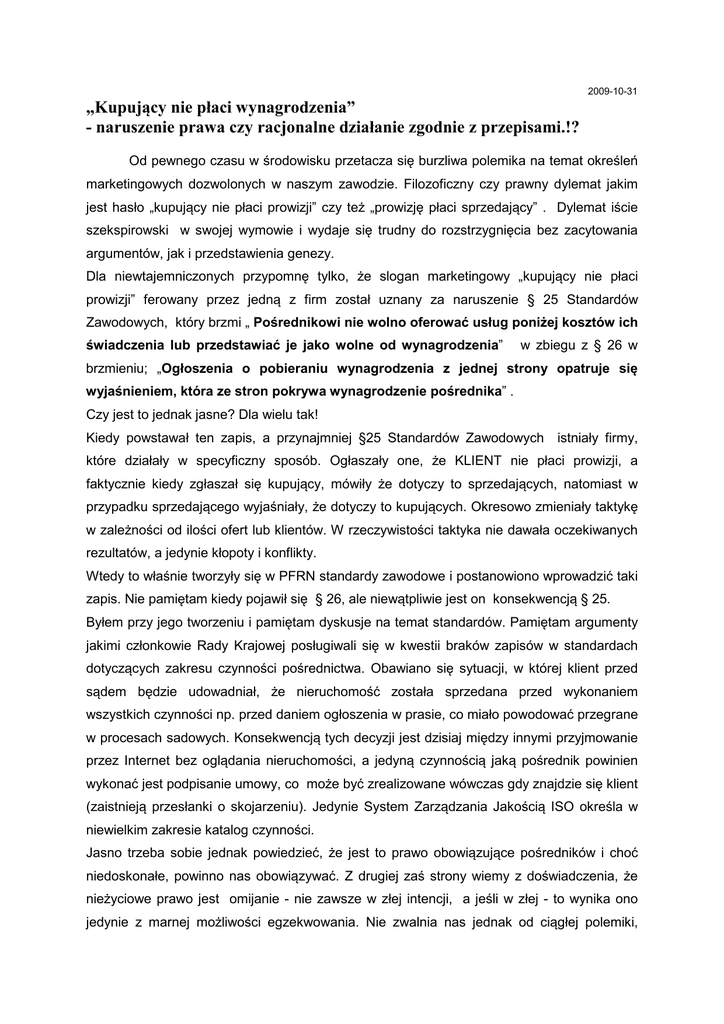 2009-10-31 „Kupujący nie płaci wynagrodzenia” - naruszenie prawa czy racjonalne działanie zgodnie z przepisami.!? Od pewnego czasu w środowisku przetacza się burzliwa polemika na temat określeń marketingowych dozwolonych w naszym zawodzie. Filozoficzny czy prawny dylemat jakim jest hasło „kupujący nie płaci prowizji” czy też „prowizję płaci sprzedający” . Dylemat iście szekspirowski w swojej wymowie i wydaje się trudny do rozstrzygnięcia bez zacytowania argumentów, jak i przedstawienia genezy. Dla niewtajemniczonych przypomnę tylko, że slogan marketingowy „kupujący nie płaci prowizji” ferowany przez jedną z firm został uznany za naruszenie § 25 Standardów Zawodowych, który brzmi „ Pośrednikowi nie wolno oferować usług poniżej kosztów ich świadczenia lub przedstawiać je jako wolne od wynagrodzenia” w zbiegu z § 26 w brzmieniu; „Ogłoszenia o pobieraniu wynagrodzenia z jednej strony opatruje się wyjaśnieniem, która ze stron pokrywa wynagrodzenie pośrednika” . Czy jest to jednak jasne? Dla wielu tak! Kiedy powstawał ten zapis, a przynajmniej §25 Standardów Zawodowych istniały firmy, które działały w specyficzny sposób. Ogłaszały one, że KLIENT nie płaci prowizji, a faktycznie kiedy zgłaszał się kupujący, mówiły że dotyczy to sprzedających, natomiast w przypadku sprzedającego wyjaśniały, że dotyczy to kupujących. Okresowo zmieniały taktykę w zależności od ilości ofert lub klientów. W rzeczywistości taktyka nie dawała oczekiwanych rezultatów, a jedynie kłopoty i konflikty. Wtedy to właśnie tworzyły się w PFRN standardy zawodowe i postanowiono wprowadzić taki zapis. Nie pamiętam kiedy pojawił się § 26, ale niewątpliwie jest on konsekwencją § 25. Byłem przy jego tworzeniu i pamiętam dyskusje na temat standardów. Pamiętam argumenty jakimi członkowie Rady Krajowej posługiwali się w kwestii braków zapisów w standardach dotyczących zakresu czynności pośrednictwa. Obawiano się sytuacji, w której klient przed sądem będzie udowadniał, że nieruchomość została sprzedana przed wykonaniem wszystkich czynności np. przed daniem ogłoszenia w prasie, co miało powodować przegrane w procesach sadowych. Konsekwencją tych decyzji jest dzisiaj między innymi przyjmowanie przez Internet bez oglądania nieruchomości, a jedyną czynnością jaką pośrednik powinien wykonać jest podpisanie umowy, co może być zrealizowane wówczas gdy znajdzie się klient (zaistnieją przesłanki o skojarzeniu). Jedynie System Zarządzania Jakością ISO określa w niewielkim zakresie katalog czynności. Jasno trzeba sobie jednak powiedzieć, że jest to prawo obowiązujące pośredników i choć niedoskonałe, powinno nas obowiązywać. Z drugiej zaś strony wiemy z doświadczenia, że nieżyciowe prawo jest omijanie - nie zawsze w złej intencji, a jeśli w złej - to wynika ono jedynie z marnej możliwości egzekwowania. Nie zwalnia nas jednak od ciągłej polemiki, 2 szukania bardziej dojrzałych rozwiązań prawnych i interpretacji dostosowanych do zmieniających się warunków rynkowych i powstających zagrożeń. To na podstawie powyższego część osób uznaje, że sformułowanie, iż „kupujący nie płaci prowizji” nie sugeruje, kto rzeczywiście ponosi koszty wynagrodzenia. Tak ujęty temat – ich zdaniem - nie spełnia wymogów standardów. Czy w związku z tym pozostali nie mają racji używając tego hasła marketingowego? Jeśli opatrzą, zgodnie z § 26 wyjaśnieniem informującym o fakcie która ze stron pokrywa wynagrodzenie pośrednika, to zaczyna się kolejna dyskusja - w którym miejscu? jaką czcionką? jaki kolor czcionki? co i tak nie wyczerpuje możliwości omijania zapisów standardów. Kiedy tworzono standardy nikt nie przypuszczał, że licencje zawodowe staną się tak popularne, a do ich zdobycia wystarczą studia podyplomowe. Istniała doktryna wynikająca ze składu Rady Krajowej, że to pośrednik powinien być przedsiębiorcą prowadzącym działalność gospodarczą, a agenci działają pod jego nadzorem. Wygodne – nieprawdaż ! Tak faktycznie inne formy były w ówczesnym czasie marginesem. Pierwszym sygnałem było tworzenie się „szarej strefy”, co kazało Radzie Krajowej zarekomendować konieczność zatrudnienia pośrednika w danym biurze bez możliwości nadzoru na odległość. W miarę rozwoju rynku to przedsiębiorcy nie posiadający licencji zaczęli zatrudniać jedynie pośredników co staje się coraz bardziej popularne. W tym właśnie momencie powstała kwadratura koła. Z jednej strony przedsiębiorca, którego obowiązuje Ustawa o Swobodzie Działalności Gospodarczej, dla którego zakaz używania tego sformułowania w marketingu jest niezrozumiały i niezgodny z ustawą. Z racji, że nie chodzi tu o bliżej nieokreślonego klienta a konkretnie o KUPUJĄCEGO. Również i ustawa o Zwalczaniu Nieuczciwej Konkurencji milczy na ten temat. Nawiasem mówiąc w bardzo wyraźny sposób odnosi się do kopiowania ofert w Internecie, informowania klienta, że nie musi podpisywać umowy a nawet reprezentowania dwóch stron transakcji. Z drugiej strony pośrednik, który zgodnie z doktryną, (pomimo że swoje czynności wykonuje za wynagrodzeniem zgodne z zapisem standardów) miałby narzucać swoją wolę przedsiębiorcy, ograniczając mu jego prawa!? To z pewnością reguluje zapis § 11 Standardów Zawodowych odnoszący się chyba jako jedyny do UoZNK i zamyka temat. (Pośrednik nie może postępować w sposób godzący w interesy zatrudniającego go przedsiębiorcy……..) Argumenty te, nie bez racji, stawiają pod znakiem zapytania dotychczasową wykładnię i siłą rzeczy wywołują następne kontrowersje i pytania. 3 Jeśli powyższa teza jest w świetle obowiązującego prawa „do obrony”, to jakie czynności należą do pośrednika, a jakie do przedsiębiorcy? Czy nie należy tych ról od siebie oddzielić dla przejrzystości sytuacji,