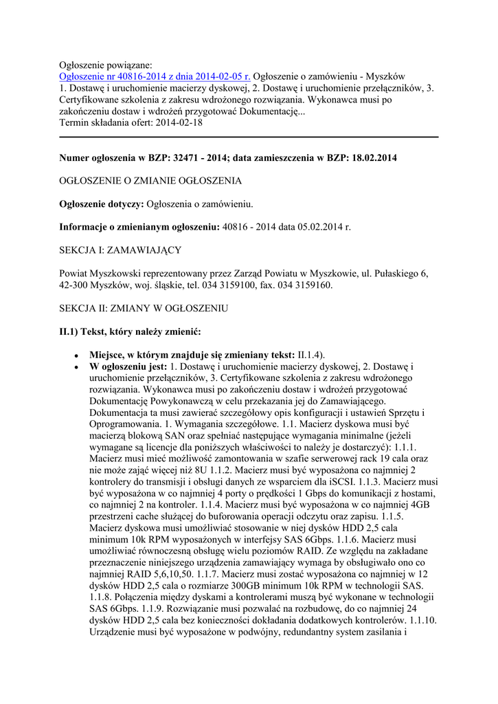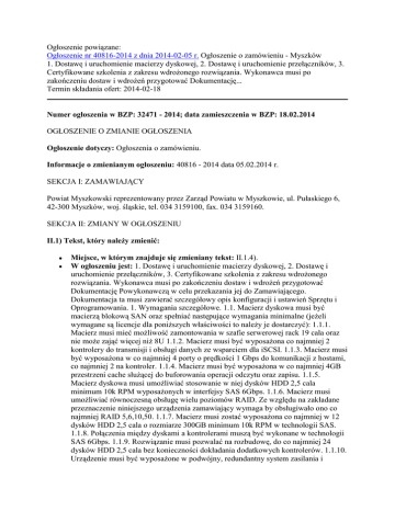 Ogłoszenie powiązane: Ogłoszenie nr 40816-2014 z dnia 2014-02-05 r. Ogłoszenie o zamówieniu - Myszków 1. Dostawę i uruchomienie macierzy dyskowej, 2. Dostawę i uruchomienie przełączników, 3. Certyfikowane szkolenia z zakresu wdrożonego rozwiązania. Wykonawca musi po zakończeniu dostaw i wdrożeń przygotować Dokumentację... Termin składania ofert: 2014-02-18 Numer ogłoszenia w BZP: 32471 - 2014; data zamieszczenia w BZP: 18.02.2014 OGŁOSZENIE O ZMIANIE OGŁOSZENIA Ogłoszenie dotyczy: Ogłoszenia o zamówieniu. Informacje o zmienianym ogłoszeniu: 40816 - 2014 data 05.02.2014 r. SEKCJA I: ZAMAWIAJĄCY Powiat Myszkowski reprezentowany przez Zarząd Powiatu w Myszkowie, ul. Pułaskiego 6, 42-300 Myszków, woj. śląskie, tel. 034 3159100, fax. 034 3159160. SEKCJA II: ZMIANY W OGŁOSZENIU II.1) Tekst, który należy zmienić: Miejsce, w którym znajduje się zmieniany tekst: II.1.4). W ogłoszeniu jest: 1. Dostawę i uruchomienie macierzy dyskowej, 2. Dostawę i uruchomienie przełączników, 3. Certyfikowane szkolenia z zakresu wdrożonego rozwiązania. Wykonawca musi po zakończeniu dostaw i wdrożeń przygotować Dokumentację Powykonawczą w celu przekazania jej do Zamawiającego. Dokumentacja ta musi zawierać szczegółowy opis konfiguracji i ustawień Sprzętu i Oprogramowania. 1. Wymagania szczegółowe. 1.1. Macierz dyskowa musi być macierzą blokową SAN oraz spełniać następujące wymagania minimalne (jeżeli wymagane są licencje dla poniższych właściwości to należy je dostarczyć): 1.1.1. Macierz musi mieć możliwość zamontowania w szafie serwerowej rack 19 cala oraz nie może zająć więcej niż 8U 1.1.2. Macierz musi być wyposażona co najmniej 2 kontrolery do transmisji i obsługi danych ze wsparciem dla iSCSI. 1.1.3. Macierz musi być wyposażona w co najmniej 4 porty o prędkości 1 Gbps do komunikacji z hostami, co najmniej 2 na kontroler. 1.1.4. Macierz musi być wyposażona w co najmniej 4GB przestrzeni cache służącej do buforowania operacji odczytu oraz zapisu. 1.1.5. Macierz dyskowa musi umożliwiać stosowanie w niej dysków HDD 2,5 cala minimum 10k RPM wyposażonych w interfejsy SAS 6Gbps. 1.1.6. Macierz musi umożliwiać równoczesną obsługę wielu poziomów RAID. Ze względu na zakładane przeznaczenie niniejszego urządzenia zamawiający wymaga by obsługiwało ono co najmniej RAID 5,6,10,50. 1.1.7. Macierz musi zostać wyposażona co najmniej w 12 dysków HDD 2,5 cala o rozmiarze 300GB minimum 10k RPM w technologii SAS. 1.1.8. Połączenia między dyskami a kontrolerami muszą być wykonane w technologii SAS 6Gbps. 1.1.9. Rozwiązanie musi pozwalać na rozbudowę, do co najmniej 24 dysków HDD 2,5 cala bez konieczności dokładania dodatkowych kontrolerów. 1.1.10. Urządzenie musi być wyposażone w podwójny, redundantny system zasilania i chłodzenia, gwarantujący nieprzerwalność pracy i utrzymanie funkcjonalności macierzy w szczególności działania pamięci cache w przypadku awarii jednego ze źródeł zasilania. 1.1.11. Macierz musi być odporna na awarię pamięci cache, w szczególności cache przeznaczony do zapisu (ang. write cache) i zapewniać w razie utraty zasilania zabezpieczenie danych niezapisanych na dyski przez nieograniczony czas. 1.1.12. Macierz musi posiadać funkcjonalność tworzenia lokalnych kopii migawkowych i pełnych dysków logicznych wewnętrznymi mechanizmami macierzy. Jeśli wymagana jest licencja, należy ją dostarczyć na całą oferowaną pojemność macierzy. 1.1.13. Macierz musi obsługiwać minimum 64 kopii migawkowych na wolumen. 1.1.14. Macierz musi umożliwiać rozkładanie bloków dysków logicznych pomiędzy wszystkie dostępne dyski fizyczne funkcjonujące w ramach tej samej puli/grupy dyskowej w przypadku rozszerzania dysku logicznego i dokładania dysków fizycznych. 1.1.15. Macierz musi współpracować z serwerami pracującymi pod kontrolą systemów Microsoft Windows Serwer 2008/2012 z obsługą Hyper-V, VMware ESXi 5.x, Red Hat Linux, HP-UX, SUSE Linux. 1.1.16. Macierz musi umożliwiać zarządzanie poprzez interfejs graficzny WWW. 1.2. Przełączniki. 1.2.1. Zamawiający posiada 5 przełączników HP Switch 2610-48 (J9088A) oraz 1 HP Switch HP 4204 vl (J8770A) wraz z modułami. Przyłączanie do obecnej infrastruktury musi zostać zrealizowane z wykorzystaniem 2 portów SPF w module HP J9033A. Porty należy wyposażyć w odpowiednie urządzenie nadawczo-odbiorcze mini-GBIC. 1.2.2. Przełączniki muszą spełniać następujące wymagania: 1.2.2.1.Urządzenie o stałej konfiguracji. 1.2.2.2. Minimum 512MB pamięci SDRAM, minimum 4MB pamięci Flash, minimum 1GB pamięci flash ROM. 1.2.2.3. Pojemność bufora pakietu minimum 6MB. 1.2.2.4. Obsługa minimum 16000 adresów MAC. 1.2.2.5. Pojemność przełączania minimum 128 Gbps . 1.2.2.6. Przepustowość minimum 95 mpps (pakiety 64-bajtowe). 1.2.2.7. Co najmniej 20 portów 10/100/1000, min. 4 porty dualpersonality 10/100/1000 lub mini-GBIC, możliwość rozbudowy o 4 porty 10-GbE w standardzie SFP+ oraz BASE-T 1.2.2.8. Automatyczne wykrywanie przeplotu (AutoMDIX) na portach miedzianych. 1.2.2.9. Obsługa co najmniej 64 sieci VLAN i 4000 VLAN ID 1.2.2.10. Obsługa mechanizmów dystrybucji informacji o sieciach VLAN pomiędzy przełącznikami 1.2.2.11. Obsługa protokołów sieciowych zgodnie ze standardami: -IEEE 802.1x -IEEE 802.1s -IEEE 802.1w -IEEE 802.3x full duplex dla 10BASE-T i 100BASE-TX -IEEE 802.3ad -IEEE 802.1D -IEEE 802.1p -IEEE 802.1Q -IEEE 802.3 10BASE-T -IEEE 802.3u 100BASE-TX -IEEE 802.3z 1000BASE-X -IEEE 802.3ab 1000BASE-T. 1.2.2.12. Mechanizmy związane z zapewnieniem jakości usług w sieci - obsługa co najmniej czterech kolejek sprzętowych, wyjściowych dla różnego rodzaju ruchu. 1.2.2.13. Mechanizmy związane z zapewnieniem bezpieczeństwa sieci: -dostęp do urządzenia przez konsolę szeregową, SSHv2 i SNMPv3 -możliwość autoryzacji prób logowania do urządzenia za pomocą serwerów RADIUS lub T