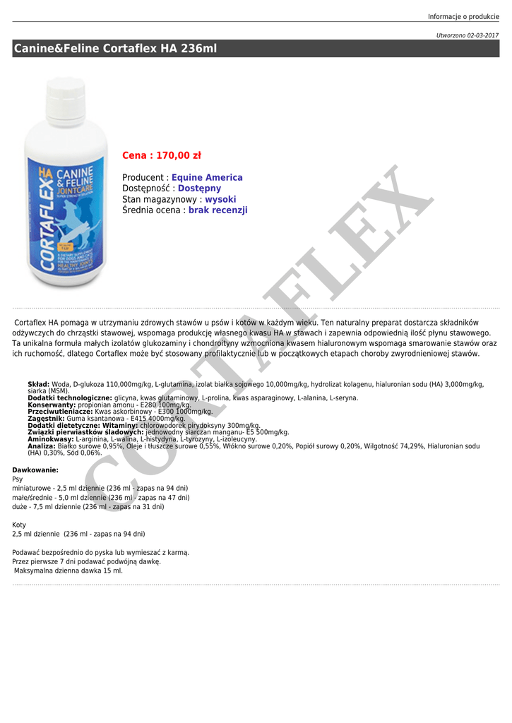 Informacje o produkcie Utworzono 02-03-2017 Canine&Feline Cortaflex HA 236ml FL Producent : Equine America Dostępność : Dostępny Stan magazynowy : wysoki Średnia ocena : brak recenzji EX Cena : 170,00 zł TA Cortaflex HA pomaga w utrzymaniu zdrowych stawów u psów i kotów w każdym wieku. Ten naturalny preparat dostarcza składników odżywczych do chrząstki stawowej, wspomaga produkcję własnego kwasu HA w stawach i zapewnia odpowiednią ilość płynu stawowego. Ta unikalna formuła małych izolatów glukozaminy i chondroityny wzmocniona kwasem hialuronowym wspomaga smarowanie stawów oraz ich ruchomość, dlatego Cortaflex może być stosowany profilaktycznie lub w początkowych etapach choroby zwyrodnieniowej stawów. O R Skład: Woda, D-glukoza 110,000mg/kg, L-glutamina, izolat białka sojowego 10,000mg/kg, hydrolizat kolagenu, hialuronian sodu (HA) 3,000mg/kg, siarka (MSM). Dodatki technologiczne: glicyna, kwas glutaminowy, L-prolina, kwas asparaginowy, L-alanina, L-seryna. Konserwanty: propionian amonu - E280 100mg/kg. Przeciwutleniacze: Kwas askorbinowy - E300 1000mg/kg. Zagęstnik: Guma ksantanowa - E415 4000mg/kg. Dodatki dietetyczne: Witaminy: chlorowodorek pirydoksyny 300mg/kg. Związki pierwiastków śladowych: jednowodny siarczan manganu- E5 500mg/kg. Aminokwasy: L-arginina, L-walina, L-histydyna, L-tyrozyny, L-izoleucyny. Analiza: Białko surowe 0,95%, Oleje i tłuszcze surowe 0,55%, Włókno surowe 0,20%, Popiół surowy 0,20%, Wilgotność 74,29%, Hialuronian sodu (HA) 0,30%, Sód 0,06%. C Dawkowanie: Psy miniaturowe - 2,5 ml dziennie (236 ml - zapas na 94 dni) małe/średnie - 5,0 ml dziennie (236 ml - zapas na 47 dni) duże - 7,5 ml dziennie (236 ml - zapas na 31 dni) Koty 2,5 ml dziennie (236 ml - zapas na 94 dni) Podawać bezpośrednio do pyska lub wymieszać z karmą. Przez pierwsze 7 dni podawać podwójną dawkę. Maksymalna dzienna dawka 15 ml.
