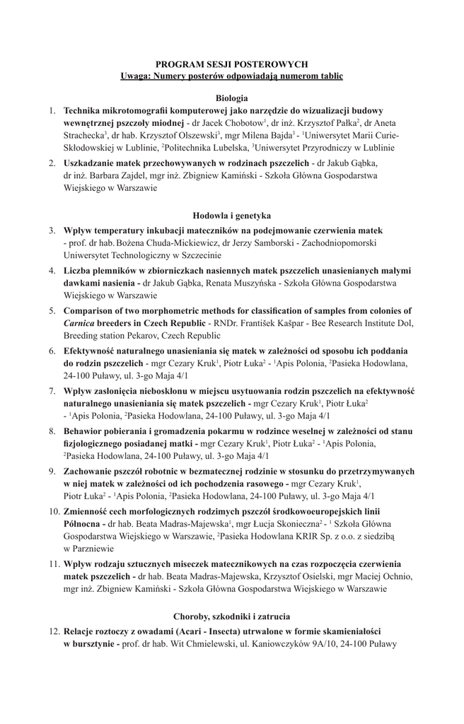 PROGRAM SESJI POSTEROWYCH Uwaga: Numery posterów odpowiadają numerom tablic Biologia 1. Technika mikrotomografii komputerowej jako narzędzie do wizualizacji budowy wewnętrznej pszczoły miodnej - dr Jacek Chobotow1, dr inż. Krzysztof Pałka2, dr Aneta Strachecka3, dr hab. Krzysztof Olszewski3, mgr Milena Bajda3 - 1Uniwersytet Marii CurieSkłodowskiej w Lublinie, 2Politechnika Lubelska, 3Uniwersytet Przyrodniczy w Lublinie 2. Uszkadzanie matek przechowywanych w rodzinach pszczelich - dr Jakub Gąbka, dr inż. Barbara Zajdel, mgr inż. Zbigniew Kamiński - Szkoła Główna Gospodarstwa Wiejskiego w Warszawie Hodowla i genetyka 3. Wpływ temperatury inkubacji mateczników na podejmowanie czerwienia matek - prof. dr hab. Bożena Chuda-Mickiewicz, dr Jerzy Samborski - Zachodniopomorski Uniwersytet Technologiczny w Szczecinie 4. Liczba plemników w zbiorniczkach nasiennych matek pszczelich unasienianych małymi dawkami nasienia - dr Jakub Gąbka, Renata Muszyńska - Szkoła Główna Gospodarstwa Wiejskiego w Warszawie 5. Comparison of two morphometric methods for classification of samples from colonies of Carnica breeders in Czech Republic - RNDr. František Kašpar - Bee Research Institute Dol, Breeding station Pekarov, Czech Republic 6. Efektywność naturalnego unasieniania się matek w zależności od sposobu ich poddania do rodzin pszczelich - mgr Cezary Kruk1, Piotr Łuka2 - 1Apis Polonia, 2Pasieka Hodowlana, 24-100 Puławy, ul. 3-go Maja 4/1 7. Wpływ zasłonięcia nieboskłonu w miejscu usytuowania rodzin pszczelich na efektywność naturalnego unasieniania się matek pszczelich - mgr Cezary Kruk1, Piotr Łuka2 - 1Apis Polonia, 2Pasieka Hodowlana, 24-100 Puławy, ul. 3-go Maja 4/1 8. Behawior pobierania i gromadzenia pokarmu w rodzince weselnej w zależności od stanu fizjologicznego posiadanej matki - mgr Cezary Kruk1, Piotr Łuka2 - 1Apis Polonia, 2 Pasieka Hodowlana, 24-100 Puławy, ul. 3-go Maja 4/1 9. Zachowanie pszczół robotnic w bezmatecznej rodzinie w stosunku do przetrzymywanych w niej matek w zależności od ich pochodzenia rasowego - mgr Cezary Kruk1, Piotr Łuka2 - 1Apis Polonia, 2Pasieka Hodowlana, 24-100 Puławy, ul. 3-go Maja 4/1 10.Zmienność cech morfologicznych rodzimych pszczół środkowoeuropejskich linii Północna - dr hab. Beata Madras-Majewska1, mgr Łucja Skonieczna2 - 1 Szkoła Główna Gospodarstwa Wiejskiego w Warszawie, 2Pasieka Hodowlana KRIR Sp. z o.o. z siedzibą w Parzniewie 11.Wpływ rodzaju sztucznych miseczek matecznikowych na czas rozpoczęcia czerwienia matek pszczelich - dr hab. Beata Madras-Majewska, Krzysztof Osielski, mgr Maciej Ochnio, mgr inż. Zbigniew Kamiński - Szkoła Główna Gospodarstwa Wiejskiego w Warszawie Choroby, szkodniki i zatrucia 12.Relacje roztoczy z owadami (Acari - Insecta) utrwalone w formie skamieniałości w bursztynie - prof. dr hab. Wit Chmielewski, ul. Kaniowczyków 9A/10, 24-100 Puławy 10 13.Wpływ ekstraktu z macierzanki piaskowej na rozwój zakażenia Nosema ceranae w warunkach laboratoryjnych - dr hab. Paweł Chorbiński, lek. wet. Agnieszka Wójcik Uniwersytet Przyrodniczy we Wrocławiu 14.Wpływ stosowania elektrycznego odymiacza do Apiwarolu na zwalczanie warrozy u pszczół - dr Jakub Gąbka, mgr inż. Zbigniew Kamiński, Wojciech Kotlicki, dr inż. Barbara Zajdel - Szkoła Główna Gospodarstwa Wiejskiego w Warszawie 15.Wstępne wyniki badań nad działaniem ekstraktów roślinnych na Paenibacillus larvae prof. dr hab. Walerij Isidorow1, dr Krzysztof Buczek2, mgr Monika Zambrzycka3, dr hab. Izabela Święcicka3 - 1Politechnika Białostocka, 2Uniwersytet Przyrodniczy w Lublinie, 3 Uniwersytet w Białymstoku 16.The use of pyrethroids to treat varroasis of bees - dr Frantisek Kamler, O. Procházka - Bee Research Institute Dol, Czech Republic 17.Preventive measures against greater wax moth (Galleria mellonella L.) - Lidia Kolbina, Anastasia Osokina - The Udmurt State Scientific Research Institute of Agriculture, Izhevsk, Udmurt Republic 18.Monitoring stanu zdrowotnego rodzin pszczelich w krajowych pasiekach (2014 r.) - dr Krystyna Pohorecka, lek. wet. Marta Skubida, mgr Dagmara Zdańska, lek. wet. Andrzej Bober - Państwowy Instytut Weterynaryjny - Państwowy Instytut Badawczy w Puławach 19.Zdrowotność pasiek produkujących matki, odkłady i pakiety w świetle wymagań Krajowego Programu Wsparcia Pszczelarstwa 2013/2014 - lek. wet. Marta Skubida, dr Krystyna Pohorecka, lek. wet. Andrzej Bober, mgr Dagmara Zdańska - Państwowy Instytut Weterynaryjny - Państwowy Instytut Badawczy w Puławach 20.HopGuard - nadzieja czy rozczarowanie? - dr Krystyna Pohorecka1, dr Piotr Skubida2, dr Piotr Semkiw2 - 1Państwowy Instytut Weterynaryjny - Państwowy Instytut Badawczy, 2 Instytut Ogrodnictwa, Zakład Pszczelnictwa w Puławach 21.Występowanie Nosema spp. u robotnic oraz w produktach pszczelich w sezonie pasiecznym - dr n. wet. Maria Michalczyk, dr hab. Rajmund Sokół, Sylwia Koziatek, Remigiusz Gałęcki - Uniwersytet Warmińsko-Mazurski w Olsztynie 22.Ocena przydatności trzech metod monitoringu poziomu porażenia rodzin pszczelich przez pasożyta Varroa destructor - mgr Paweł Węgrzynowicz, dr hab. Małgorzata Bieńkowska, dr Beata Panasiuk, dr Dariusz Gerula - Instytut Ogrodnictwa, Zakład Pszczelnictwa w Puławach 23.Wpływ wybranych środków do zwalczania komarów oraz insektycydów stosowanych w ochronie roślin na pszczołę miodną - dr hab. Adam Roman, dr Ewa Popiela-Pleban Uniwersytet Przyrodniczy we Wrocławiu Gospodarka pasieczna i ekonomika 24.Aktywność lotna pszczół robotnic w zależności od zmieniających się warunków środowiskowych - dr hab. Adam Roman, dr Ewa Popiela-Pleban, Wioleta Sztefka -Uniwersytet Przyrodniczy we Wrocławiu 25.Podkarmiaczka beleczkowa w wiosennym podkarmianiu rodzin pszczelich - ocena pszczelarzy - Wojciech Kołodyński - Uniwersytet Przyrodniczy we Wrocławiu 26.The results of beekeepers survey in the Udmurt Republic - Sofia Nepeivoda, Lidia Kolbina - The 