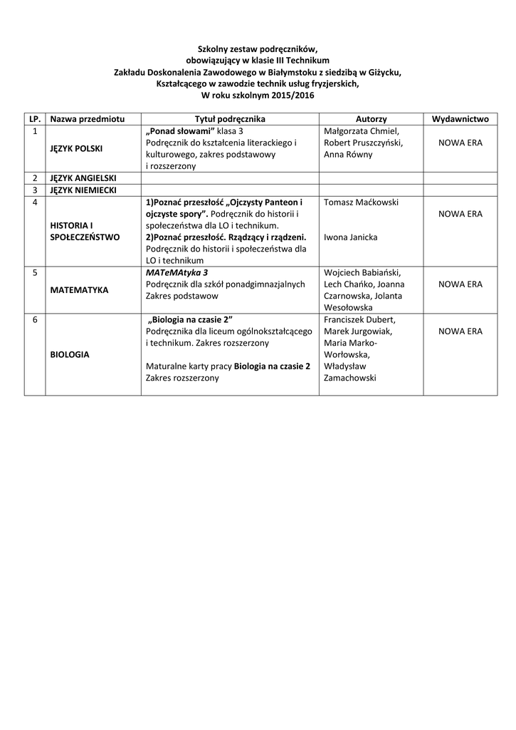 Szkolny zestaw podręczników, obowiązujący w klasie III Technikum Zakładu Doskonalenia Zawodowego w Białymstoku z siedzibą w Giżycku, Kształcącego w zawodzie technik usług fryzjerskich, W roku szkolnym 2015/2016 LP. Nazwa przedmiotu 1 JĘZYK POLSKI 2 3 4 Tytuł podręcznika „Ponad słowami” klasa 3 Podręcznik do kształcenia literackiego i kulturowego, zakres podstawowy i rozszerzony Autorzy Małgorzata Chmiel, Robert Pruszczyński, Anna Równy 1)Poznać przeszłość „Ojczysty Panteon i ojczyste spory”. Podręcznik do historii i społeczeństwa dla LO i technikum. 2)Poznać przeszłość. Rządzący i rządzeni. Podręcznik do historii i społeczeństwa dla LO i technikum MATeMAtyka 3 Podręcznik dla szkół ponadgimnazjalnych Zakres podstawow Tomasz Maćkowski Wydawnictwo NOWA ERA JĘZYK ANGIELSKI JĘZYK NIEMIECKI HISTORIA I SPOŁECZEŃSTWO 5 MATEMATYKA 6 „Biologia na czasie 2” Podręcznika dla liceum ogólnokształcącego i technikum. Zakres rozszerzony BIOLOGIA Maturalne karty pracy Biologia na czasie 2 Zakres rozszerzony NOWA ERA Iwona Janicka Wojciech Babiański, Lech Chańko, Joanna Czarnowska, Jolanta Wesołowska Franciszek Dubert, Marek Jurgowiak, Maria MarkoWorłowska, Władysław Zamachowski NOWA ERA NOWA ERA