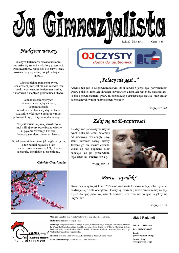 Rok 2012/13, nr 8 Cena 1 zł Nadejście wiosny Kiedy w kalendarzu wiosna nastanie, wszystko się zmieni - w kolory przemieni.. Pąki kwiatków, płatki róż i te barwy tęczy rozświetlają się znów, tak jak w bajce ze snów… Wiosna piękną porą roku bywa, lecz czasem j nie jest dla nas za życzliwa, bo tkliwym wspomnieniem nas omija, a marzenia o ciepłych promieniach zbywa. Jednak z serca wymywa zimowe uczucia, bywa i tak, że pora ta ostoją w radości i miłości się staje i otacza wszystkie w klimacie umiarkowanym położone kraje, za życia są dla nas rajem. Nie jest ważne ,w jakiej chwili życia moi mili ujrzymy oczekiwaną wiosnę z pąkami barwnego kwiecia, brzęczącym ulem, zielonym lasem. Bo tak przeminie raptem, jak nagle przyszła, a tuż po niej pojawi się lato i świat znów zawiruje wokół, chwile zaczaruje, spełniając niespełnione... „Polacy nie gęsi...” Artykuł ten jest o Międzynarodowym Dniu Języka Ojczystego, porównaniem gwary polskiej, różnych określeń językowych z różnych regionów naszego kraju jak i przytoczeniem gwary młodzieżowej i dzisiejszego języka, oraz zmian zachodzących w nim na przestrzeni wieków. więcej str. 5-6 Zdaj się na E-papierosa! Elektryczne papierosy weszły na rynek kilka lat temu, natomiast od niedawna zawładnęły umysłami uczniów naszej szkoły. Jeszcze go nie masz? Zastanawiasz się nad kupnem? Mam nadzieję, że po przeczytaniu tego artykułu - rozmyślisz się. Gabriela Grzesiowska więcej str. 13 Barca - upadek? Barcelona –czy to już koniec? Pewnie większość kibiców zadaję sobie pytanie, co dzieję się z Katalończykami, którzy są uważani ( nawet przeze mnie) za najlepszą drużynę piłkarską wszech czasów. Lecz ostatnio drużyna ta jakby się „wypaliła”. więcej str. 17 Opiekun Gazetki: mgr Jolanta Wątorczyk i mgr Edyta Koperstyńska Skład Redakcji Redaktor Naczelny: Maciej Rodak Redakcja: Magdalena Małek, Kinga Wójcik,, Gabriela Frań, Katarzyna Kaniowska, Dominika Walczyk, Olivia Rzeszótko, Karol Pawłowski, Anna Świderek, Wiktoria Klimczak, Gabriela Grzesiowska, Maria Basista, Natalia Rodak, Weronika Stachnik, Karolina Pawłowska, Iga Walencik, Magdalena Trojanowska. Rysunki: Gabriela Grzesiowska . Zdjęcia: Maciej Rodak, Natalia Rodak Skład komputerowy: Maciej Rodak, Karol Pawłowski Tel.: (012) 387-21-40 Fax.: (012) 387-00-85 Email: [email protected] Strona szkoły: www.gimwlub.edu.pl WSTĘPNIAK Siema! Witam Was w już prawie wiosennym wydaniu gazety „Ja Gimnazjalista”, w którym jak zawsze pełno interesujących nowinek i nietypowych tematów. Uff!! Możemy powoli ocierać nasze czoła z potu. Dlaczego? Otóż dokonujemy rzeczy wręcz niemożliwej dla gimnazjalisty, porównywalnej do zdobycia Mount Everestu. Powoli kończy się okres „wielkiej smuty”. Z małą zadyszką czy wielkim zmęczeniem dobijamy do końca jednego z najcięższych momentów tego roku szkolnego. Za nami prawie dwa miesiące bez wolnego (nie licząc weekendów), ciężkie tygodnie niewolniczej harówki, codziennej obawy przed łapanką do tablicy. Nastrój przygnębienia widać na szkolnych korytarzach. Przez ostatnie tygodnie zdziesiątkowane klasy snuły się po szkole jak cienie, ale dziś powoli możemy z ulgą odetchnąć. Święta W ielkanocne za pasem, a w związku z tym prawie tydzień tzw. „laby”. Jednak nie ulegajmy zbytniemu entuzjazmowi, bowiem do „wakacji pod gruszą” zostało jeszcze kilkanaście dni, bowiem dzień szkolny potrafi być jak pogoda ostatnim czasem, dobrze się zacznie, a skończy tragicznie. Ufam, że pogoda nie spłata nam figla i wiosna zawita już na dobre. Odstawmy marzenia i wróćmy na ziemię. Przez ostatni miesiąc (o dziwo) nie działo się zbyt wiele, ale czy aby na pewno było aż tak nudno? Pierwszym wydarzeniem wartym uwagi był punkt kulminacyjny szkolnych walentynek. Uczniowie z koła teatralnego prowadzonego przez p. Beatę Dzień i p. Agnieszkę Lutyńską zaprezentowali skecze niczym z życia wzięte. Były to scenki pełne humoru, uczucia i kunsztu artystycznego. Całość dopełniły muzyczne występy w wykonaniu uczennic Marty Czekaj i Dominiki Doniec oraz pełne miłości przeboje z udziałem naszych gimnazjalistek z zespołu "Vabank". Str. 2 Oprawa muzyczna była prawdziwą ucztą dla ucha i oka nie tylko zakochanych, a dla wszystkich widzów. Kolejnym wydarzeniem stała się prelekcja zorganizowana przez panią mgr Alinę Marchewczyk, której celem było przybliżenie uczniom problu z narkotykami i innymi używkami. Wykład trwał dwie godziny lekcyjne, ale gimnazjaliści nie mogli się nudzić. Za pomocą metody przez zabawę nauka uświadomiono wszystkim, jak niebezpieczne mogą być zabawy z ziołem. Czy wszyscy wzięli sobie naukę do serca? Czas pokaże. W ostatnich tygodniach odbył się finał kolejnej edycji konkursu „Master of reading”. Zadaniem uczestników było samodzielne opracowanie materiałów, na które składały się różnego rodzaju teksty dotyczące historii i kultury Wielkiej Brytanii oraz USA. Uczestnicy zmagali się z udzieleniem odpowiedzi na pytania szczegółowe: z czego słynie stan Nevada, dlaczego Chicago nazywane jest "wietrznym miastem". Miejsce pierwsze zajęła Gabriela Frań z klasy IIIc, miejsce II Katarzyna Leszczyńska z klasy IIb, a miejsce III Karol Pawłowski z klasy II a. Zwyciężczyni należą się szczególne brawa, bo już po raz drugi odniosła w tym konkursie sukces! Oby tak dalej! Uczestnikom wręczono nagrody książkowe ufundowane przez wydawnictwo Macmillan. A pierwszego marca br. uczniowie naszego gimnazjum wybrali się na warsztaty zorganizowane przez Centrum Informacyjne Europe Direct, które pełni funkcję pierwszego kontaktu z Unią Europejską. Gimnazjaliści skorzystali z lekcji europejskiej, podczas której mogli dowiedzieć się wielu informacji na temat Unii Europejskiej. Czekała na nich również niespodzianka w postaci quizu z bardzo przydatnymi nagrodami.