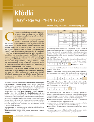 porady Kłódki Klasyfikacja wg PN-EN 12320 Stefan Jerzy Siudalski C W normie „Okucia budowlane – Kłódki wraz z osprzętem – Wymagania i metody badań” PN-EN 12320 z listopada 2002 r. oprócz wymagań charakterystycznych tylko dla kłódek można znaleźć także porównywalne z wymaganiami stawianymi zamkom czy wkładkom bębenkowym. Jak wynika z tabeli, np. klasa 6 kłódki odpowiada klasie E zamka i nie wyżej niż klasie 3 wkładki bębenkowej, lecz proszę pamiętać, że wymagania co do minimalnej liczby kombinacji kluczy są jedynie jednym z wielu wymagań koniecznych do zaliczenia urządzenia zamykającego do konkretnej klasy, niemniej dla planowania ochrony ten konkretny wymóg ma na tyle istotne znaczenie, że może być w wielu przypadkach podstawą do porównania kłódek z innymi zamknięciami. Przypominam, że zarówno zamki, wkładki, jak i kłódki mają kodowanie oznaczeń – i tak kłódki to siedem pozycji kodu, zamki jedenaście, a wkładki osiem. nr 5, WRZESIEŃ – PAŻDZIERNIK 2007 52 Rodzaj wymagań kłódki klasa Minimalna liczba kombinacji kluczy 1 2 3 4 5 6 zamki klasa 100 1 tys. 2,5 tys. 5 tys. 10 tys. 20 tys. B C D E F G H wkładki klasa 1 tys. 10 tys. 4 tys. 20 tys. 6 tys. 50 tys. 100 tys. 1 2 3 4 5 6 100 300 15 tys. 30 tys. 30 tys. 100 tys. Ponieważ pozycje kodowe w klasyfikacji kłódek, zamków i wkładek zawierają dane o minimalnej liczbie kombinacji kluczy na różnych pozycjach kodu w tabeli, umieściłem poniżej rodzaj „ściągawki” do łatwiejszego ustalenia, gdzie, na jakiej pozycji kodu szukać informacji o minimalnej liczbie kombinacji kluczy. Kłódki – klasyfikacja „Minimalna liczba kombinacji kluczy” jest oznaczana na 7. pozycji kodu i w tej kratce należy szukać oznaczenia x x x x x 6 7 cyfrą od 1 do 6. s zęsto na szkoleniach zadawane jest pytanie: Czy zamknięcia na kłódki są tak samo skuteczne jak zamknięcia na zamki? Bez wchodzenia w wymagania zawarte w normach, opierając się jedynie na tzw. zdrowym rozsądku, w przypadku dużych drzwi czy bram trudno sobie wyobrazić, aby nawet najlepszy zamek mógł być tak skuteczny, jak dobrej klasy kłódka. Wynika to z odmiennej zasady zamykania kłódek i zamków. W zamkach rygiel ma ograniczoną długość, a więc zamek jest wrażliwy na wszelkie niezbyt dokładnie spasowane połączenia drzwi, brama – futryna. Kłódkę możemy nakładać na skobel, a skobel może blokować albo bezpośrednio, albo pośrednio – czyli np. przesuwaną, dużą zasuwą o długości, która w żaden sposób nie jest ograniczona konstrukcją samego zamknięcia, czyli kłódki. Tego typu rozważania mają jedną wadę – nie wskazują źródeł (dokumentu pisanego, najlepiej normy), na jakiej podstawie i kiedy, przy jakich kłódkach zamknięcia na kłódki mogą być równoważne i w jakim zakresie w porównaniu z zamkami. [email protected] x – oznacza brak klasyfikacji, pomimo że kod ma siedem pozycji, a nie dwie Zamki – klasyfikacja „Minimalna liczba kombinacji kluczy” jest oznaczana na pozycji 11. kodu czyli, na tej pozycji należy szukać oznaczenia od B do H. t 1 2 3 4 5 6 7 8 9 10 11 Wkładki – klasyfikacja „Minimalna liczba kombinacji kluczy” jest oznaczana na pozycji 7. kodu, czyli tu należy szukać oznaczenia cyfrą od 1 do 6. t 1 2 3 4 5 6 7 8 Do zaklasyfikowania, pod kątem odporności, kłódki do jednej z sześciu klas (pozycja siódma kodu) kłódka oprócz wspomnianego wymogu zapewnienia minimalnej liczby kombinacji kluczy musi jeszcze spełniać wymagania: l zabezpieczenia przed otwarciem kluczem o kombinacji różniącej się jedynie o jedną pozycję, l odporności na siłę, a także na moment obrotowy, które działają na bębenek lub mechanizm blokujący, l odporności na wyrwanie, przecięcie i ukręcenie pałąka i skobla, l a także odporności pałąka i skobla na uderzenia w niskiej temperaturze, na przewiercenie i przepiłowanie. Dwa ostatnie wymagania – odporność na przewiercenie i przepiłowanie – są w normie podawane jako jednostka czasu, w której zapewniona jest jeszcze odporność na te agresywne działania. Dla klasy 4. kłódek dla obu agresji (niewystępujących łącznie) ten czas wynosi 2 minuty, dla klasy 5. – 4 minuty, a dla klasy 6. – 8 minut. Dla porównania wytrzymałość czasowa wkładek na agresję przez wiercenie wynosi: w klasie 1. – 3/5 minut, w klasie 2. – 5/10 minut, natomiast zamków w klasie 5. – 3/5 minut, a w klasie 7. – 5/10 minut* w zależności od tego, czy brany jest pod uwagę całkowity czas łącznie z przygotowaniem, czy tylko sam czas wiercenia. Z tych porównań wynika, że w przypadku ataku polegającego na wierceniu kłódki mogą dać ochronę porównywalną, jak zamki czy wkładki odpowiedniej klasy. w Odporność na korozję, czyli pozycja szósta w kodzie Tu można natknąć się na pewną, jak się wydaje przy pobieżnym sprawdzeniu, niekonsekwencję w normie, a mianowicie – w klasyfikacji odporności na korozję ustalono jedynie dwie klasy: klasa pierwsza do użytku jedynie wewnątrz obiektów i klasa druga – na zewnątrz. Tyle że w tym drugim przypadku na pozycji szóstej może być zapisana cyfra 3 lub 4, a nie, jak by się wydaje logicznie, cyfra 2. Ta rozbieżność wynika z tego, że w drugiej klasie odporności na korozję stosuje się jako odniesienie wymagania zapisane w normie EN 1670:1998, w której odporność na korozję jest oznaczana cyframi od jednego do czterech (oraz zero), a dla kłódek stosowanych na zewnątrz wymagana jest klasa trzecia tej normy i „3” na szóstej pozycji kodu oznacza klasę drugą wg PN-EN 12320! Uwagi: Kłódki montowane na drzwiach (wrotach) objętych monitorowaniem magazynów powinny być znakowane, aby: – można było natychmiast podczas oględzin ustalić, czy nie zostały podmienione, – wybranie odpowiedniego klucza z wielu nie nastręczało trudności także przy słabym oświetleniu. Łatwo poznać kłódki klasyfik