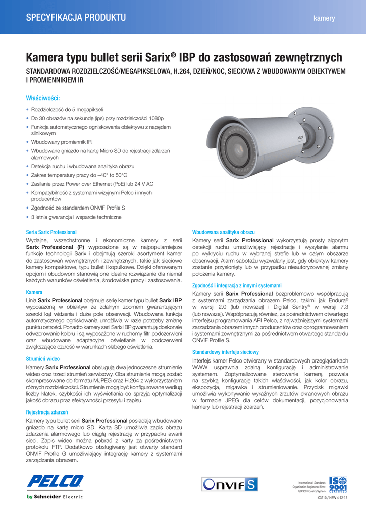 SPECYFIKACJA PRODUKTUkamery camera solutions Kamera typu bullet serii Sarix® IBP do zastosowań zewnętrznych PRODUCT SPECIFICATION STANDARDOWA ROZDZIELCZOŚĆ/MEGAPIKSELOWA, H.264, DZIEŃ/NOC, SIECIOWA Z WBUDOWANYM OBIEKTYWEM I PROMIENNIKIEM IR BU4 Series Entry-Level Integrated IR Bullet Camera Właściwości: 1/3-INCH CCD, 540 TVL WITH HIGH SENSITIVITY, RUGGED, VANDAL-RESISTANT • Rozdzielczość do 5 megapikseli • Do 30 obrazów na sekundę (ips) przy rozdzielczości 1080p • Funkcja automatycznego ogniskowania obiektywu z napędem silnikowym Product Features • Wbudowany promiennik IR • 540 TV Lines • Wbudowane gniazdo na kartę Micro SD do rejestracji zdarzeń • High Sensitivity (Zero Lux) alarmowych ® ™ • Sony 1/3-Inch Super HAD II CCD • Detekcja ruchu i wbudowana analityka obrazu • NextChippracy Digitaldo Signal Processor • Zakres temperatury –40° to 50°C(DSP) • Zasilanie przez Power over Ethernet lub 24 V AC • 12 VDC Power with Internal (PoE) Synchronization • Kompatybilność z systemami wizyjnymi • 2D Digital Noise Reduction (DNR)Pelco i innych producentów • 15 Meters of IR Illumination Distance • Zgodność ze standardem ONVIF Profile S • Weathertight Outdoor Operation (IP66) • 3 letnia gwarancja i wsparcie techniczne • Rugged, Vandal-Resistant Design (IK10) • Environmental Capability with a Wide Operating Temperature Seria Sarix Professional Wbudowana analityka obrazu • Low Power Consumption Wydajne, wszechstronne i ekonomiczne kamery z serii Sarix Professional (P) wyposażone są w najpopularniejsze • Cable Feedthrough Mount Included funkcje technologii Sarix i obejmują szeroki asortyment kamer do zastosowań wewnętrznych i zewnętrznych, takie jak sieciowe kamery kompaktowe, typu bullet i kopułkowe. Dzięki oferowanym The BU4 Series is one Pelco’s entry-level integrated IR bullet opcjom i obudowom stanowią idealne rozwiązanie dla niemal CCD camera. It uses a group of integrated LEDs to deliver każdych warunków oświetlenia, środowiska pracyinfrared i zastosowania. high quality pictures, even at night with zero illumination. Kamera The BU4 Series is a highserię resolution digital 540 TVL of Linia Sarix Professional obejmuje kamer typucamera bullet with Sarix IBP and a minimum of 0.2 luxzoomem illuminationgwarantującym in color mode. With wyposażonąresolution w obiektyw ze zdalnym the included IR supplemental lighting,Wbudowana the BU4 Series operates szeroki kąt widzenia i duże pole obserwacji. funkcja under zero lux (monochrome mode). The camera uses automatic automatycznego ogniskowania umożliwia w razie potrzeby zmianęgain control (AGC) tokamery optimizeserii theSarix videoIBP signal. punktu ostrości. Ponadto gwarantują doskonałe Kamery serii Sarix Professional wykorzystują prosty algorytm detekcji ruchu umożliwiający rejestrację i wysyłanie alarmu po wykryciu ruchu w wybranej strefie lub w całym obszarze obserwacji. Alarm sabotażu wyzwalany jest, gdy obiektyw kamery zostanie przysłonięty lub w przypadku nieautoryzowanej zmiany położenia kamery. Zgodność i integracja z innymi systemami Kamery serii Sarix Professional bezproblemowo współpracują z systemami zarządzania obrazem Pelco, takimi jak Endura® w wersji 2.0 (lub nowszej) i Digital Sentry® w wersji 7.3 (lub nowszej). Współpracują również, za pośrednictwem otwartego interfejsu programowania API Pelco, z najważniejszymi systemami zarządzania obrazem innych producentów oraz oprogramowaniem odwzorowanie koloru i są wyposażone w ruchomy filtr podczerwieni i systemami zewnętrznymi za pośrednictwem otwartego standardu The BU4 Series includesoświetlanie automatic white (AWB) for ONVIF Profile S. oraz wbudowane adaptacyjne w balance podczerwieni situationssłabego and digital noise reduction (DNR) that zwiększającedifficult czułośćlighting w warunkach oświetlenia. minimizes environment noise levels to produce clear image quality. Standardowy interfejs sieciowy Strumień wideo Interfejs kamer Pelco otwierany w standardowych przeglądarkach TheProfessional BU4 Series obsługują has a rugged, design strumienie and an impact WWW usprawnia zdalną konfigurację i administrowanie Kamery Sarix dwaoutdoor jednoczesne resistance that meets the IK10 Oba standard. The BU4mogą Serieszostać has a wide systemem. Zoptymalizowane sterowanie kamerą pozwala wideo oraz trzeci strumień serwisowy. strumienie operating temperature (–30° to 50°C), makes it an ideal na szybką konfigurację takich właściwości, jak kolor obrazu, skompresowane do formatu MJPEG oraz H.264which z wykorzystaniem solution for most rugged outdoor applications. The BU4według Series also ekspozycja, migawka i strumieniowanie. Przycisk migawki różnych rozdzielczości. Strumienie mogą być konfigurowane meets weathertight IP66 standards. liczby klatek, szybkości ich wyświetlania co sprzyja optymalizacji umożliwia wykonywanie wyraźnych zrzutów ekranowych obrazu jakość obrazu praz efektywności przesyłu i zapisu. w formacie JPEG dla celów dokumentacji, pozycjonowania Typical applications for the BU4 Series include outdoor boundary kamery lub rejestracji zdarzeń. Rejestracja zdarzeń surveillance that has zero light at night and a need to supplement the IR Sarix light. Professional posiadają wbudowane Kamery typuscene bulletwith serii gniazdo na kartę micro SD. Karta SD umożliwia zapis obrazu zdarzenia alarmowego lub ciągłą rejestrację w przypadku awarii International Standards sieci. Zapis wideo można pobrać z karty za pośrednictwem Organization Registered Firm; protokołu FTP. Dodatkowo obsługiwany jest otwarty standard ISO 9001 Quality System ONVIF Profile G umożliwiający integrację kamery z systemami C3949 / NEW 7-19-13 zarządzania obrazem. International International StandardsStandards Organization Registered Firm; Organization Registered Firm; 9001System Quality System ISO 9001ISO Quality / NEW 4-12-12 C3949 /C3910 NEW 7-19