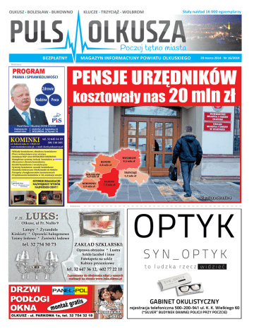 OLKUSZ BOLESŁAW BUKOWNO BEZPŁATNY PROGRAM PRAWA i SPRAWIEDLIWOŚCI Zdrowie Rodzina Praca KLUCZE TRZYCIĄŻ WOLBROM Stały nakład 16 000 egzemplarzy MAGAZYN INFORMACYJNY POWIATU OLKUSKIEGO 28 marca 2014 Nr 16/2014 PENSJE URZĘDNIKÓW kosztowały nas 20 mln zł Poseł Ziemi Olkuskiej JACEK OSUCH Zaprasza do OLKUSZ, ul. Szpitalna 32 swoich biur WOLBROM, ul. Rynek 16 KOMINKI tel. 32 645 14 19 501 510 105 ul. Rabsztyńska 67, OLKUSZ www.kominkowanie.pl, e-mail: [email protected] -Wkłady kominkowe, obudowy kominkowe -Piece wolnostojące oraz wiszące -Instalacje DGP oraz CENTRALNEGO ODKURZANIA -Kompletne systemy izolacji kominków -Akcesoria i chemia kominkowa -Kratki kominkowe i wentylacyjne -Systemy kominowe, nasady kominkowe -Kominki elektryczne i biokominki do bloków -Parapety z konglomeratów marmurowych -Projektowanie kominków w 3d, aranżacja wnętrz SZYBKIE REALIZACJE NAJWIĘKSZY WYBÓR NAJNIŻSZE CENY ! więcej na stronie 4 OPTYK GABINET OKULISTYCZNY rejestracja telefoniczna 500-200-941 ul. K. K. Wielkiego 60 (“SILVER” BUDYNEK DAWNEJ POLICJI PRZY POCZCIE) PULS OLKUSZA – bezpłatny magazyn informacyjny powiatu olkuskiego strona 2 ROSZADY KADROWE W POLICJI cd. Nowy zastępca komendanta powołany NEWSY Łukasz Kmita W ubiegłym tygodniu w auli Komendy Powiatowej Policji w Olkuszu odbyła się uroczystość, podczas której powołany został Zastępca Komendanta Powiatowego Policji w Olkuszu. Został nim, znany już olkuskim funkcjonariuszom nadkom. Jarosław Klich. TADEUSZ CHWAST Przedstawiciel powiatu olkuskiego w radzie nadzorczej Nowego Szpitala. Radni powiatu krytycznie oceniają postawę „swojego człowieka” w radzie nadzorczej Nowego Szpitala. Zdaniem części samorządowców pomimo dobrego merytorycznego przygotowania, Tadeusz Chwast jest zbyt uległy i zachowawczy w działaniu. FOTO NUMERU: ANDRZEJ FELIKSIK Znany w Olkuszu miłośnik turystyki i pasjonat historii. W ostatnim czasie odznaczony nagrodą Cordis Nobilis. Jest jednym z pomysłodawców stworzenia Kolekcji Minerałów i Skamieniałości, którą można podziwiać w olkuskim Centrum Kultury przy ul. Szpitalnej. ASFALT NA KOCHANOWSKIEGO Mieszkańcy części os. Młodych w Olkuszu przez ostatnie tygodnie mieli spore problemy z dotarciem do swoich bloków. A wszystko przez budowę obwodnicy, która dawała się we znaki kierowcom. Po deszczu – błoto, w pogodne dni – tumany kurzu tak wyglądała codzienność na ul. Kochanowskiego. Od środy sytuacja się zmieniła. Jest już długo oczekiwany asfalt. Niestety teraz kierowców czeka kolejna zmiana organizacji ruchu. Nowy zastępca komendanta dotychczas pełnił obowiązki Naczelnika Wydziału Kryminalnego. Nadkom. Klich służbę w Policji rozpoczął przed dwudziestoma trzema laty. – Przez kilka lat pracował w zespole patrolowo-interwencyjnym i dochodzeniowym w komisariacie w Kluczach. Od 1. maja 2005 roku był Zastępcą Komendanta Komisariatu Policji w Bukownie, a od 2007 roku Komendantem Komisariatu w Kluczach. Od 16. maja 2010 roku nadzorował pion kryminalny olkuskiej Policji – informuje nadkom. Agnieszka Fryben, oficer prasowy KPP w Olkuszu. Jarosław Klich jest absolwentem Akademii Ekonomicznej w Krakowie. W 2006 roku ukończył studia zawodowe w Wyższej Szkole Policji w Szczytnie. W 2011 roku został odznaczony Srebrną Odznaką „Zasłużony Policjant”. Golf i Mondeo zmiażdżone. Groźny wypadek w Dłużcu OGŁOSZENIE Komendant Klich ma 43 lata. Jest żonaty, ma dwóch synów. Zmiany kadrowe w olkuskiej Policji rozpoczęły się na początku tego roku. W lutym, dotychczasowy komendant mł. insp. Andrzej Płatek awansował na szefa krakowskiej policji. W związku z odgórną decyzją dotyczącą likwidacji jednego z dwóch etatów zastępcy komendanta, z pracą w Olkuszu musiał pożegnać się mł. insp. Radosław Bąchór. Został on przeniesiony do Komendy Wojewódzkiej Policji w Krakowie. Dotychczasowy zastępca mł. insp. Warzecha objął zaś funkcję Komendanta Powiatowego. Od połowy lutego nie wiadomo było kto będzie pomagał insp. Włodzimierzowi Warzecha w kierowaniu jednostką. W wyniku konkursu ostatecznie funkcja z-cy komendanta przypadła nadkom. Jarosławowi Klichowi. W konkursie pokonał on trzech kandydatów. Żaden z nich nie pracował w miejscowej Komendzie. Gimnazjum nr 2 im. św. Królowej Jadwigi w Olkuszu ul. S. Żeromskiego 1 tel./fax : 32 7548836 www.gim2olkusz.pl NA DRODZE Łukasz Kmita W miniony wtorek tuż po godz. 8 na drodze wojewódzkiej nr 794 w miejscowości Dłużec (gmina Wolbrom) doszło do czołowego zderzenia dwóch samochodów osobowych. Świadkowie, którzy widzieli miejsce wypadku podkreślają, że to prawdziwy cud, że nikt nie zginął. Z relacji mieszkańców wynika, że wypadek wyglądał bardzo groźnie. Oba pojazdy, uczestniczące w zdarzeniu, miały niemal doszczętnie zniszczony przód. W samochodach podróżowały łącznie cztery osoby. – W wypadku poszkodowane zostały 3 osoby: dwie z Forda i jedna z Volkswagena – informuje mł. bryg. Marcin Maciora, oficer prasowy Państwowej Straży Pożarnej w Olkuszu. Przybyli na miejsce strażacy i ratownicy medyczni udzielili pierwszej pomocy ofiarom zdarzenia. W akcji ratunkowej uczestniczyło łącznie 5 zastępów straży pożarnej – w tym trzy z Jednostki Ratowniczo-Gaśniczej z Wolbromia oraz dwie jednostki OSP Dłużec, a także trzy radiowozy policji, funkcjonariusze Straży Miejskiej z Wolbromia, trzy karetki i śmigłowiec LPR. Osobę z najcięższymi obrażeniami przetransportowano śmigłowcem do szpitala specjalistycznego w Krakowie. Pozostała dwójka rannych trafiła do szpitala w Zawierciu i Olkuszu. Poszkodowani doznali złamań kończyn, żeber oraz przegrody nosowej. Z ustaleń Policji wynika, że kobieta kierująca Fordem Mondeo na łuku drogi wpadła w poślizg i uderzyła w Volkswagena Golfa. – Na miejscu przeprowadzono oględziny z udziałem technika kryminalistyki. Policja ustala przyczyny i okoliczności tego 