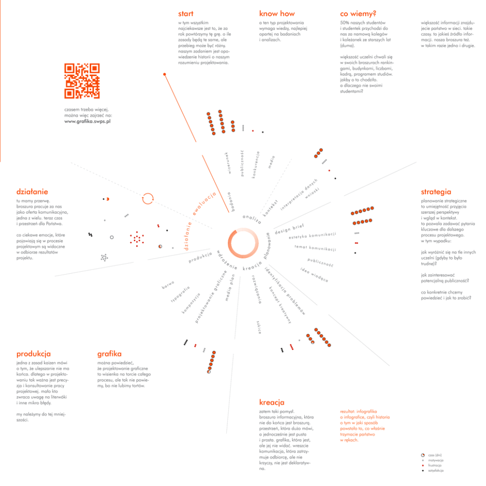 start know how co wiemy? w tym wszystkim najciekawsze jest to, że za rok powtórzymy tę grę. o ile zasady będą te same, ale przebieg może być różny. naszym zadaniem jest opowiedzenie historii o naszym rozumieniu projektowania. a ten typ projektowania wymaga wiedzy, najlepiej opartej na badaniach i analizach. 50% naszych studentów i studentek przychodzi do nas za namową kolegów i koleżanek ze starszych lat (duma). większość informacji znajdujecie państwo w sieci. takie czasy. to jakieś źródło informacji. nasza broszura też. w takim razie jedno i drugie. większość uczelni chwali się w swoich broszurach rankingami, budynkami, liczbami, kadrą, programem studiów. jakby o to chodziło. a dlaczego nie swoimi studentami? a e ia p lan zn me st ek nt ko jak zainteresować potencjalną publiczność? a co konkretnie chcemy powiedzieć i jak to zrobić? yw ów ek ąc ć m at oj od jak wyróżnić się na tle innych uczelni (gdyby to było trudne)? le re t k to med ic af gr e wi noś ji ob ni a licz ji pr ep wa planowanie strategiczne to umiejętność przyjęcia szerszej perspektywy i wgląd w kontekst. to pozwala zadawać pytania kluczowe dla dalszego procesu projektowego. w tym wypadku: a a strategia cj nc cj ki ka ny szkic pr ide fi zy pub ko m s io f ty po kre ac nia ko wn ch temat kom unikac en ia d y an omunikac estetyka k ano ni iąza ty g po f ra de brie sign id a pr ja rozw rw in r te a et a cj pl że e du a kcj ro pro ba iza wanie działanie anal wd co ciekawe emocje, które pojawiają się w procesie projektowym są widoczne w odbiorze rezultatów projektu. dia rencj b u a ew al tu mamy przerwę. broszura pracuje za nas jako oferta komunikacyjna, jedna z wielu. teraz czas i przestrzeń dla Państwa. j ac nia ada działanie konku wizer unek publiczność czasem trzeba więcej. można więc zajrzeć na: www.grafika.swps.pl e produkcja grafika jedna z zasad kaizen mówi o tym, że ulepszanie nie ma końca. dlatego w projektowaniu tak ważna jest precyzja i konsultowanie pracy projektowej. mało kto zwraca uwagę na literwóki i inne mikro błędy. można powiedzieć, że projektowanie graficzne to wisienka na torcie całego procesu, ale tak nie powiemy, bo nie lubimy tortów. my należymy do tej mniejszości. kreacja zatem taki pomysł. broszura informacyjna, która nie do końca jest broszurą. przestrzeń, która dużo mówi, a jednocześnie jest pusta i prosta. grafika, która jest, ale jej nie widać. wreszcie komunikacja, która zatrzymuje odbiorcę, ale nie krzyczy, nie jest deklaratywna. rezultat: infografika o infografice, czyli historia o tym w jaki sposób powstało to, co właśnie trzymacie państwo w rękach. czas (dni) motywacja frustracja satysfakcja