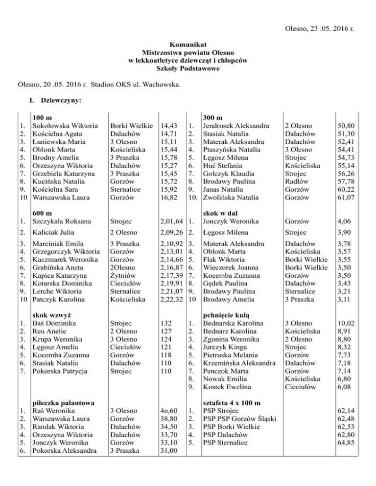 Olesno, 23 .05. 2016 r. Komunikat Mistrzostwa powiatu Olesno w lekkoatletyce dziewcząt i chłopców Szkoły Podstawowe Olesno, 20 .05. 2016 r. Stadion OKS ul. Wachowska. I. Dziewczyny: 1. 2. 3. 4. 5. 6. 7. 8. 9. 10 100 m Sokołowska Wiktoria Kościelna Agata Łuniewska Maria Oblonk Marta Brodny Amelia Orzeszyna Wiktoria Grzebiela Katarzyna Kucińska Natalia Kościelna Sara Warszawska Laura 300 m Jendrosek Aleksandra Stasiak Natalia Materak Aleksandra Ptaszyńska Natalia Łęgosz Milena Huć Stefania Golczyk Klaudia Brodawy Paulina Janas Natalia Zwolińska Natalia 2 Olesno Dalachów Dalachów 3 Olesno Strojec Kościeliska Strojec Radłów Gorzów Gorzów 50,80 51,30 52,41 54,41 54,73 55,14 56,26 57,78 60,22 61,07 2,01,64 1. skok w dal Jonczyk Weronika Gorzów 4,06 2 Olesno 2,09,26 2. Łęgosz Milena Strojec 3,90 3 Praszka Gorzów Gorzów 2Olesno Żytniów Cieciułów Sternalice Kościeliska 2,10,92 2,13,01 2,14,66 2,16,87 2,17,39 2,19,91 2,21,07 2,22,32 3. 4. 5. 6. 7. 8. 9. 10 Materak Aleksandra Oblonk Marta Flak Wiktoria Wieczorek Joanna Kocemba Zuzanna Gędek Paulina Brodawy Paulina Brodawy Amelia Dalachów Kościeliska Borki Wielkie Borki Wielkie Gorzów Dalachów Sternalice 3 Praszka 3,78 3,57 3,55 3,50 3,50 3,43 3,21 3,11 1. 2. 3. 4. 5. 6. 7. 8. 9. pchnięcie kulą Bednarska Karolina Bednarz Karolina Zgonina Weronika Jurczyk Kinga Pietruska Melania Krzemińska Aleksandra Penczok Marta Nowak Emilia Kostek Ewelina 3 Olesno Kościeliska 2 Olesno Strojec Gorzów Dalachów Gorzów Kościeliska Cieciułów 10,02 8,91 8,80 8,32 7,73 7,18 7,14 6,80 6,08 1. 2. 3. 4. 5. sztafeta 4 x 100 m PSP Strojec PSP PSP Gorzów Śląski PSP Borki Wielkie PSP Dalachów PSP Sternalice Borki Wielkie Dalachów 3 Olesno Kościeliska 3 Praszka Dalachów 3 Praszka Gorzów Sternalice Gorzów 14,43 14,71 15,11 15,44 15,78 15,27 15,45 15,72 15,92 16,82 600 m 1. Szczykała Roksana Strojec 2. Kaliciak Julia 3. 4. 5. 6. 7. 8. 9. 10 Marciniak Emila Grzegorczyk Wiktoria Kaczmarek Weronika Grabińska Aneta Kapica Katarzyna Kotarska Dominika Lerche Wiktoria Patczyk Karolina 1. 2. 3. 4. 5. 6. 7. skok wzwyż Baś Dominika Reu Anelie Krupa Weronika Łęgosz Amelia Kocemba Zuzanna Stasiak Natalia Pokorska Patrycja 1. 2. 3. 4. 5. 6. piłeczka palantowa Raś Weronika Warszawska Laura Randak Wiktoria Orzeszyna Wiktoria Jonczyk Weronika Pokorska Aleksandra Strojec 2 Olesno 3 Olesno Cieciułów Gorzów Dalachów Strojec 3 Olesno Gorzów Dalachów Dalachów Gorzów 3 Praszka 132 127 124 121 118 110 110 4o,60 38,80 34,50 33,70 33,10 31,00 1. 2. 3. 4. 5. 6. 7. 8. 9. 10. 62,14 62,48 62,53 62,80 64,85 7. Bednarz Karolina Kościeliska 8. Pawłowska Aleksandra 2 Olesno 9. Pęcherz Anna Sternalice 30,20 29,60 27,50 Klasyfikacja gmin: 1. 2. 3. 4. 5. Olesno Praszka Rudniki Gorzów Radłów 68 pkt 59 56 48 32 Klasyfikacja szkół: 1. PSP Gorzów Śląski 2. PSP Dalachów 3. PSP Strojec 4. PSP 3 Olesno 5. PSP 2 Olesno 6. PSP Borki Wielkie 7. PSP Kościeliska 8. PSP 3 Praszka 9. PSP Sternalice 10. PSP Cieciułów 11. PSP Żytniów 48 47 45 30 26 22 22 14 10 7 2 II. Chłopcy: 100 m 1. Wiśniewski Dominik 2. Koy Kamil 3. Skonieczny Maciej 4. Fabianek Oskar 5. Pigło Sebastian 6. Krakowski Maksym 7. Mapeła Bartosz 8. Podgórski Rafał 9. Sobczak Szymon 500 m Kościeliska 2 Praszka 3 Olesno Gorzów Kościeliska Gorzów 3 Praszka Dalachów 3 Olesno 12,79 13,51 13,88 14,60 14,94 14,40 15,02 15,09 15,62 1000 m 1. Flak Tobiasz 2. Szczypiński Dawid 3. Werner Piotr 4. Kwaśny Patryk 5. Nowak Krystian 6. Wengel Karol 7. Ceglarek Patryk 8. Namyślak Paweł 9. Kubacki Wiktor 10. Zaremba Szymon 1. Konieczny Maciej 2. Koj Kamil 3. Zok Patryk 4. Skonieczny Jakub 5. Grotowski Krystian 6. Furmański Przemysław 7. Pluskota Oliwier 8. Chwałek Paskal 9. Włóka Jan 2 Olesno 2 Praszka Gorzów 2 Olesno 3 Praszka Dalachów Sternalice Sternalice Dalachów 1,25,03 1,26,67 1,33,03 1,35,21 1,37,64 1,39,20 1,41,63 1,42,32 1,43,87 Cieciułów Kościeliska Gorzów Gorzów 2 Olesno 3 Praszka 3 Praszka Dalachów 3 Olesno Sternalice 4,61 4,57 4,31 4,09 4,06 4,04 4,04 4,03 3,26 3,07 skok w dal 2 Olesno 2 Praszka Strojec Gorzów Gorzów Sternalice 2 Olesno Cieciułów Żytniów Kościeliska 3,28,19 3,29,79 3,38,44 3,40,12 3,53,13 3,55,39 3,56,76 4,29,51 4,35,63 4,38,16 1. Rosak Bartosz 2. Wiśniewski Dominik 3. Fabianek Oskar 4. Zok Patryk 5. Skonieczny Maciej 6. Grotowski Krystian 7. Gania Filip 8. Kanicki Kacper 9. Sobczak Szymon 10. Wiecha Michał skok wzwyż 1. Krakowski Maksym 2. Diób Bartosz 3. Napieraj Kacper 4. Kanicki Kacper 5. Bryś Mateusz 6. Grzelak Michał 7. Janas Tomasz Kowalczyk Bartosz pchnięcie kulą Gorzów 2 Olesna Cieciułów Dalachów Wojciechów Gorzów 2 Praszka Strojec 146 140 137 134 131 120 120 000 rzut piłeczką palantową 1. Płóciennik Dawid 2. Huć Marcel 3. Bielawski Marcel 4. Furmański Przemysław 5. Sobczyk Szymon 6. Napieraj Kacper 7. Graba Bartłomiej 8. Brunsz Dawid 9. Pakuła Martin 10. Grzelak Michał 1. Rosak Bartosz 2. Huć Marcel 3. Kamski Grzegorz 4. Bryś Bartłomiej 5. Płóciennik Dawid 6. Kałuża Kacper 7. Bielawski Marcel 8. Obłąk Dominik 9. Matusiak Kamil Cieciułów Kościeliska Kościeliska Strojec 3 Olesno Gorzów 2 Praszka Wojciechów Gorzów 8,63 8,28 7,67 7,65 7,36 6,90 6,52 6,39 6,26 sztafeta 4 x 100 m 3 Olesno Kościeliska 2 Praszka Dalachów 3 Olesno Cieciułów 2 Praszka Gorzów Sternalice Gorzów 53,30 49,70 47,70 46,50 46,20 44,00 40,60 40,50 39,00 36,00 1. PSP 2 Olesno 2. PSP Kościeliska 3. PSP Dalachów 4. PSP Gorzów Śląski 5. PSP 3 Praszka 56,22 58,36 60,32 61,33 Klasyfikacja gmin: 1. 2. 3. 4. 5. Olesno Radłów Praszka Gorzów Śl. Rudniki 69 54 53 53 51 Klasyfikacja szkół: 1. PSP Gorzów Śląski 2. PSP Kościeliska 3. PSP 2 Olesno 4. PSP 2 Praszka 5. PSP Cieciułów 6. PSP Dalachów 7. PSP 3 Praszka 8. PSP Strojec 9. PSP Sternalice 10. PSP Wojciechów 11. PSP Żytniów 53 45 43 29 26 24 15 9 9 5 1 Uwaga ! Zmiana klasyfikacji gmin na miejscu 2 i 3 spowodowana jest błędem komisji skoku wzwyż, 