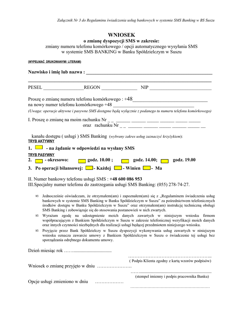 Załącznik Nr 3 do Regulaminu świadczenia usług bankowych w systemie SMS Banking w BS Suszu WNIOSEK o zmianę dyspozycji SMS w zakresie: zmiany numeru telefonu komórkowego / opcji automatycznego wysyłania SMS w systemie SMS BANKING w Banku Spółdzielczym w Suszu (WYPEŁNIAĆ DRUKOWANYMI LITERAMI) Nazwisko i imię lub nazwa : _____________________________________________________ _____________________________________________________________________________ PESEL _________________REGON _______________ NIP __________________________ Proszę o zmianę numeru telefonu komórkowego : +48___________________________ na nowy numer telefonu komórkowego +48 __________________________________ (Uwaga: operacje aktywne i pasywne SMS dostępne będą wyłącznie z podanego tu numeru telefonu komórkowego) I. Proszę o zmianę na moim rachunku Nr _ _ ______ ______ _____ ______ _____ _____ oraz rachunku Nr _ _ ______ ______ _____ ______ _____ __ kanału dostępu ( usługi ) SMS Banking (wybrany zakres usług zaznaczyć krzyżykiem): TRYB AKTYWNY 1. - na żądanie w odpowiedzi na wysłany SMS TRYB PASYWNY 2. - okresowo: godz. 10.00 ; 3. Po operacji bilansowej: - Każdej godz. 14.00; - Winien godz. 19.00 - Ma II. Numer bankowy telefonu usługi SMS : +48 600 086 953 III.Specjalny numer telefonu do zastrzegania usługi SMS Banking: (055) 278-74-27. • • • Jednocześnie oświadczam, że otrzymałem(am) i zapoznałem(am) się z „Regulaminem świadczenia usług bankowych w systemie SMS Banking w Banku Spółdzielczym w Suszu” za pośrednictwem telefonicznych środków dostępu w Banku Spółdzielczym w Suszu” oraz otrzymałem(am) instrukcję techniczną obsługi SMS Banking i zobowiązuje się do stosowania postanowień w nich zwartych. Wyrażam zgodę na udostępnienie moich danych zawartych w niniejszym wniosku firmom współpracującym z Bankiem Spółdzielczym w Suszu w zakresie telefonicznej weryfikacji moich danych oraz innych czynności niezbędnych dla realizacji usługi będącej przedmiotem niniejszego wniosku. Przyjęcie przez Bank Spółdzielczy w Suszu dyspozycji wykonywania usług zawartych w niniejszym wniosku oznacza zawarcie umowy z Bankiem Spółdzielczym w Suszu o świadczenie tej usługi bez sporządzania odrębnego dokumentu umowy. Dzień miesiąc rok ……................................ …………………………………………….. ( Podpis Klienta zgodny z kartą wzorów podpisów) Wniosek o zmianę przyjęto w dniu …………………. ……............................................................ (stempel imienny i podpis pracownika Banku) Opcje usługi zmieniono w dniu ……………… …………………………………………………… (stempel imienny i podpis pracownika Banku)
