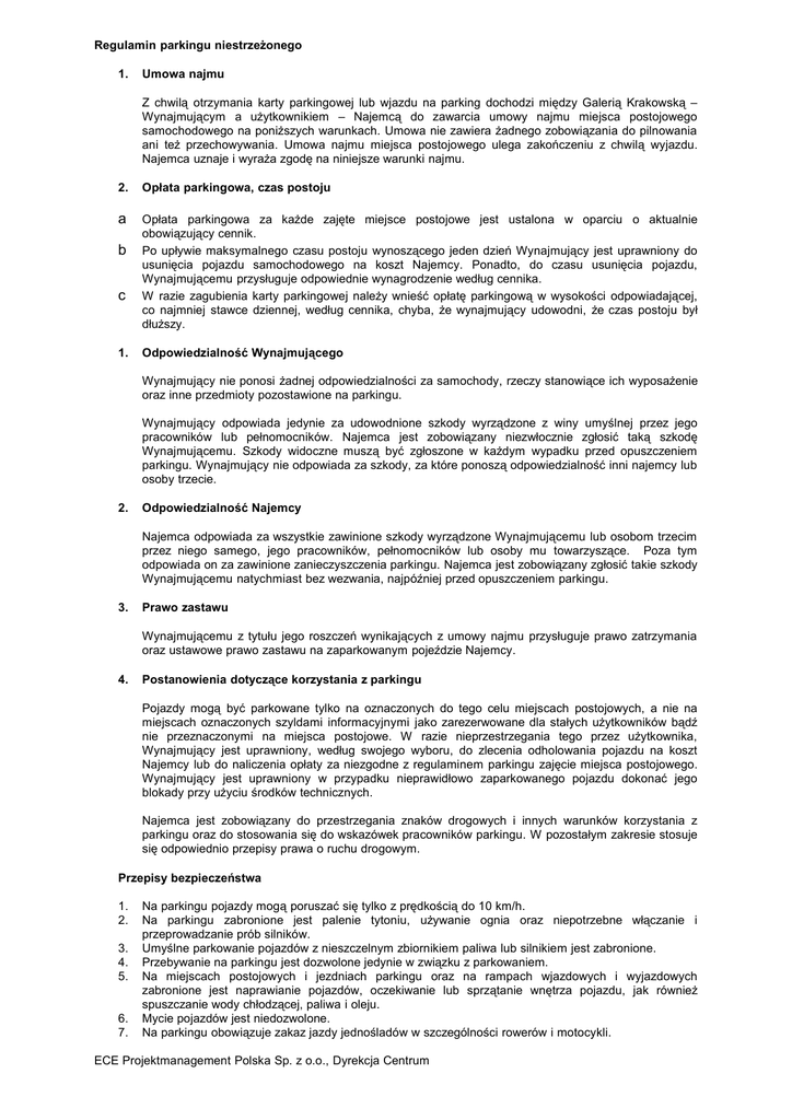 Regulamin parkingu niestrzeżonego 1. Umowa najmu Z chwilą otrzymania karty parkingowej lub wjazdu na parking dochodzi między Galerią Krakowską – Wynajmującym a użytkownikiem – Najemcą do zawarcia umowy najmu miejsca postojowego samochodowego na poniższych warunkach. Umowa nie zawiera żadnego zobowiązania do pilnowania ani też przechowywania. Umowa najmu miejsca postojowego ulega zakończeniu z chwilą wyjazdu. Najemca uznaje i wyraża zgodę na niniejsze warunki najmu. 2. Opłata parkingowa, czas postoju a Opłata parkingowa za każde zajęte miejsce postojowe jest ustalona w oparciu o aktualnie obowiązujący cennik. Po upływie maksymalnego czasu postoju wynoszącego jeden dzień Wynajmujący jest uprawniony do usunięcia pojazdu samochodowego na koszt Najemcy. Ponadto, do czasu usunięcia pojazdu, Wynajmującemu przysługuje odpowiednie wynagrodzenie według cennika. W razie zagubienia karty parkingowej należy wnieść opłatę parkingową w wysokości odpowiadającej, co najmniej stawce dziennej, według cennika, chyba, że wynajmujący udowodni, że czas postoju był dłuższy. b c 1. Odpowiedzialność Wynajmującego Wynajmujący nie ponosi żadnej odpowiedzialności za samochody, rzeczy stanowiące ich wyposażenie oraz inne przedmioty pozostawione na parkingu. Wynajmujący odpowiada jedynie za udowodnione szkody wyrządzone z winy umyślnej przez jego pracowników lub pełnomocników. Najemca jest zobowiązany niezwłocznie zgłosić taką szkodę Wynajmującemu. Szkody widoczne muszą być zgłoszone w każdym wypadku przed opuszczeniem parkingu. Wynajmujący nie odpowiada za szkody, za które ponoszą odpowiedzialność inni najemcy lub osoby trzecie. 2. Odpowiedzialność Najemcy Najemca odpowiada za wszystkie zawinione szkody wyrządzone Wynajmującemu lub osobom trzecim przez niego samego, jego pracowników, pełnomocników lub osoby mu towarzyszące. Poza tym odpowiada on za zawinione zanieczyszczenia parkingu. Najemca jest zobowiązany zgłosić takie szkody Wynajmującemu natychmiast bez wezwania, najpóźniej przed opuszczeniem parkingu. 3. Prawo zastawu Wynajmującemu z tytułu jego roszczeń wynikających z umowy najmu przysługuje prawo zatrzymania oraz ustawowe prawo zastawu na zaparkowanym pojeździe Najemcy. 4. Postanowienia dotyczące korzystania z parkingu Pojazdy mogą być parkowane tylko na oznaczonych do tego celu miejscach postojowych, a nie na miejscach oznaczonych szyldami informacyjnymi jako zarezerwowane dla stałych użytkowników bądź nie przeznaczonymi na miejsca postojowe. W razie nieprzestrzegania tego przez użytkownika, Wynajmujący jest uprawniony, według swojego wyboru, do zlecenia odholowania pojazdu na koszt Najemcy lub do naliczenia opłaty za niezgodne z regulaminem parkingu zajęcie miejsca postojowego. Wynajmujący jest uprawniony w przypadku nieprawidłowo zaparkowanego pojazdu dokonać jego blokady przy użyciu środków technicznych. Najemca jest zobowiązany do przestrzegania znaków drogowych i innych warunków korzystania z parkingu oraz do stosowania się do wskazówek pracowników parkingu. W pozostałym zakresie stosuje się odpowiednio przepisy prawa o ruchu drogowym. Przepisy bezpieczeństwa 1. 2. 3. 4. 5. 6. 7. Na parkingu pojazdy mogą poruszać się tylko z prędkością do 10 km/h. Na parkingu zabronione jest palenie tytoniu, używanie ognia oraz niepotrzebne włączanie i przeprowadzanie prób silników. Umyślne parkowanie pojazdów z nieszczelnym zbiornikiem paliwa lub silnikiem jest zabronione. Przebywanie na parkingu jest dozwolone jedynie w związku z parkowaniem. Na miejscach postojowych i jezdniach parkingu oraz na rampach wjazdowych i wyjazdowych zabronione jest naprawianie pojazdów, oczekiwanie lub sprzątanie wnętrza pojazdu, jak również spuszczanie wody chłodzącej, paliwa i oleju. Mycie pojazdów jest niedozwolone. Na parkingu obowiązuje zakaz jazdy jednośladów w szczególności rowerów i motocykli. ECE Projektmanagement Polska Sp. z o.o., Dyrekcja Centrum