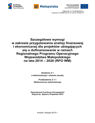 Załącznik nr 4 do Regulaminu konkursu nr RPMP.02.01.01-IZ.00-12-022/15 Szczegółowe wymogi w zakresie przygotowania analizy finansowej i ekonomicznej dla projektów ubiegających się o dofinansowanie w ramach Regionalnego Programu Operacyjnego Województwa Małopolskiego na lata 2014 – 2020 (RPO WM) Działanie 2.1 e-Administracja i otwarte zasoby Poddziałanie 2.1.1 Elektroniczna administracja Departament Funduszy Europejskich Zespół ds. Wyboru Projektów RPO Kraków, listopad 2015 r. SPIS TREŚCI: WPROWADZENIE ............................................................................................................................................. 3 SŁOWNIK STOSOWANYCH POJĘĆ ..................................................................................................................... 4 1 ANALIZA FINANSOWA ............................................................................................................................. 7 1.1 METODYKA PRZYGOTOWANIA ANALIZY FINANSOWEJ ............................................................................. 7 1.1.1 Analiza DCF...................................................................................................................................... 7 1.1.2 Ogólne wymogi dla analizy finansowej ........................................................................................... 8 1.2 UJĘCIE PODATKU VAT W ANALIZIE FINANSOWEJ ...................................................................................... 9 1.3 SPOSÓB PREZENTACJI FINANSOWYCH EFEKTÓW PROJEKTU .................................................................. 10 1.4 ELEMENTY PROJEKCJI FINANSOWYCH .................................................................................................... 12 1.4.1 Plan nakładów inwestycyjnych i odtworzeniowych ....................................................................... 12 1.4.2 Prognoza przychodów operacyjnych ............................................................................................. 13 1.4.3 Prognoza kosztów operacyjnych ................................................................................................... 14 1.4.4 Wartość rezydualna....................................................................................................................... 16 1.4.5 Kapitał obrotowy netto ................................................................................................................. 17 1.5 ZASADY DOFINANSOWANIA PROJEKTU ZE ŚRODKÓW RPO WM ............................................................ 18 1.5.1 Projekty generujące dochód po ukończeniu .................................................................................. 19 1.5.2 Projekty nie generujące dochodu po ukończeniu .......................................................................... 21 1.6 WSKAŹNIKI EFEKTYWNOŚCI FINANSOWEJ INWESTYCJI .......................................................................... 22 1.7 TRWAŁOŚĆ FINANSOWA DLA SCENARIUSZA Z PROJEKTEM .................................................................... 23 2 ANALIZA EKONOMICZNA ...................................................................................................................... 30 2.1 2.2 3 ANALIZA WIELOKRYTERIALNA ................................................................................................................. 30 ANALIZA EFEKTYWNOŚCI KOSZTOWEJ .................................................................................................... 30 ANALIZA JAKOŚCIOWA RYZYKA............................................................................................................. 32 SPIS ZAŁĄCZNIKÓW ................................................................................................................................. 32 2 WPROWADZENIE Niniejszy dokument odnosi się do projektów inwestycyjnych ubiegających się o dofinansowanie w ramach Osi/Działań wdrażanych przez IZ RPO WM, której zadania wykonuje Departament Funduszy Europejskich Urzędu Marszałkowskiego Województwa Małopolskiego. W dokumencie określono wymagania Instytucji Zarządzającej RPO WM na lata 2014 – 2020 w zakresie pożądanej formy analizy finansowej, ekonomicznej oraz ryzyka, wobec Wnioskodawców aplikujących o dofinansowanie za wyjątkiem projektów dużych1 oraz projektów hybrydowych. Zasady, w oparciu o które IZ dokonuje oceny projektów dużych oraz hybrydowych zostały określone w Wytycznych MIiR w zakresie zagadnień związanych z przygotowaniem projektów inwestycyjnych, w tym projektów generujących dochód oraz w Przewodniku do analizy kosztów i korzyści projektów inwestycyjnych (wyłącznie dla projektów dużych). Niniejszy dokument stanowi narzędzie niezbędne do przygotowania części obliczeniowej w załączniku Excel jak i części opisowej ww. analiz wymaganej w ramach e-wniosku (części M, N i O2). Sposób przygotowania wymienionych analiz podlega weryfikacji w szczególności w trakcie oceny finansowej i merytorycznej właściwej projektów składanych w ramach RPO WM na lata 2014-2020. Szczegółowe wymogi zostały opracowane na podstawie aktualnych uregulowań prawnych, krajowych oraz wspólnotowych. Dopuszczalne jest zastosowanie odmiennych rozwiązań (pod warunkiem ich uzasadnienia), jeżeli tych postulowanych w niniejszym dokumencie nie da się zastosować do danego projektu lub ich zastosowanie jest nielogiczne lub niecelowe. W przypadku braku uregulowań w danym zakresie należy skorzystać w szczególności z: 1) Rozporządzenia Parlamentu Europejskiego i Rady (UE) nr 1303/2013 z dnia 17 grudnia 2013 r, dalej Rozporządzenie nr 1303/2013; 2) Rozporządzenia delegowanego Komisji (UE) nr 480/2014 z dnia 3 marca 2014 r, dalej Rozporządzenie nr 480/2014; 3) Rozporządzenia Wykonawczego Komisji (UE) nr 2015/207 z dnia 20 stycznia 2015 r. dalej Rozporządzenie nr 2015/207; 4) Wytycznych Ministerstwa Infrastruktury i Ro