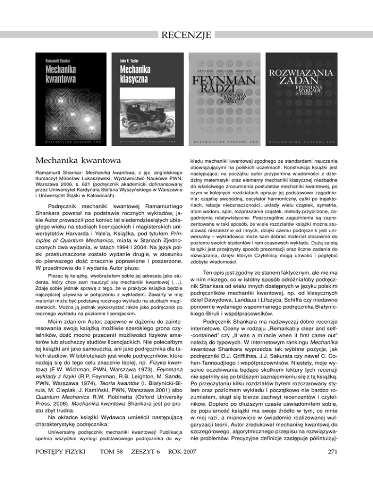 RECENZJE Mechanika kwantowa Ramamurti Shankar: Mechanika kwantowa, z jęz. angielskiego tłumaczył Mirosław Łukaszewski, Wydawnictwo Naukowe PWN, Warszawa 2006, s. 621 (podręcznik akademicki dofinansowany przez Uniwersytet Kardynała Stefana Wyszyńskiego w Warszawie i Uniwersytet Śląski w Katowicach). Podręcznik mechaniki kwantowej Ramamurtiego Shankara powstał na podstawie rocznych wykładów, jakie Autor prowadził pod koniec lat siedemdziesiątych ubiegłego wieku na studiach licencjackich i magisterskich uniwersytetów Harvarda i Yale’a. Książka, pod tytułem Principles of Quantum Mechanics, miała w Stanach Zjednoczonych dwa wydania, w latach 1994 i 2004. Na język polski przetłumaczone zostało wydanie drugie, w stosunku do pierwszego dość znacznie poprawione i poszerzone. W przedmowie do I wydania Autor pisze: Pisząc tę książkę, wyobrażałem sobie jej adresata jako studenta, który chce sam nauczyć się mechaniki kwantowej (. . .). Zdaję sobie jednak sprawę z tego, że w praktyce książka będzie najczęściej używana w połączeniu z wykładem. Zawarty w niej materiał może być podstawą rocznego wykładu na studiach magisterskich. Można ją jednak wykorzystać także jako podręcznik do rocznego wykładu na poziomie licencjackim. Moim zdaniem Autor, zapewne w dążeniu do zainteresowania swoją książką możliwie szerokiego grona czytelników, dość mocno przecenił możliwości fizyków amatorów lub słuchaczy studiów licencjackich. Nie polecałbym tej książki ani jako samouczka, ani jako podręcznika dla takich studiów. W bibliotekach jest wiele podręczników, które nadają się do tego celu znacznie lepiej, np. Fizyka kwantowa (E.W. Wichman, PWN, Warszawa 1973), Feynmana wykłady z fizyki (R.P. Feynman, R.B. Leighton, M. Sands, PWN, Warszawa 1974), Teoria kwantów (I. Białynicki-Birula, M. Cieplak, J. Kamiński, PWN, Warszawa 2001) albo Quantum Mechanics R.W. Robinetta (Oxford University Press, 2006). Mechanika kwantowa Shankara jest po prostu zbyt trudna. Na okładce książki Wydawca umieścił następującą charakterystykę podręcznika: Uniwersalny podręcznik mechaniki kwantowej! Publikacja spełnia wszystkie wymogi podstawowego podręcznika do wy- POSTĘPY FIZYKI TOM 58 ZESZYT 6 kładu mechaniki kwantowej zgodnego ze standardami nauczania obowiązującymi na polskich uczelniach. Konstrukcja książki jest następująca: na początku autor przypomina wiadomości z dziedziny matematyki oraz elementy mechaniki klasycznej niezbędne do właściwego zrozumienia postulatów mechaniki kwantowej, po czym w kolejnych rozdziałach opisuje jej podstawowe zagadnienia: cząstkę swobodną, oscylator harmoniczny, całki po trajektoriach, relacje nieoznaczoności, układy wielu cząstek, symetrie, atom wodoru, spin, rozpraszanie cząstek, metody przybliżone, zagadnienia relatywistyczne. Poszczególne zagadnienia są zaprezentowane w taki sposób, że wiele rozdziałów książki można studiować niezależnie od innych, dzięki czemu podręcznik jest uniwersalny – wykładowca może sam dobrać materiał stosownie do poziomu swoich studentów i ram czasowych wykładu. Dużą zaletą książki jest przejrzysty sposób prezentacji oraz liczne zadania do rozwiązania, dzięki którym Czytelnicy mogą utrwalić i pogłębić zdobyte wiadomości. Ten opis jest zgodny ze stanem faktycznym, ale nie ma w nim niczego, co w istotny sposób odróżniałoby podręcznik Shankara od wielu innych dostępnych w języku polskim podręczników mechaniki kwantowej, np. od klasycznych dzieł Dawydowa, Landaua i Lifszyca, Schiffa czy niedawno ponownie wydanego wspomnianego podręcznika Białynickiego-Biruli i współpracowników. Podręcznik Shankara ma nadzwyczaj dobre recenzje internetowe. Oceny w rodzaju „Remarkably clear and self-contained” czy „It was a miracle when it first came out” należą do typowych. W internetowym rankingu Mechanika kwantowa Shankara wyprzedza tak wybitne pozycje, jak podręczniki D.J. Griffithsa, J.J. Sakuraia czy nawet C. Cohen-Tannoudjiego i współpracowników. Niestety, moje wysokie oczekiwania będące skutkiem lektury tych recenzji nie spełniły się po bliższym zaznajomieniu się z tą książką. Po przeczytaniu kilku rozdziałów byłem rozczarowany stylem oraz poziomem wykładu i początkowo nie bardzo rozumiałem, skąd się bierze zachwyt recenzentów i czytelników. Dopiero po dłuższym czasie uświadomiłem sobie, że popularność książki ma swoje źródło w tym, co mnie w niej razi, a mianowicie w świadomie realizowanej wulgaryzacji teorii. Autor zredukował mechanikę kwantową do szczegółowego, algorytmicznego przepisu na rozwiązywanie problemów. Precyzyjne definicje zastępuje półintuicyj- ROK 2007 271 Recenzje nym powoływaniem się na analogie, a trudne problemy pojęciowe albo trywializuje, albo zręcznie omija. Wydaje się, że taka wulgaryzacja jest nieuniknioną ceną za zrobienie z jednej z najbardziej złożonych teorii fizycznych prostej układanki, ale moim zdaniem czytelnik, dla którego jest to pierwszy kontakt z mechaniką kwantową, powinien mieć świadomość, że ma do czynienia z opisem mocno uproszczonym. Tymczasem, w wielu przypadkach, Autor wydaje się ukrywać przed czytelnikiem te uproszczenia. Oto kilka przykładów wspomnianej przed chwilą wulgaryzacji. Są to głównie błędne lub niezręczne sformułowania i uproszczenia, których, moim zdaniem, nie powinno być w bardzo dobrym akademickim podręczniku mechaniki kwantowej: Na s. 140 czytamy: „Wszystkie te informacje można wygodnie przedstawić w postaci macierzy gęstości (będącej naprawdę operatorem, któremu w pewnej bazie odpowiada macierz) zdefiniowanej jako (. . .)”, po czym następuje wzór definiujący operator (a nie macierz) gęstości. Na s. 153–54 Autor przekonuje czytelnika o wyższości reprezentacji położeniowej nad reprezentacją pędową (reprezentacje te nazywa odpowiednio „bazą X 