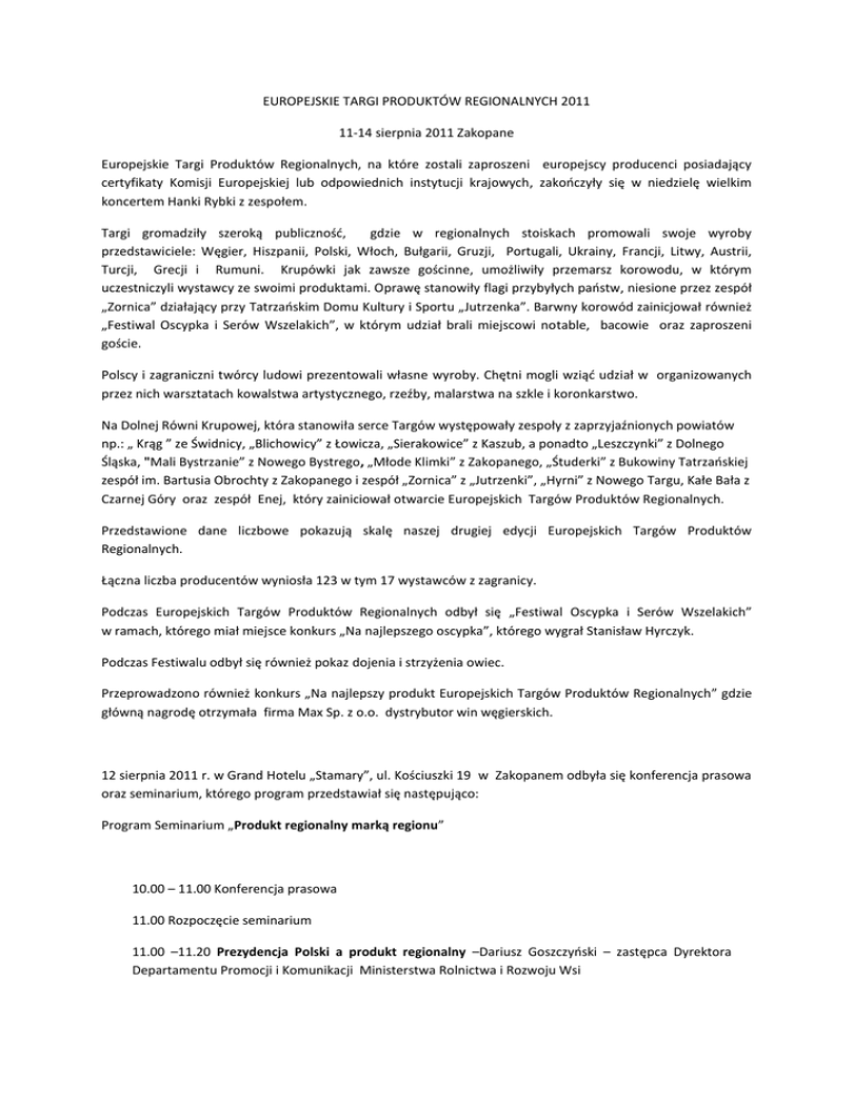 EUROPEJSKIE TARGI PRODUKTÓW REGIONALNYCH 2011 11-14 sierpnia 2011 Zakopane Europejskie Targi Produktów Regionalnych, na które zostali zaproszeni europejscy producenci posiadający certyfikaty Komisji Europejskiej lub odpowiednich instytucji krajowych, zakończyły się w niedzielę wielkim koncertem Hanki Rybki z zespołem. Targi gromadziły szeroką publiczność, gdzie w regionalnych stoiskach promowali swoje wyroby przedstawiciele: Węgier, Hiszpanii, Polski, Włoch, Bułgarii, Gruzji, Portugali, Ukrainy, Francji, Litwy, Austrii, Turcji, Grecji i Rumuni. Krupówki jak zawsze gościnne, umożliwiły przemarsz korowodu, w którym uczestniczyli wystawcy ze swoimi produktami. Oprawę stanowiły flagi przybyłych państw, niesione przez zespół „Zornica” działający przy Tatrzańskim Domu Kultury i Sportu „Jutrzenka”. Barwny korowód zainicjował również „Festiwal Oscypka i Serów Wszelakich”, w którym udział brali miejscowi notable, bacowie oraz zaproszeni goście. Polscy i zagraniczni twórcy ludowi prezentowali własne wyroby. Chętni mogli wziąć udział w organizowanych przez nich warsztatach kowalstwa artystycznego, rzeźby, malarstwa na szkle i koronkarstwo. Na Dolnej Równi Krupowej, która stanowiła serce Targów występowały zespoły z zaprzyjaźnionych powiatów np.: „ Krąg ” ze Świdnicy, „Blichowicy” z Łowicza, „Sierakowice” z Kaszub, a ponadto „Leszczynki” z Dolnego Śląska, "Mali Bystrzanie” z Nowego Bystrego, „Młode Klimki” z Zakopanego, „Śtuderki” z Bukowiny Tatrzańskiej zespół im. Bartusia Obrochty z Zakopanego i zespół „Zornica” z „Jutrzenki”, „Hyrni” z Nowego Targu, Kałe Bała z Czarnej Góry oraz zespół Enej, który zainiciował otwarcie Europejskich Targów Produktów Regionalnych. Przedstawione dane liczbowe pokazują skalę naszej drugiej edycji Europejskich Targów Produktów Regionalnych. Łączna liczba producentów wyniosła 123 w tym 17 wystawców z zagranicy. Podczas Europejskich Targów Produktów Regionalnych odbył się „Festiwal Oscypka i Serów Wszelakich” w ramach, którego miał miejsce konkurs „Na najlepszego oscypka”, którego wygrał Stanisław Hyrczyk. Podczas Festiwalu odbył się również pokaz dojenia i strzyżenia owiec. Przeprowadzono również konkurs „Na najlepszy produkt Europejskich Targów Produktów Regionalnych” gdzie główną nagrodę otrzymała firma Max Sp. z o.o. dystrybutor win węgierskich. 12 sierpnia 2011 r. w Grand Hotelu „Stamary”, ul. Kościuszki 19 w Zakopanem odbyła się konferencja prasowa oraz seminarium, którego program przedstawiał się następująco: Program Seminarium „Produkt regionalny marką regionu” 10.00 – 11.00 Konferencja prasowa 11.00 Rozpoczęcie seminarium 11.00 –11.20 Prezydencja Polski a produkt regionalny –Dariusz Goszczyński – zastępca Dyrektora Departamentu Promocji i Komunikacji Ministerstwa Rolnictwa i Rozwoju Wsi 11.20 –11.40 Certyfikacja produktów i jej znaczenie – Wojciech Kozak Wicemarszałek Województwa Małopolskiego 11.40 – 12.10 Przerwa kawowa 12.10 – 12.30 Produkty tradycyjne na mapie Polski – Dr Edyta Molik – pracownik naukowy Uniwersytetu Rolniczego w Krakowie 12.30 – 13.00 Produkt regionalny a tożsamość narodowa – Joanna Mucha Międzynarodowy projekt, Fundacja Intercoop, Hiszpania. 13.00 –13.20 Produkt Regionalny jako forma rozwoju turystyki – Avelio Marini, przedstawiciel włoskiej sieci obszarów wiejskich ISMEA z MIPAAF (Ministerstwo Rolnictwa) 13.20 – 13.40 Lokalny produkt regionalny promocją regionu Bayonne- Marie-Hélène Chabaud-Nadin Delegat ds. Partnerstwa i Współpracy Międzynarodowej , Francja. 13.40 – 14.00 Produkt Regionalny Transylwanii - Gabriel Paraschiv – prezydent Slow Ford Brasov Convivium, Rumunia, Maria Kohut, Piotr Kohut, Józef Michałek, Zbigniew Kopeć. 14.00 Dyskusja Tatrzańska Agencja jako główny organizator pragnie serdecznie podziękować wszystkim za udział i za współpracę. Wszystkim sponsorom, partnerom, współorganizatorom, wystawcom i gościom dziękujemy za okazaną pomoc, wsparcie, a przede wszystkim za udział w drugiej edycji Europejskich Targów Produktów Regionalnych.