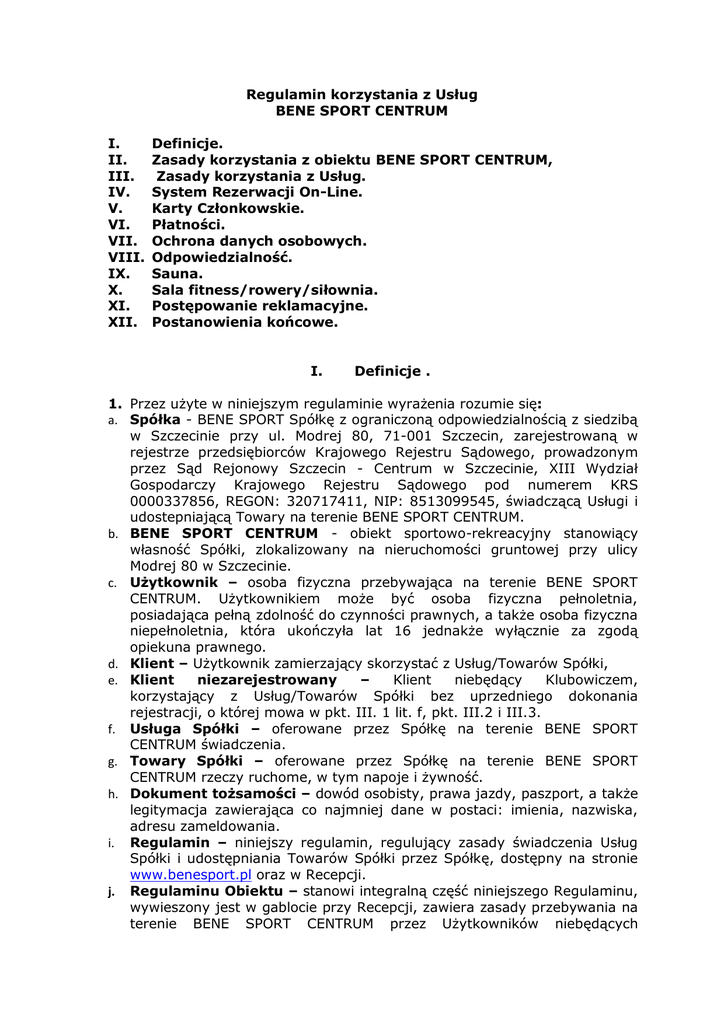 Regulamin korzystania z Usług BENE SPORT CENTRUM I. II. III. IV. V. VI. VII. VIII. IX. X. XI. XII. Definicje. Zasady korzystania z obiektu BENE SPORT CENTRUM, Zasady korzystania z Usług. System Rezerwacji On-Line. Karty Członkowskie. Płatności. Ochrona danych osobowych. Odpowiedzialność. Sauna. Sala fitness/rowery/siłownia. Postępowanie reklamacyjne. Postanowienia końcowe. I. Definicje . 1. Przez użyte w niniejszym regulaminie wyrażenia rozumie się: a. Spółka - BENE SPORT Spółkę z ograniczoną odpowiedzialnością z siedzibą w Szczecinie przy ul. Modrej 80, 71-001 Szczecin, zarejestrowaną w rejestrze przedsiębiorców Krajowego Rejestru Sądowego, prowadzonym przez Sąd Rejonowy Szczecin - Centrum w Szczecinie, XIII Wydział Gospodarczy Krajowego Rejestru Sądowego pod numerem KRS 0000337856, REGON: 320717411, NIP: 8513099545, świadczącą Usługi i udostepniającą Towary na terenie BENE SPORT CENTRUM. b. BENE SPORT CENTRUM - obiekt sportowo-rekreacyjny stanowiący własność Spółki, zlokalizowany na nieruchomości gruntowej przy ulicy Modrej 80 w Szczecinie. c. Użytkownik – osoba fizyczna przebywająca na terenie BENE SPORT CENTRUM. Użytkownikiem może być osoba fizyczna pełnoletnia, posiadająca pełną zdolność do czynności prawnych, a także osoba fizyczna niepełnoletnia, która ukończyła lat 16 jednakże wyłącznie za zgodą opiekuna prawnego. d. Klient – Użytkownik zamierzający skorzystać z Usług/Towarów Spółki, e. Klient niezarejestrowany – Klient niebędący Klubowiczem, korzystający z Usług/Towarów Spółki bez uprzedniego dokonania rejestracji, o której mowa w pkt. III. 1 lit. f, pkt. III.2 i III.3. f. Usługa Spółki – oferowane przez Spółkę na terenie BENE SPORT CENTRUM świadczenia. g. Towary Spółki – oferowane przez Spółkę na terenie BENE SPORT CENTRUM rzeczy ruchome, w tym napoje i żywność. h. Dokument tożsamości – dowód osobisty, prawa jazdy, paszport, a także legitymacja zawierająca co najmniej dane w postaci: imienia, nazwiska, adresu zameldowania. i. Regulamin – niniejszy regulamin, regulujący zasady świadczenia Usług Spółki i udostępniania Towarów Spółki przez Spółkę, dostępny na stronie www.benesport.pl oraz w Recepcji. j. Regulaminu Obiektu – stanowi integralną część niniejszego Regulaminu, wywieszony jest w gablocie przy Recepcji, zawiera zasady przebywania na terenie BENE SPORT CENTRUM przez Użytkowników niebędących k. l. m. n. o. p. q. r. s. t. u. Klientami, Klientami niezarejestrowanymi lub Klubowiczami, a także zasady korzystania z Usług/Towarów Spółki przez Klientów niezarejestrowanych. Trener/ Instruktor – osoba fizyczna działająca w imieniu i na rzecz Spółki, na podstawie zawartej ze Spółką umowy, prowadząca zajęcia/ćwiczenia na terenie BENE SPORT CENTRUM. Kontrahent - osoba fizyczna, osoba prawna, jednostka organizacyjna której ustawa przyznaje zdolność prawną, którego Klientom albo Pracownikom Spółka świadczy Usługi Spółki i udostępnia Towary Spółki na podstawie zawartej z Kontrahentem umowy. Klient/Pracownik Kontrahenta – osoba fizyczna korzystająca z Usług/Towarów Spółki na podstawie umowy z Kontrahentem. Klubowicz - Klient, który dokonał rejestracji, o której mowa w pkt. III. 1 lit. e, pkt. III.2 i pkt. III.3. Podmiot trzeci - osoba fizyczna, osoba prawna, jednostka organizacyjna której ustawa przyznaje zdolność prawną - niebędąca Spółką. Karta członkowska – dokument wydawany Klubowiczowi, potwierdzający status Klubowicza. Formularz rejestracyjny – formularz dostępny w wersji papierowej w Recepcji albo w wersji elektronicznej na stronie www.benesport.pl, za pomocą którego Klient dokonuje rejestracji. Recepcja – wyznaczone na terenie BENE SPORT CENTRUM miejsce, oznaczone napisem „Recepcja”. Przedmioty - rzeczy ruchome, w tym gotówka i dokumenty. Przedmioty wartościowe – Przedmioty o wartości co najmniej 500 (pięćset) złotych, gotówka w kwocie co najmniej 500 (pięćset) złotych, a nadto biżuteria, telefony komórkowe, smartfony, tablety, laptopy, zegarki bez względu na ich wartość, z wyłączeniem Przedmiotów sportowych. Przedmioty sportowe – Przedmioty w postaci sprzętu i ubioru sportowego konieczne do wzięcia udziału w treningu/zajęciach/ćwiczeniach, odbywających się na terenie BENE SPORT CENTRUM - w związku z którymi Klient, Klient niezarejestrowany, Klubowicz przebywa na terenie BENE SPORT CENTRUM. II. Zasady korzystania z obiektu BENE SPORT CENTRUM. 1. Warunkiem przebywania na terenie BENE SPORT CENTRUM jest zapoznanie się z treścią Regulaminu Obiektu. 2. Każdy Użytkownik jest zobowiązany do przestrzegania Regulaminu, w tym Regulaminu Obiektu. 3. Każdy Użytkownik jest zobowiązany do korzystania ze sprzętu i urządzeń, dostępnych na terenie BENE SPORT CENTRUM - zgodnie z ich przeznaczeniem, a także instrukcjami umieszczonymi na terenie BENE SPORT CENTRUM oraz zaleceniami Instruktorów/ Trenerów. 4. Na hali głównej, kortach oraz salach fitness można przebywać wyłącznie w czystym obuwiu na jasnej lub kauczukowej podeszwie, które uniemożliwia pozostawianie śladów na podłodze. 5. Użytkownik zobowiązany jest do zachowania czystości na terenie BENE SPORT CENTRUM, w tym wyrzucania śmieci do przeznaczonych do tego pojemników. 6. Na terenie BENE SPORT CENTRUM obowiązuje zakaz: a. wnoszenia napojów alkoholowych oraz piwa, b. spożywania napojów alkoholowych oraz piwa, poza miejscami wyznaczonymi na ich spożywanie , c. wnoszenia i korzystania ze środków odurzających, d. palenia wyrobów tytoniowych poza miejscami wyznaczonymi na zewnątrz budynku, e. wprowadzania zwierząt, f. powodowania sytuacji zagrażających bezpieczeństwu, w tym życiu i zdrowiu innych osób, g. handlu i akwizycji przez Podmioty trzecie bez zgody Spółki, h. dystrybucji oraz umieszczania materiałów promocyjnych i reklamowych Podmiotów trzecich bez zgody Spó