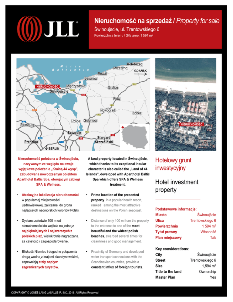 Nieruchomość na sprzedaż / Property for sale Świnoujscie, ul. Trentowskiego 6 Powierzchnia terenu / Site area: 1 594 m2 B Kołobrzeg Mrzeżyno M o r z e a ł t y c k i e GDAŃSK Rewal Dziwnów Międzyzdroje NIERUCHOMOŚĆ Świnoujście E28 Gryfice E65 S3 Płoty E28 Nowograd 109 Łobez E28 Police Goleniów 20 Strasburg NIERUCHOMOŚĆ 20 Szczecin 20 E28 20 Stargard Szczeciński A6 Prenzlau 11 10 BERLIN Nieruchomość położona w Świnoujściu, nazywanym ze względu na swoje wyjątkowe położenie „Krainą 44 wysp”, zabudowana nowoczesnym obiektem Aparthotel Baltic Spa, oferujacym zabiegi SPA & Welness. 10 A land property located in Świnoujście, which thanks to its exeptional insular character is also called the „Land of 44 Islands”, developed with Aparthotel Baltic Spa which offers SPA & Welness treatment. Atrakcyjna lokalizacja nieruchomości w popularnej miejscowości uzdrowiskowej, zaliczanej do grona najlepszych nadmorskich kurortów Polski. • • Dystans zaledwie 100 m od nieruchomości do wejścia na jedną z najpiękniejszych i najszerszych z polskich plaż, wielokrotnie nagradzaną za czystość i zagospodarowanie. • Distance of only 100 m from the property to the entrance to one of the most beautiful and the widest polish beaches, awarded several times for cleanliness and good management. • Bliskość Niemiec i dogodne połączenia drogą wodną z krajami skandynawskimi, zapewniają stały napływ zagranicznych turystów. • Proximity of Germany and developed water transport connections with the Scandinavian countries, provide a constant influx of foreign tourists. • Prime location of the presented property in a popular health resort, ranked among the most attractive destinations on the Polish seacoast. COPYRIGHT © JONES LANG LASALLE IP, INC. 2016. All Rights Reserved Hotelowy grunt inwestycyjny Hotel investment property Podstawowe informacje: Miasto Świnoujście Ulica Trentowskiego 6 Powierzchnia 1 594 m2 Tytuł prawny Własność Plan miejscowy Tak Key considerations: City Świnoujście Street Trentowskiego 6 Size 1,594 m2 Title to the land Ownership Master Plan Yes Istniejąca zabudowa Rodzaj zabudowy: Existing development Aparthotel Baltic Spa Zakończenie budowy: 2010 Powierzchnia całkowita budynku : 2 Powierzchnia użytkowa budynku: Powierzchnia użytkowa apartamentów: Aparthotel Baltic Spa Completion of the project: 2010 Total building area: 2,339.55 m2 1 921,50 m2 Total usable area of the building: 1,921.50 m2 1 498,13 m2 Total usable area of the apartments: 1,498.13 m2 Ilość kondygnacji naziemnych: 5 Number of levels above the ground: 5 Ilość kondygnacji podziemnych: 1 Number of levels below the ground: 1 Ilość apartamentów: 339,55 m2 Development type: 45 Number of apartments: 45 Restauracja: Strefa SPA&Welness: Restaurant: Winda: Ilość naziemnych miejsc parkingowych: 16 Elevator: Number of parking places above the ground: 16 Ilość podziemnych miejsc parkingowych: 4 Number of parking places below the ground: 4 SPA & Welness: Właściciel nieruchomości zawarł umowę z Dzierżawcą, który świadczy na nieruchomości usługi hotelowo-pensjonatowe, w szczególności zakwaterowania turystycznego oraz rekreacyjnego. W ramach umowy dzierżawy, Dzierżawca opłaca czynsz, opłaty eksploatacyjne oraz podatek od towarów i usług (VAT). Nieruchomość / Property The Owner of the property concluded a lease agreement with the Lessee. The Lessee render hotel and guesthouse accommodation, in particular tourist and recreational accommodation. Under the lease agreement, the Lessee pays a rent, service payments and VAT. Nieruchomość / Property Granice działki/ Plot’s borders Lokalizacja nieruchomości / Property location Kontakt / Contact Daniel Puchalski +48 607 606 660 [email protected] Joanna Kieszczyńska +48 660 664 704 [email protected] MISREPRESENTATION ACT | COPYRIGHT | DISCLAIMER Jones Lang LaSalle, for themselves and for the vendors of this property, whose agents they are, give notice that (1) the particulars and any further information communicated by any means to potential purchasers of the property described in the particulars, or their advisers, in connection with the possible sale of the property are provided solely for the purpose of assisting potential purchasers in decided whether they wish to proceed with further investigation of the property and do not constitute either the whole or any part of an invitation, offer or contract for sale of the property; (ii) all descriptions, dimensions, references to condition and necessary permissions for use and occupation and other details are given in good faith and are believed to be correct as at the date of the particulars (or the date of the relevant information if earlier). However, potential purchasers are not entitled to rely on them as statements or representations of fact but should satisfy themselves by searches, enquiries, surveys and inspections or otherwise with regard to the accuracy of such details. No responsibility or liability is or will be accepted by Jones Lang LaSalle, the vendor(s) of the property or any of their respective subsidiaries, affiliates, directors, officers, representatives, employees, advisors, or agents for any loss or damage suffered by any party, resulting from reliance on the particulars or any other information communicated by any means to that party, or its advisers, in connection with the possible sale of the property. No person in the employment of Jones Lang LaSalle or the vendor(s) has authority to make or give any representation or warranty, express or implied, in relation to the property. References to Jones Lang LaSalle include any joint agents acting with Jones Lang LaSalle. COPYRIGHT © JONES LANG LASALLE IP, INC. 2016. All Rights Reserved